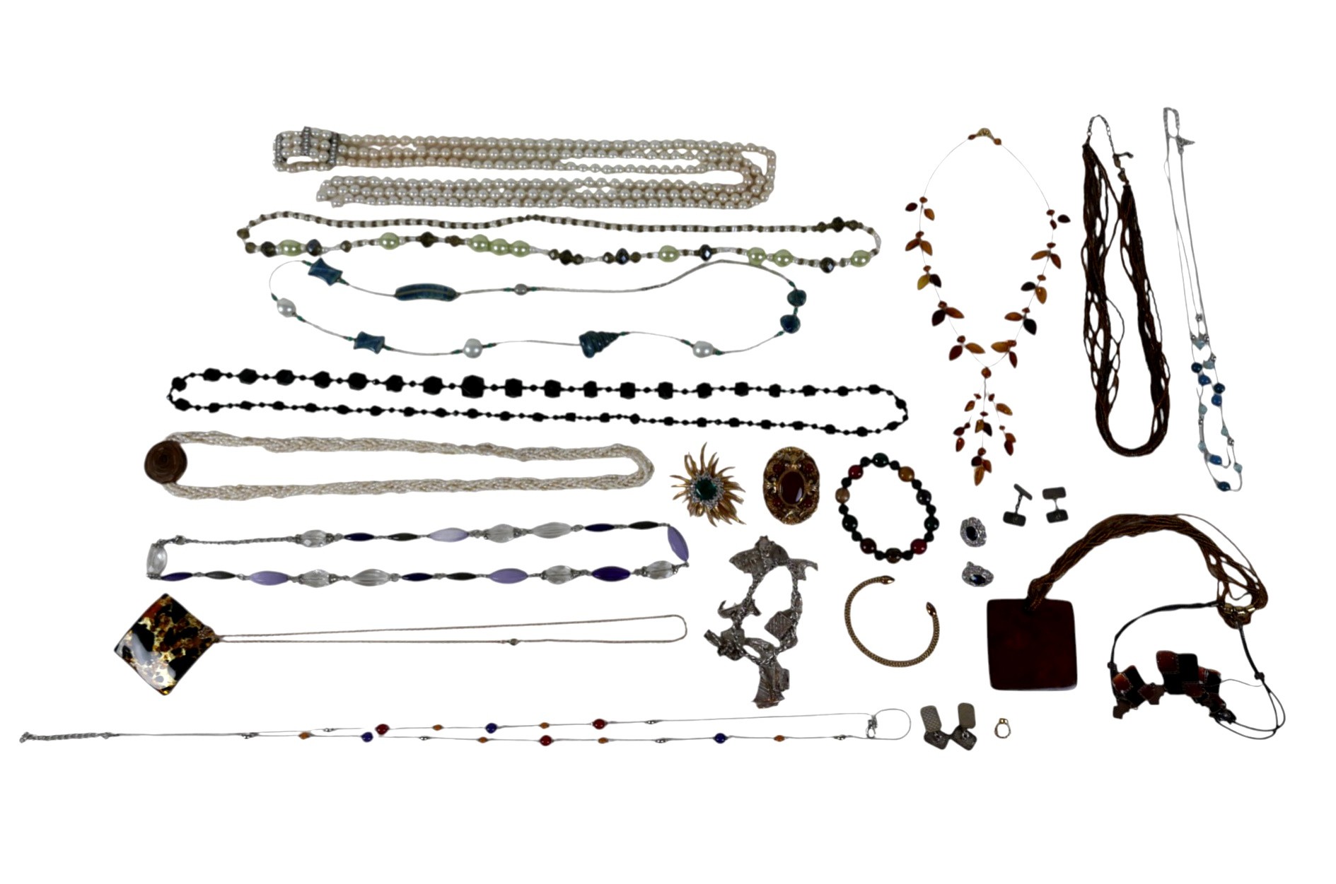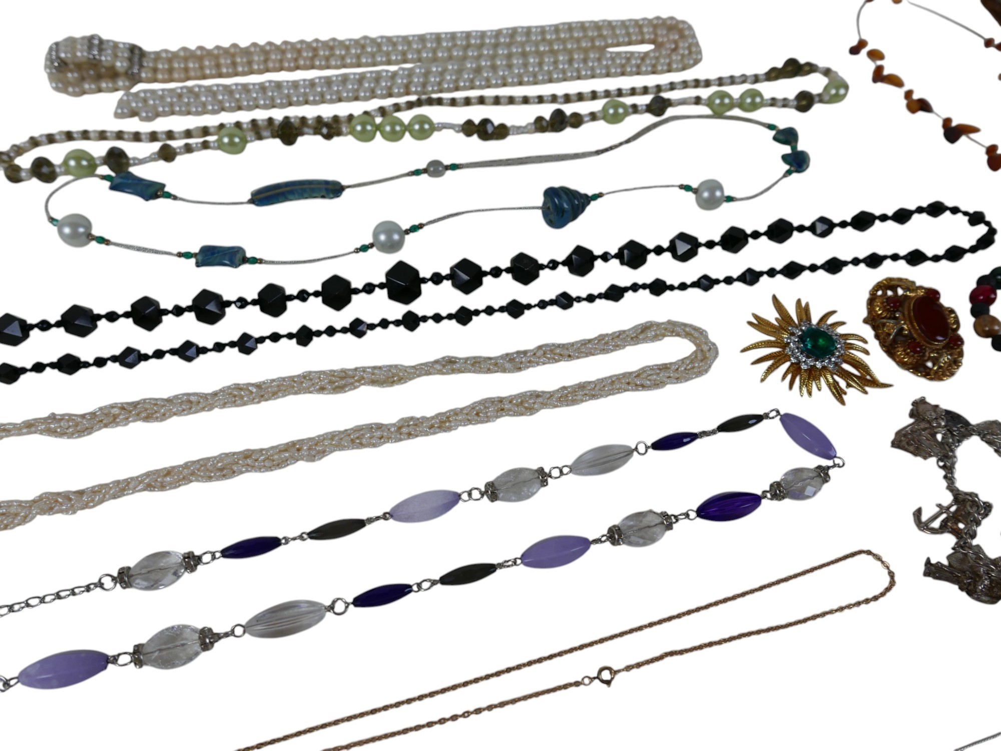 A group of costume jewellery, including a square resin pendant, with abstract black, gold and amber design, 5 by 5cm, on a yellow metal chain, indistinctly marked, 6.0g, 60cm long, a small pendant set with an opal, a silver charm bracelet, fitted with stork, owl, Paddington bear, Royal coach, ship, anchor, book, Herm Island shield, Asian figure, and heart shaped padlock clasp, 52.4g, two pairs of silver cufflinks, a faux pearl necklace, seed pearl necklace, an amber 'leaf' necklace, a gold plated brooch with large emerald style glass 'stone' surrounded by paste stones, and pointed leaves, 6.8cm across, a pair of clip earrings, and various other necklaces. (1 bag)