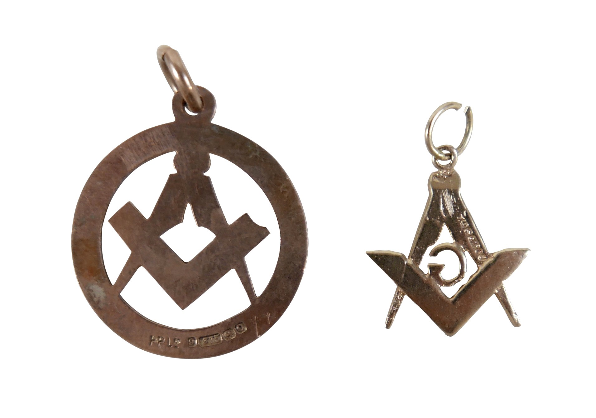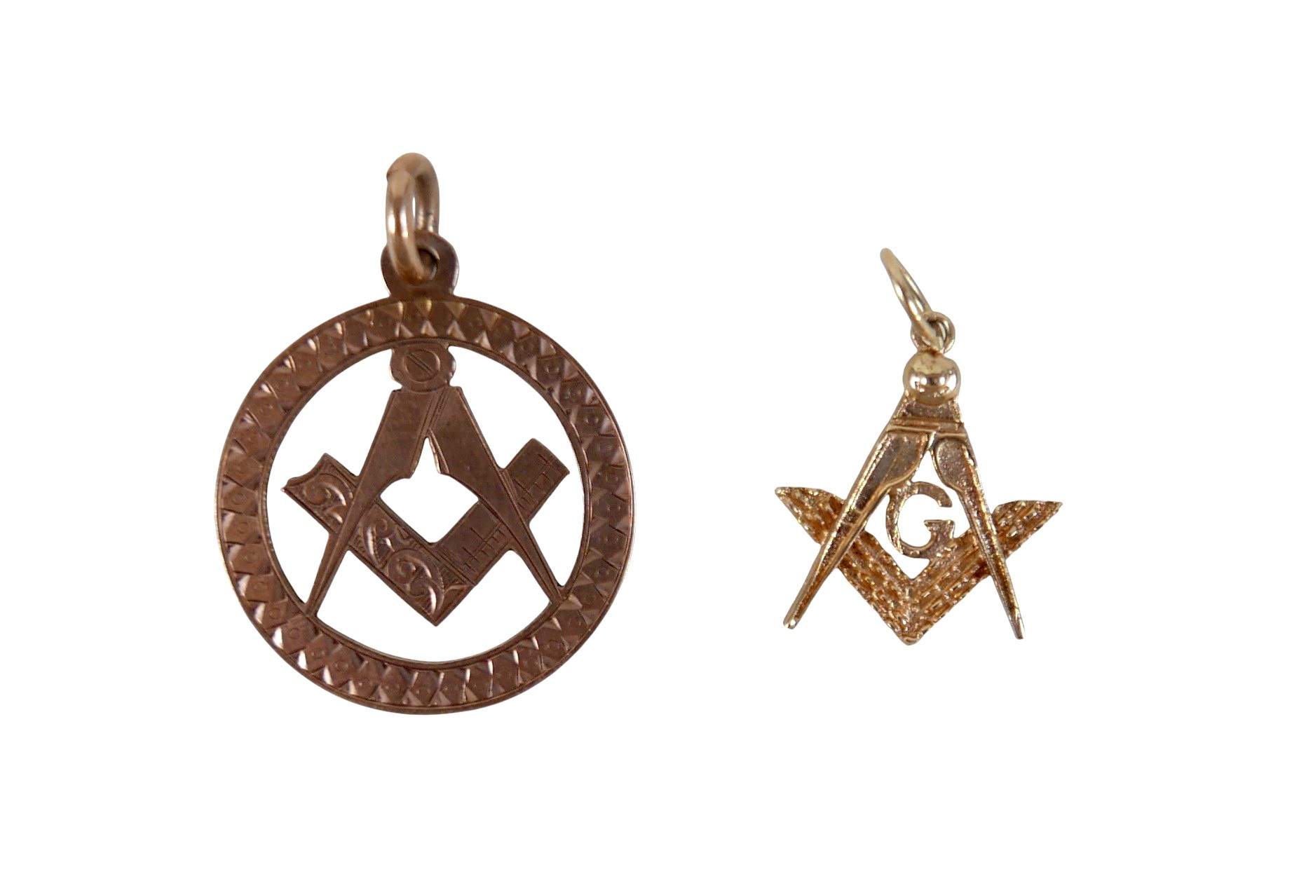 Two 9ct yellow gold masonic fob charms largest 34mm diameter, total weight 4.9g. (2)