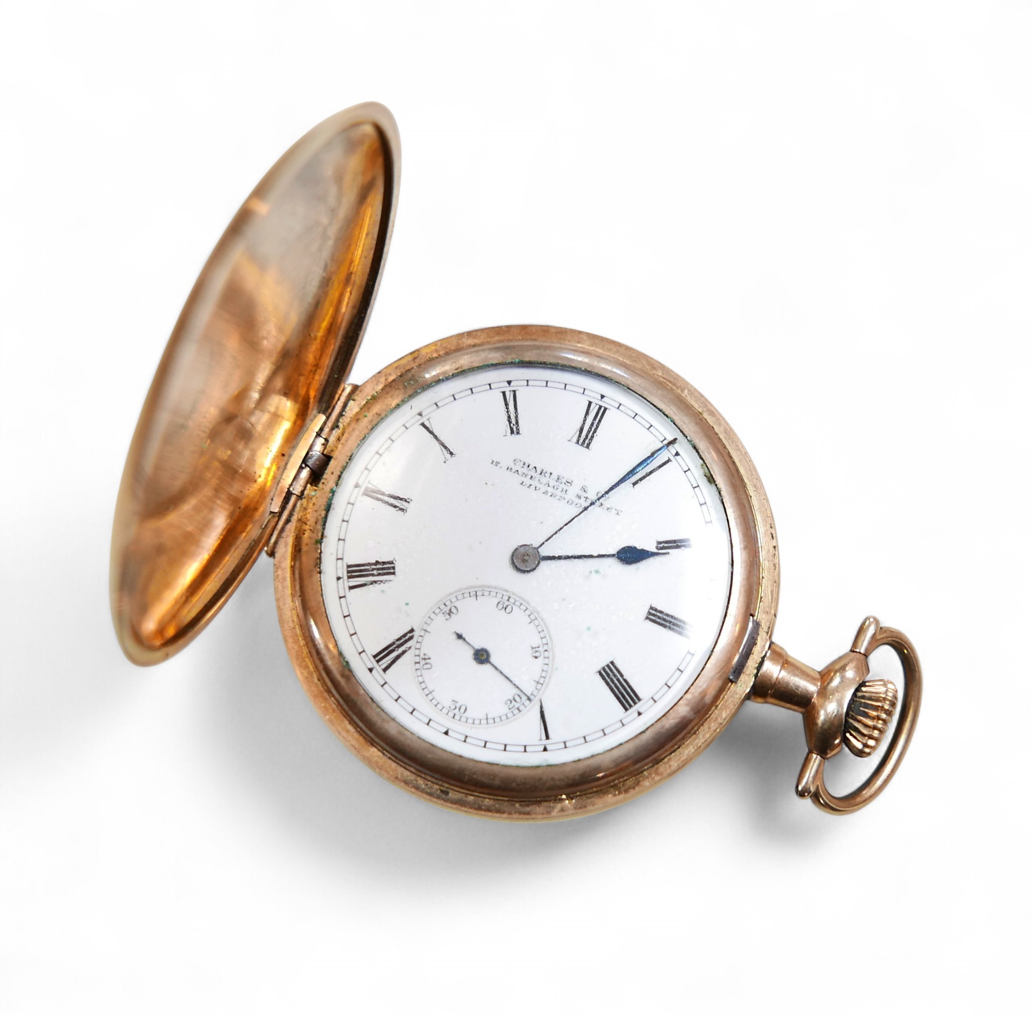 A gold plated Elgin full hunter pocket watch roman numeral dial with secondary dial key less wind 15 jewel movement no 17690756, 46mm case, running.