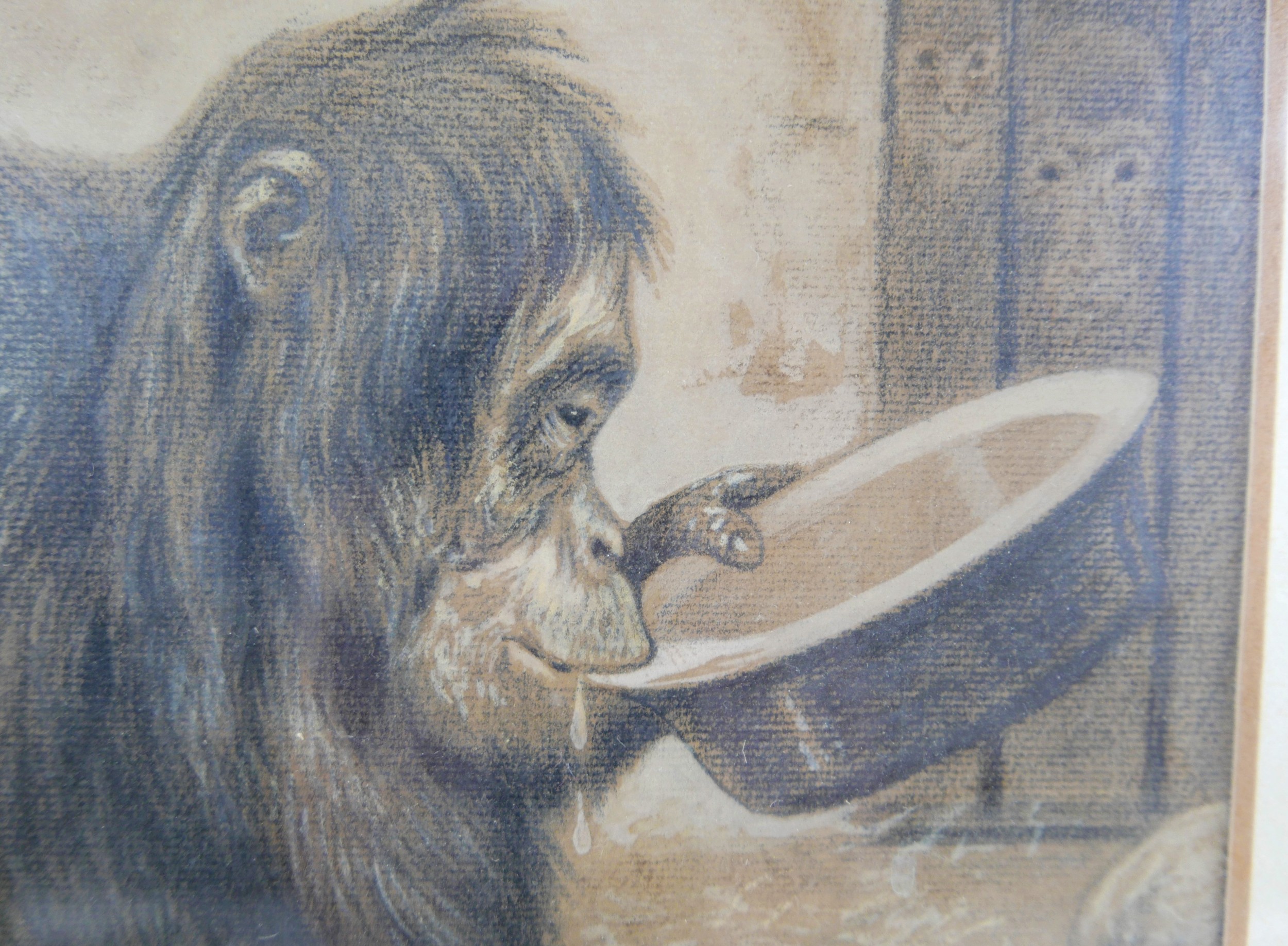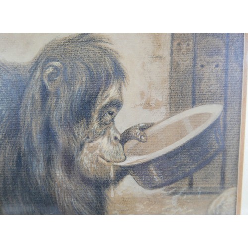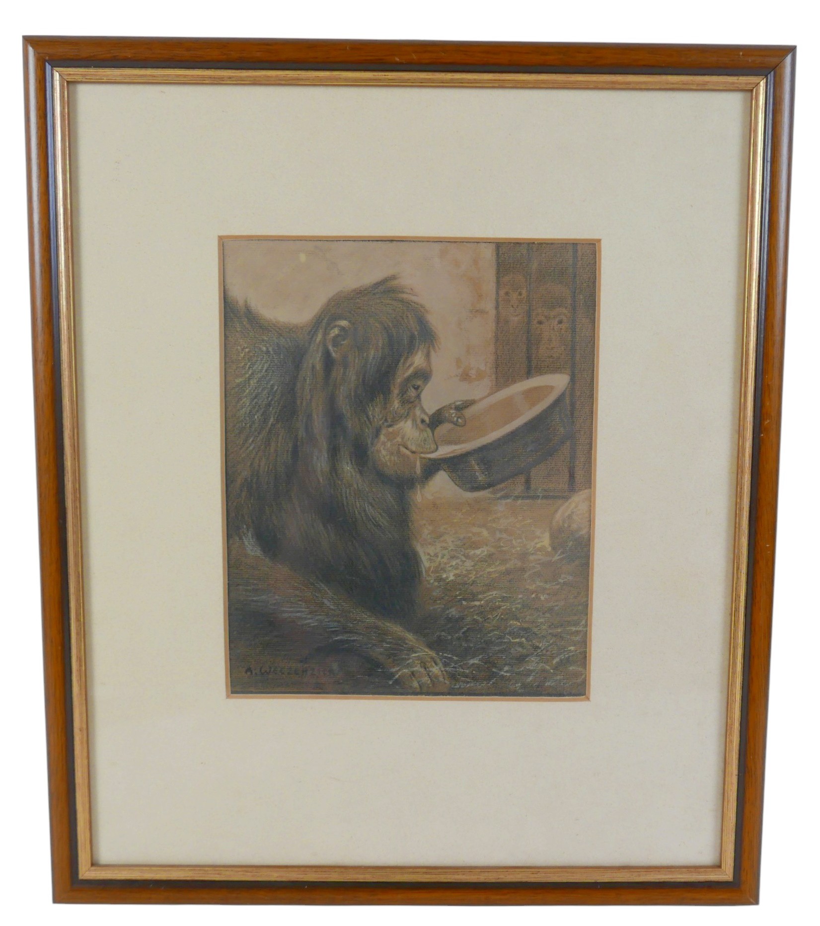 A highlighted sketch of an orangutan signed A.WELZERZIER ?, show size 20 by 25cm, frame size 40 by 3 by 47cm.