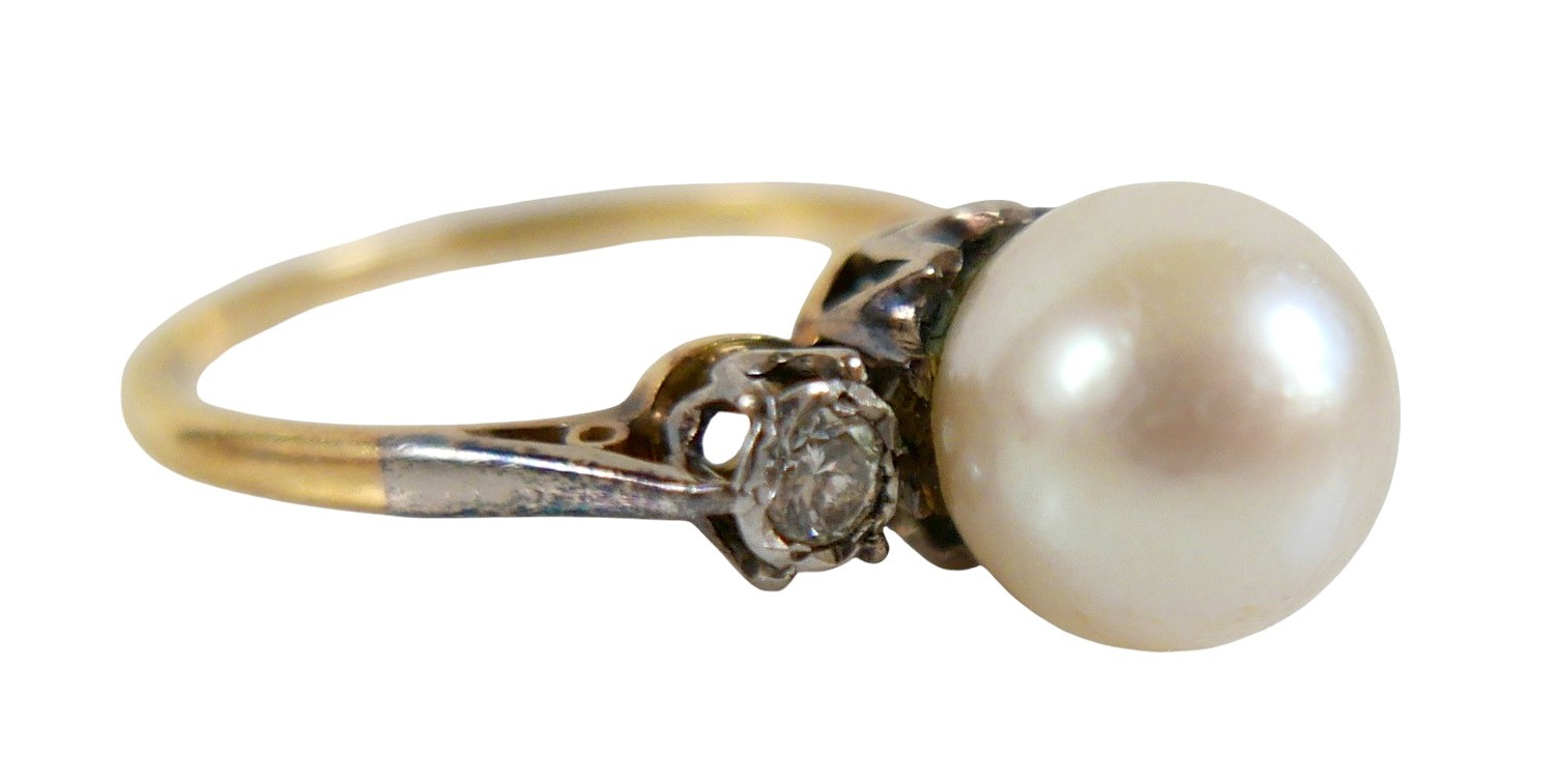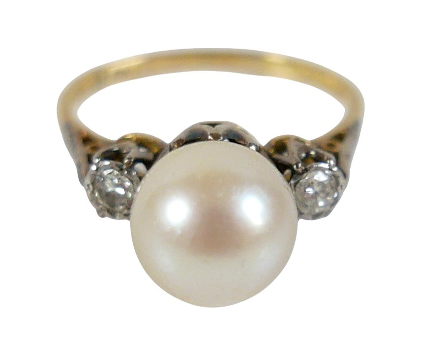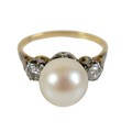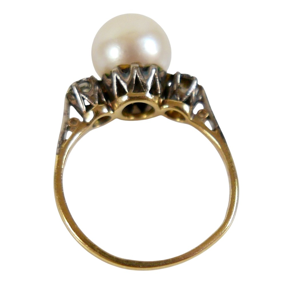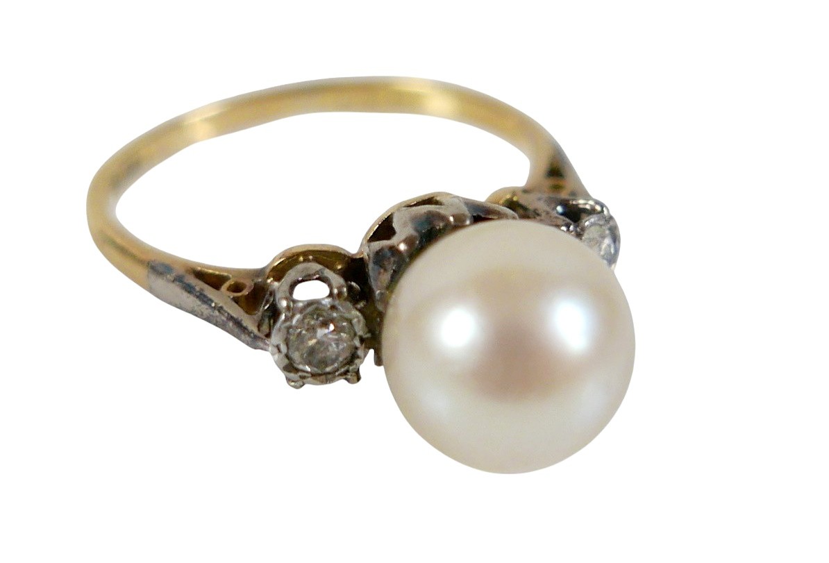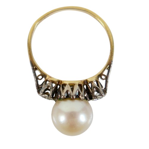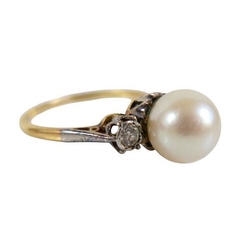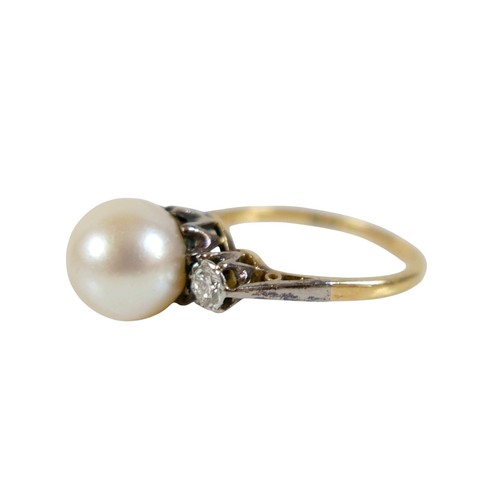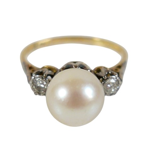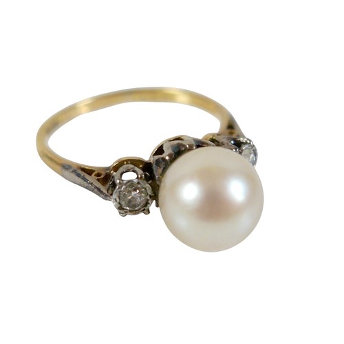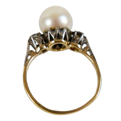 An 18ct yellow gold and platinum pearl and diamond ring the 8mm diameter pearl flanked by two small diamonds, ring size L, 3.5g.