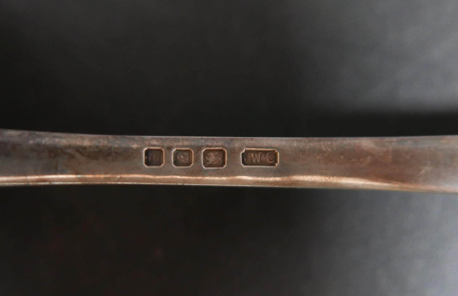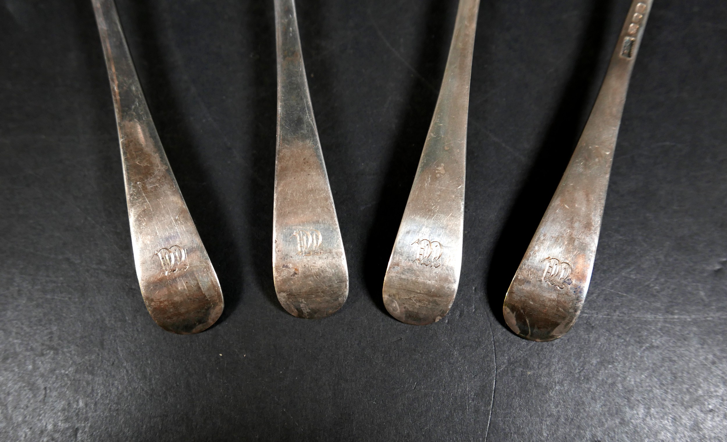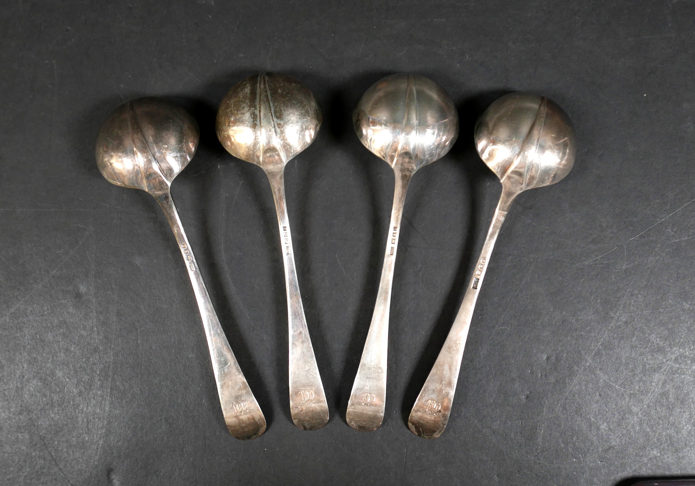 A set of four George VI silver sauce ladles, rat tail pattern, terminal engraved with a monogram, three Josiah Williams & Co, London 1940, and one Brook & Son, London 1940, 18.5cm long, 10.6toz. (4)