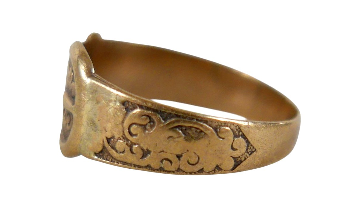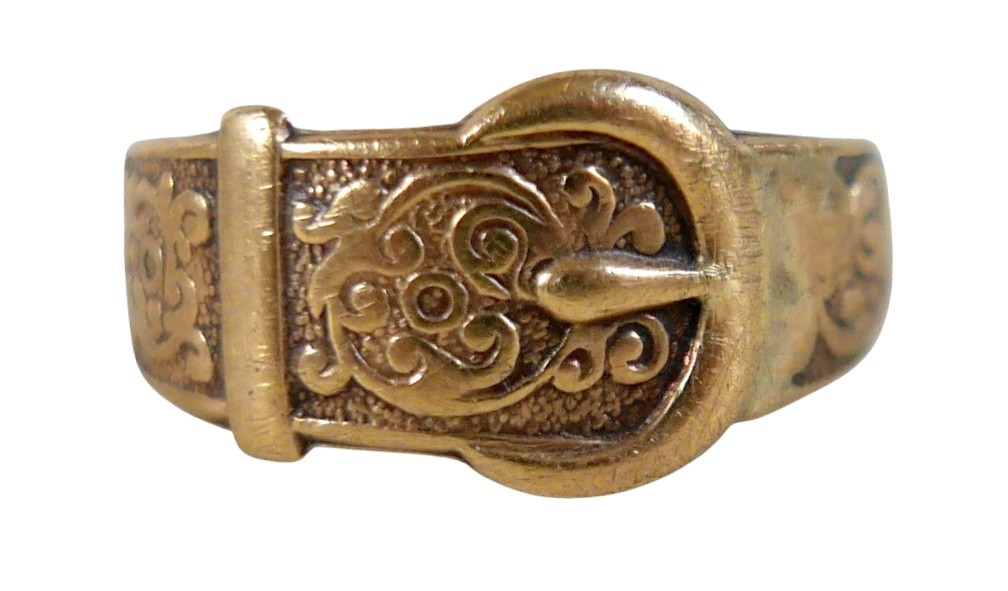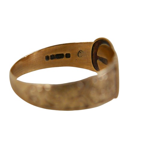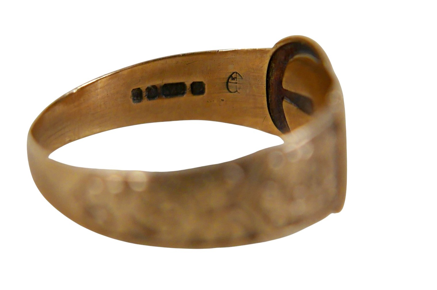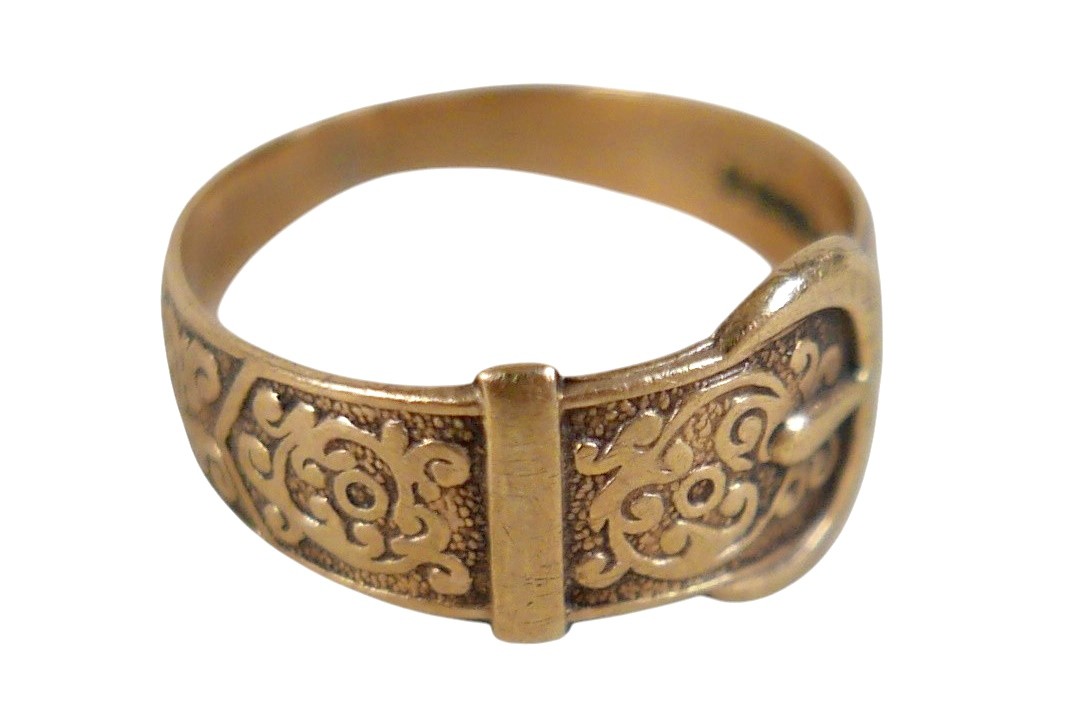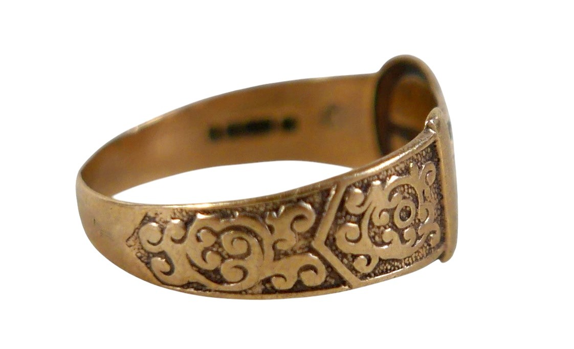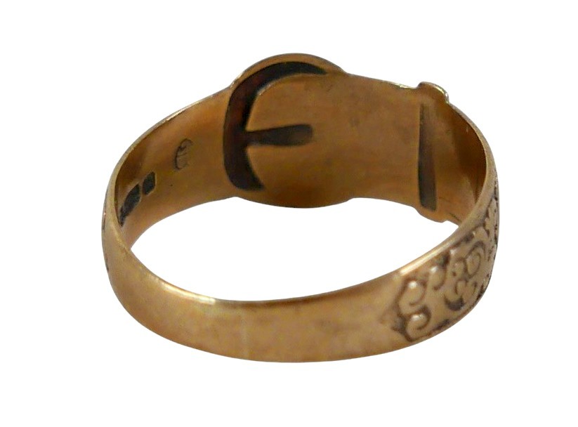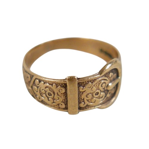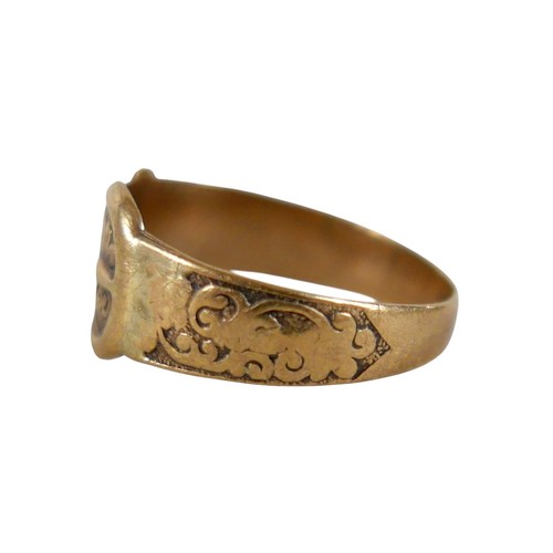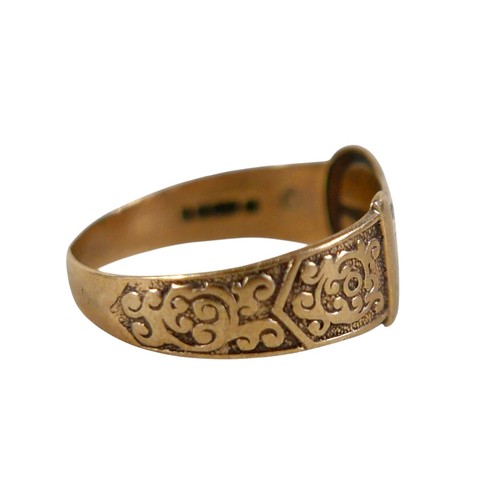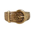 A 9ct yellow gold ring in the form of a belt with engraved d...