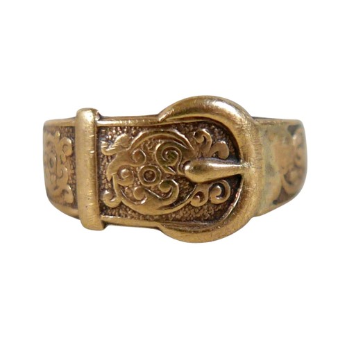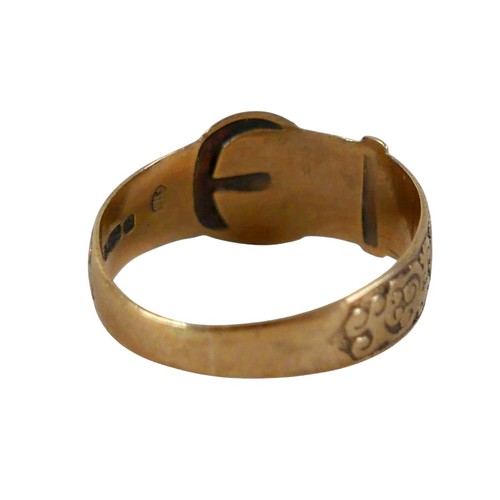 A 9ct yellow gold ring in the form of a belt with engraved decoration, size U, 3.2g.