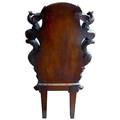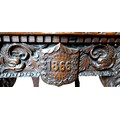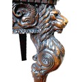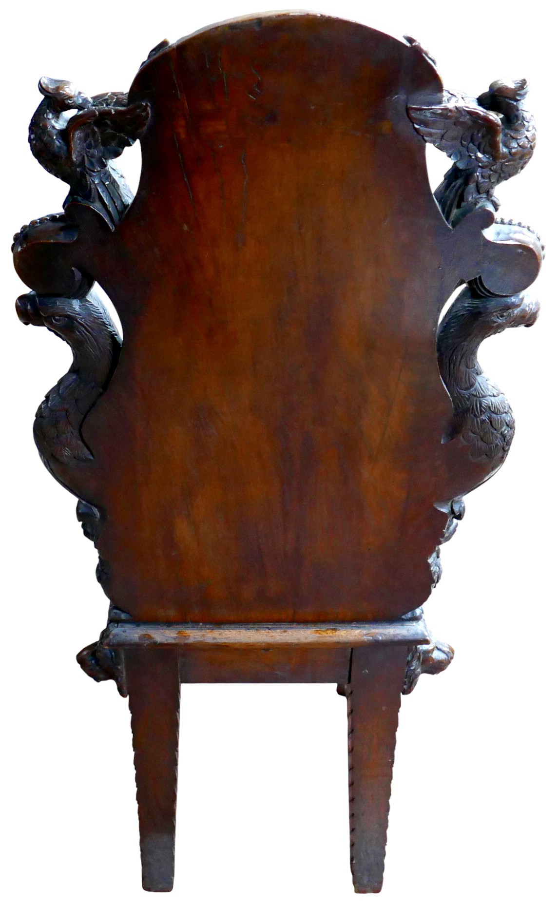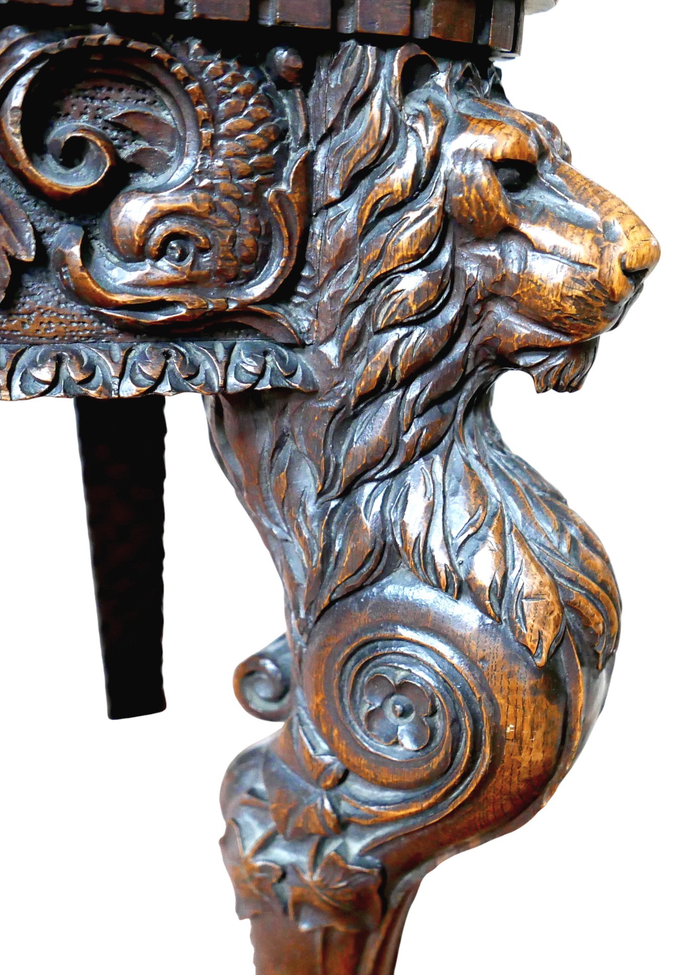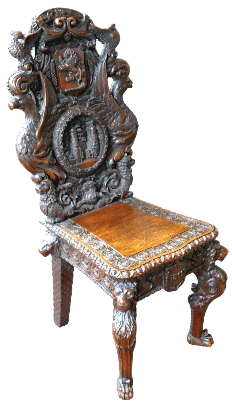 The Burghley Chair: a Victorian heavily carved oak Armorial hall chair, dated 1866, profusely carved with a rampant, collared, and chained lion on an armorial shield, phoenix, eagle, lion and snake carvings surrounding a central roundel with leaf borders depicting a view of Burghley House, the shaped seat with a border of sixteen roses and scrolling foliage, above a deep apron with dated shield to the front flanked by two dolphin fish, all raised on lion monopodia front legs and scaled back legs with lion mask capitals, 47 by 50 by 119cm high.