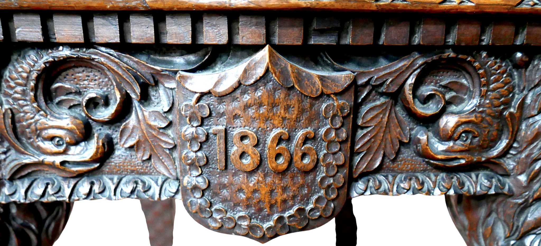 Notes: carved by Allen W Rippon (or Rippen), the maker adopted Rippon, in place of Rippen from 1871, apparently there were four chairs, one owned by the vendors father and one by their uncle, two being in Stamford town hall with different carvings of The Priory and Brazenose Gate.