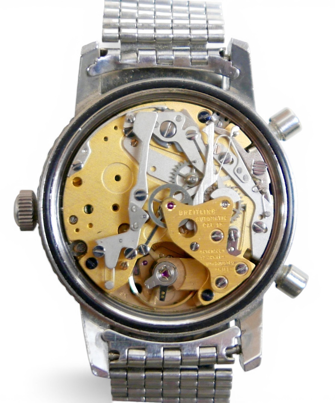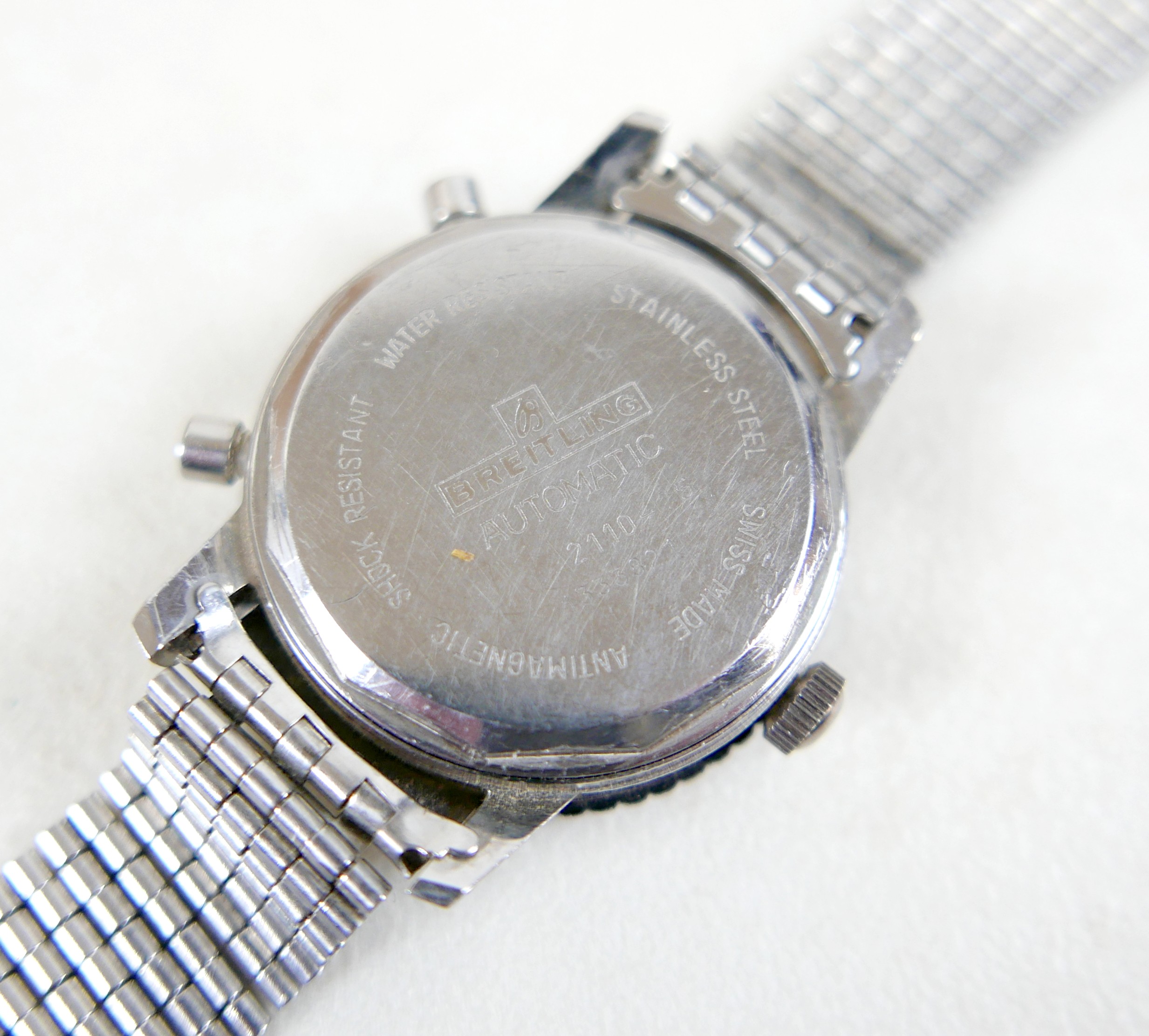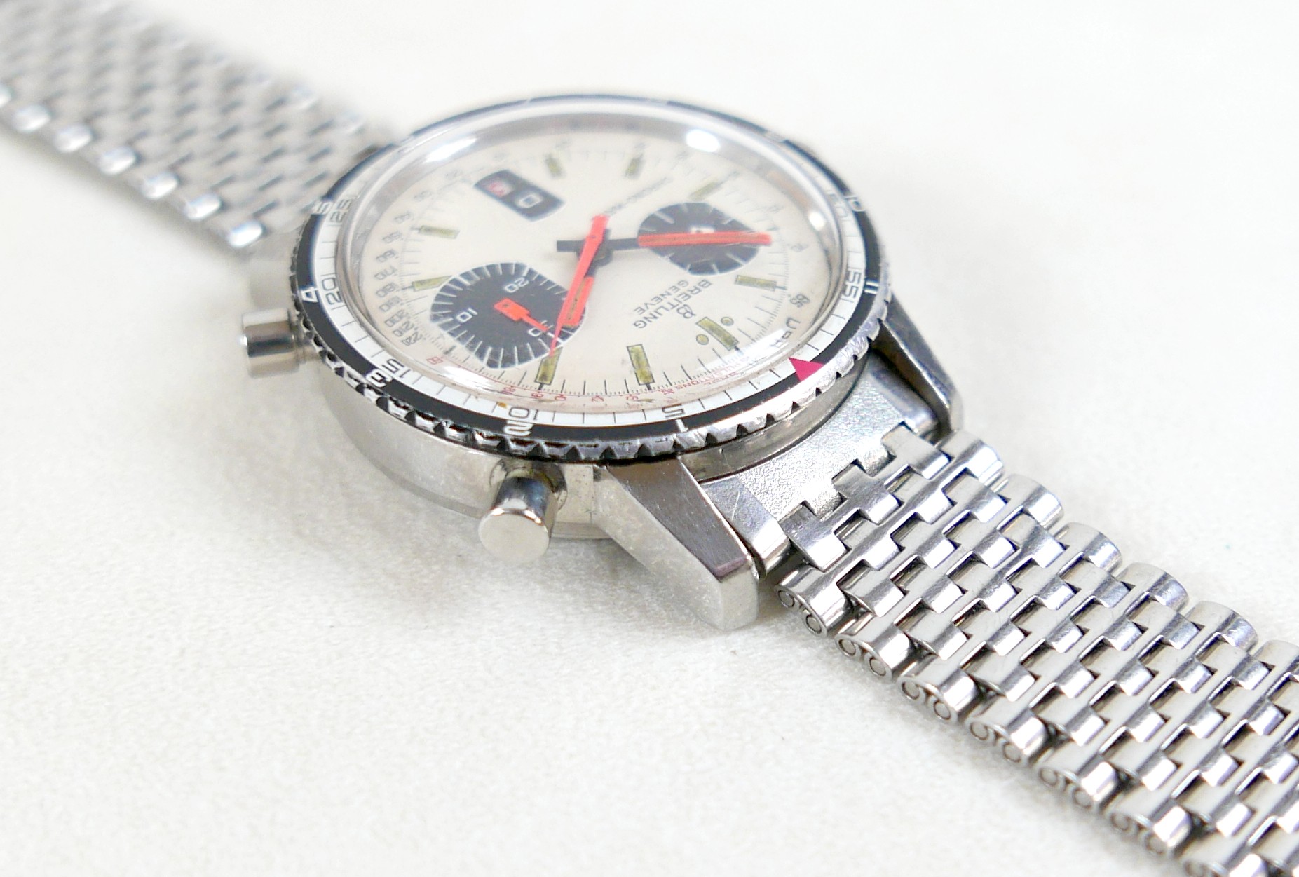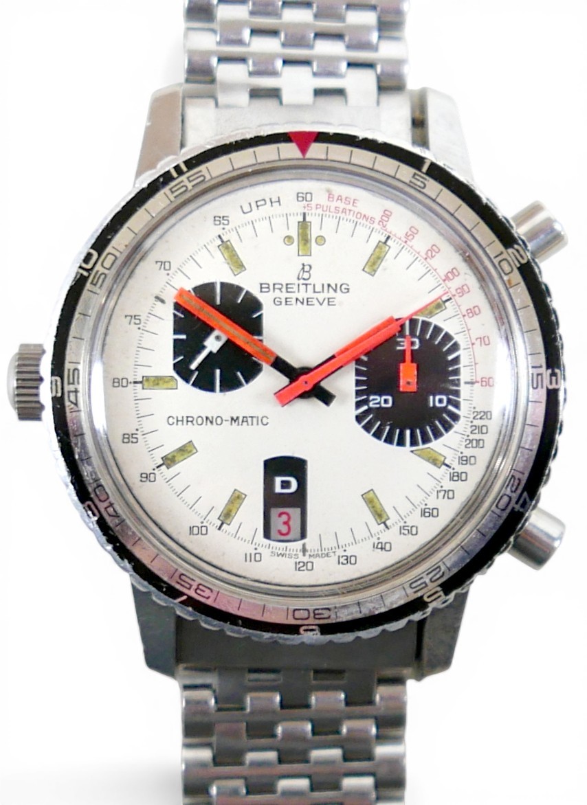A Breitling Genéve Chrono-Matic automatic chronograph stainless steel gentleman's wristwatch, ref. 2110-15, serial 1333821, circa 1960's, white dial with hour markers, minute track, units per hour base pulsations scale, silvered subsidiary constant seconds and minute recording dials, date aperture at the six position and orange chronograph centre seconds, orange hands, black bi-rotational bezel, crown at the nine position, cal. 15 17 jewel movement, on a shortened stainless steel strap, total length 18cm 38mm case.