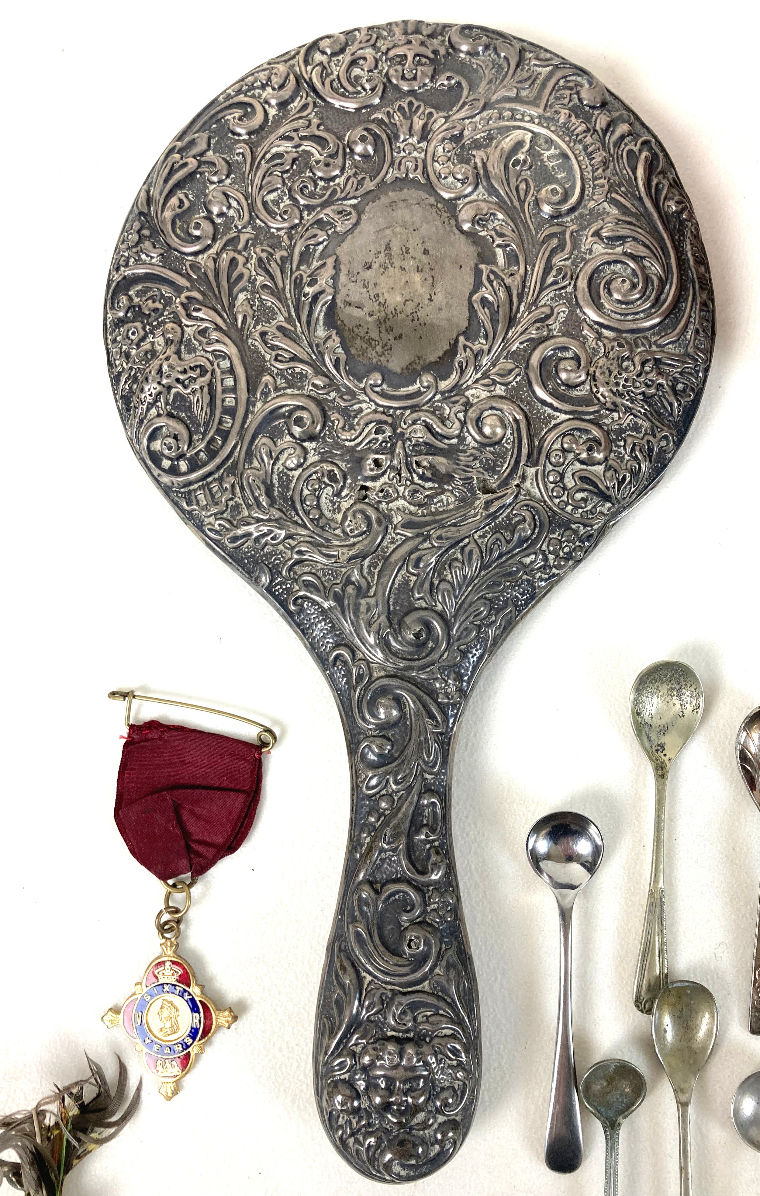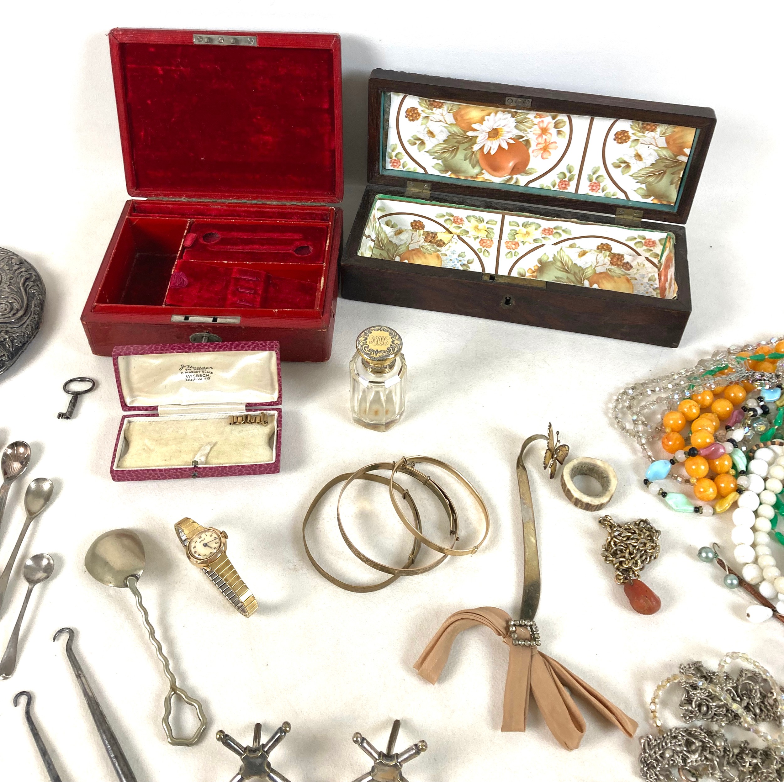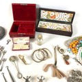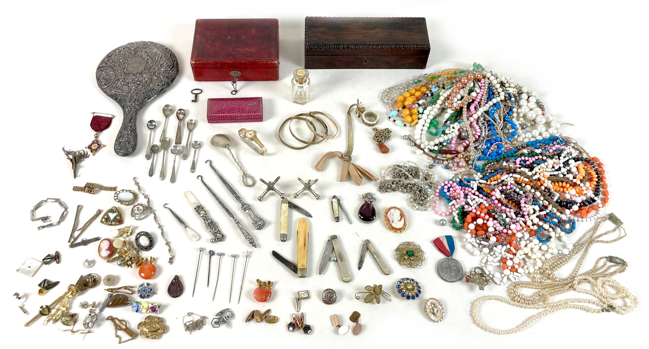A group of silver and costume jewellery, including a silver backed hand mirror, two Victorian silver fruit knifes with mother of pearl handles, Edward VII Coronation medal, glass scent bottle with plated top, various necklaces, earrings, and brooches, together with a Victorian mahogany glove box, and an Edwardian red leather jewellery box, initialled 'A.G.' to the cover. (1 bag)