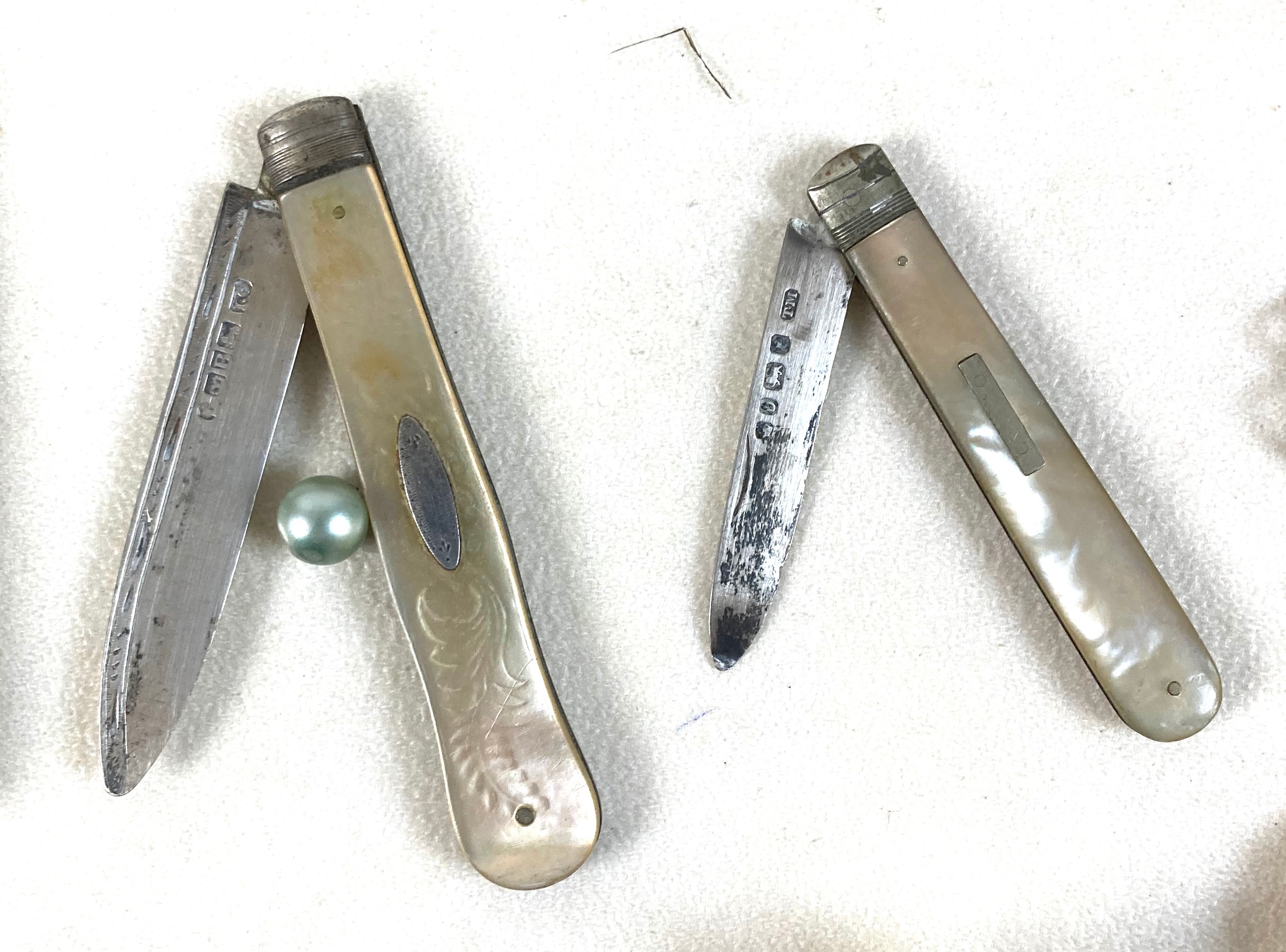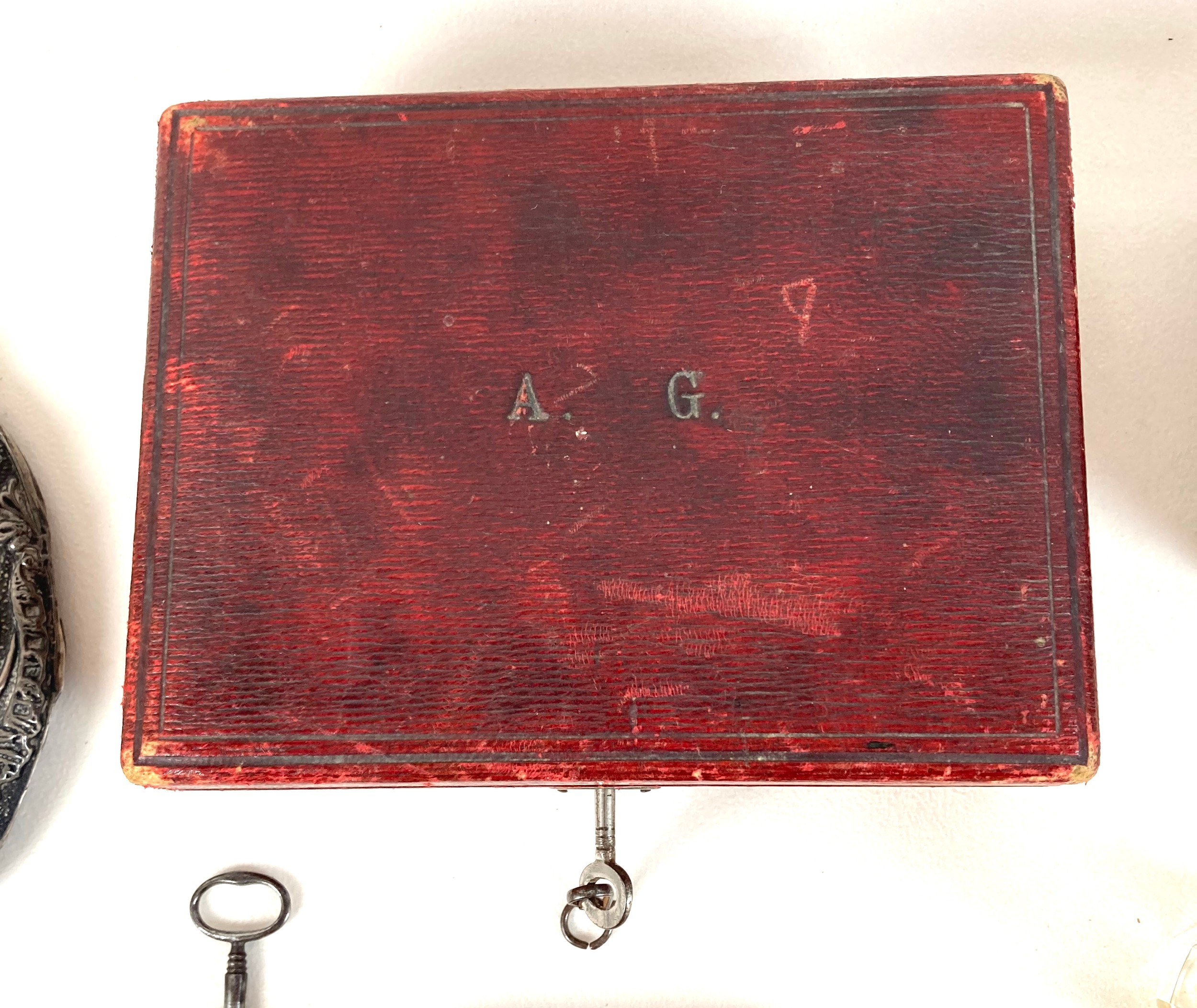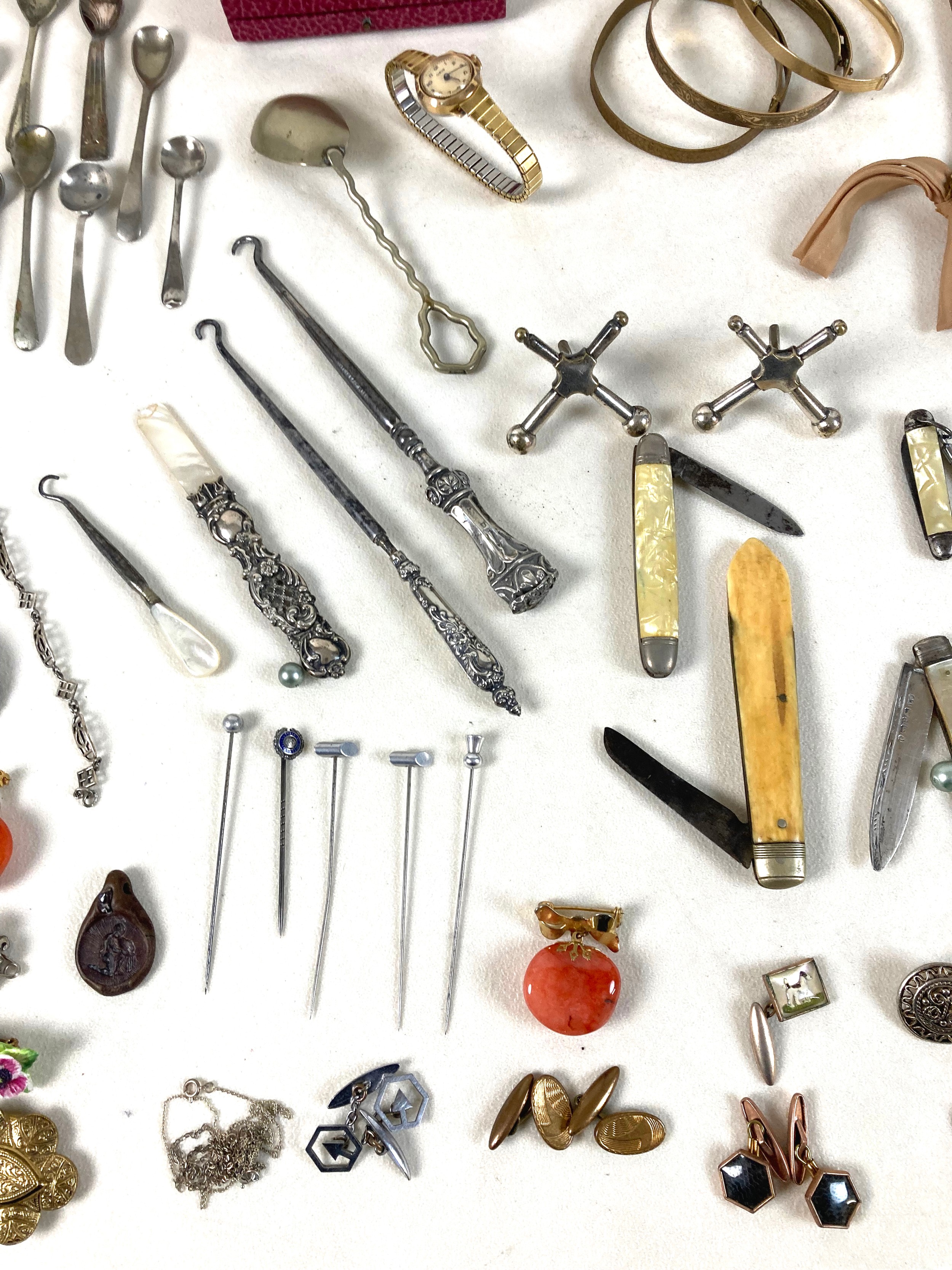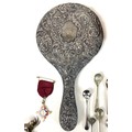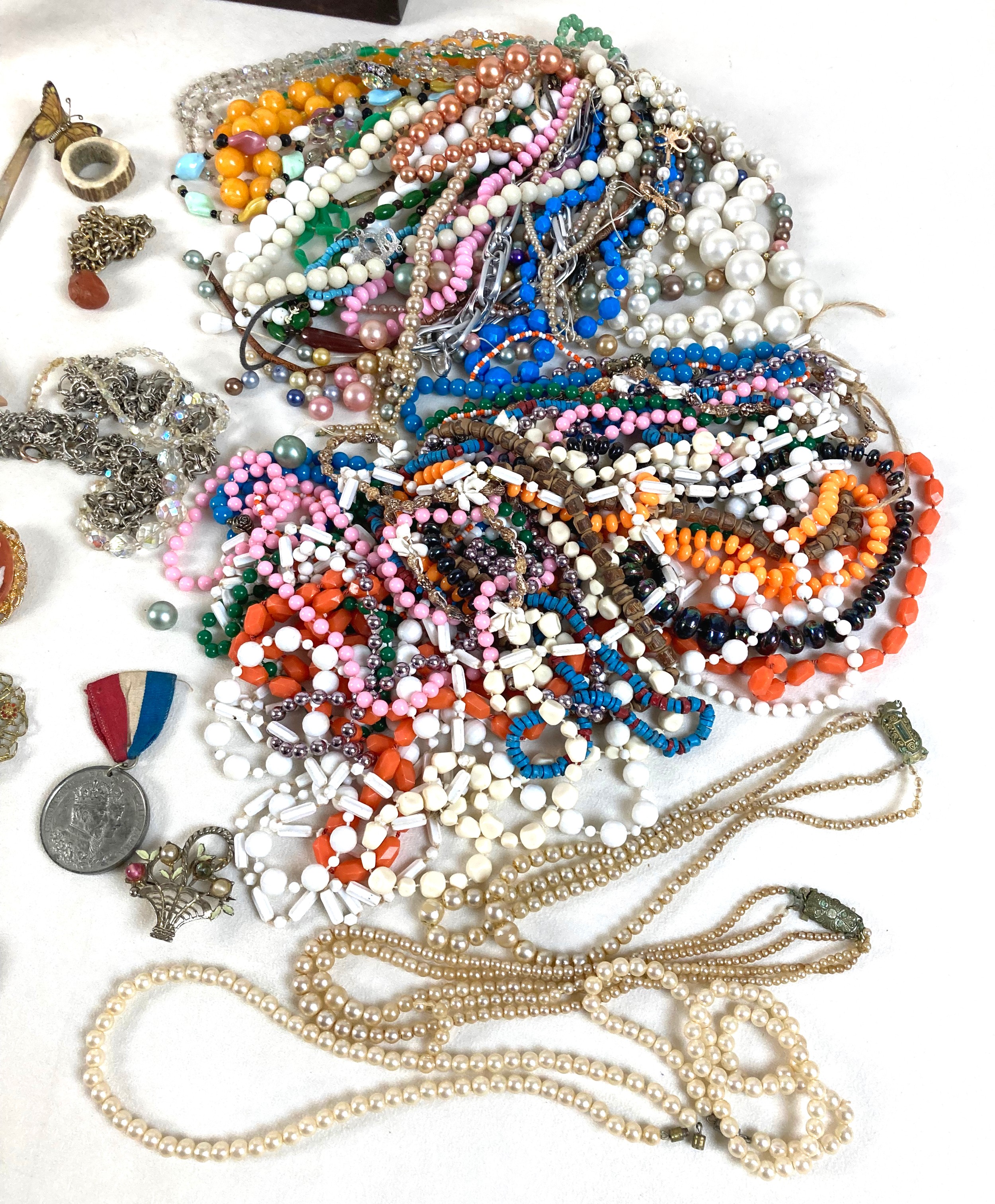 A group of silver and costume jewellery, including a silver backed hand mirror, two Victorian silver fruit knifes with mother of pearl handles, Edward VII Coronation medal, glass scent bottle with plated top, various necklaces, earrings, and brooches, together with a Victorian mahogany glove box, and an Edwardian red leather jewellery box, initialled 'A.G.' to the cover. (1 bag)
