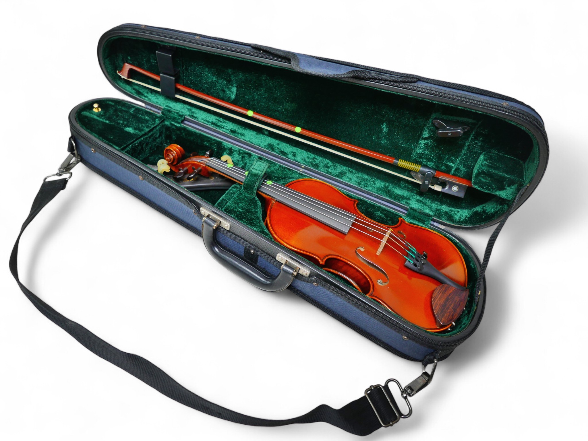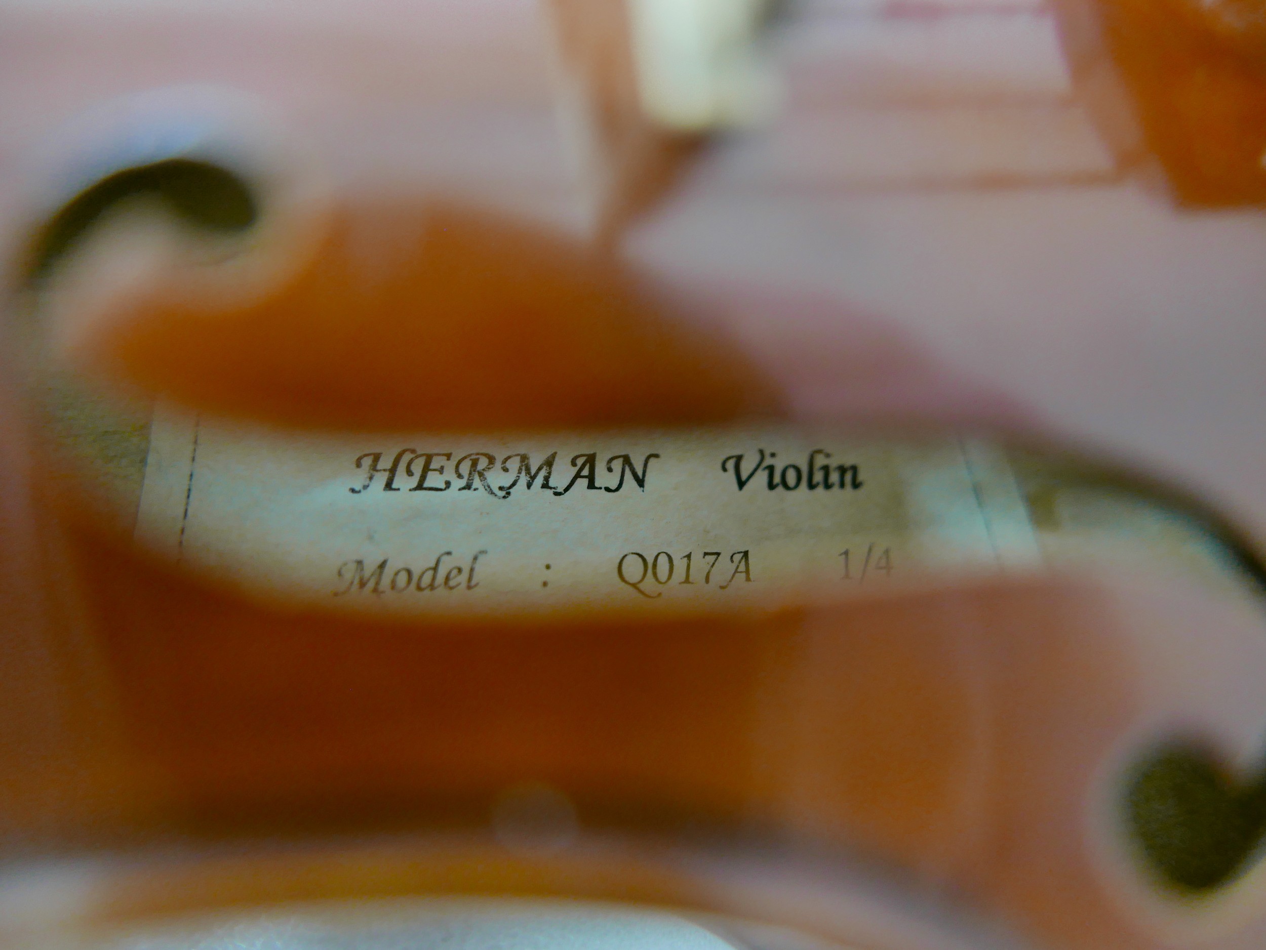 A late 20th century German 1/4 size violin, by Herman, model Q017A, with bow and soft case, back 11" long.
