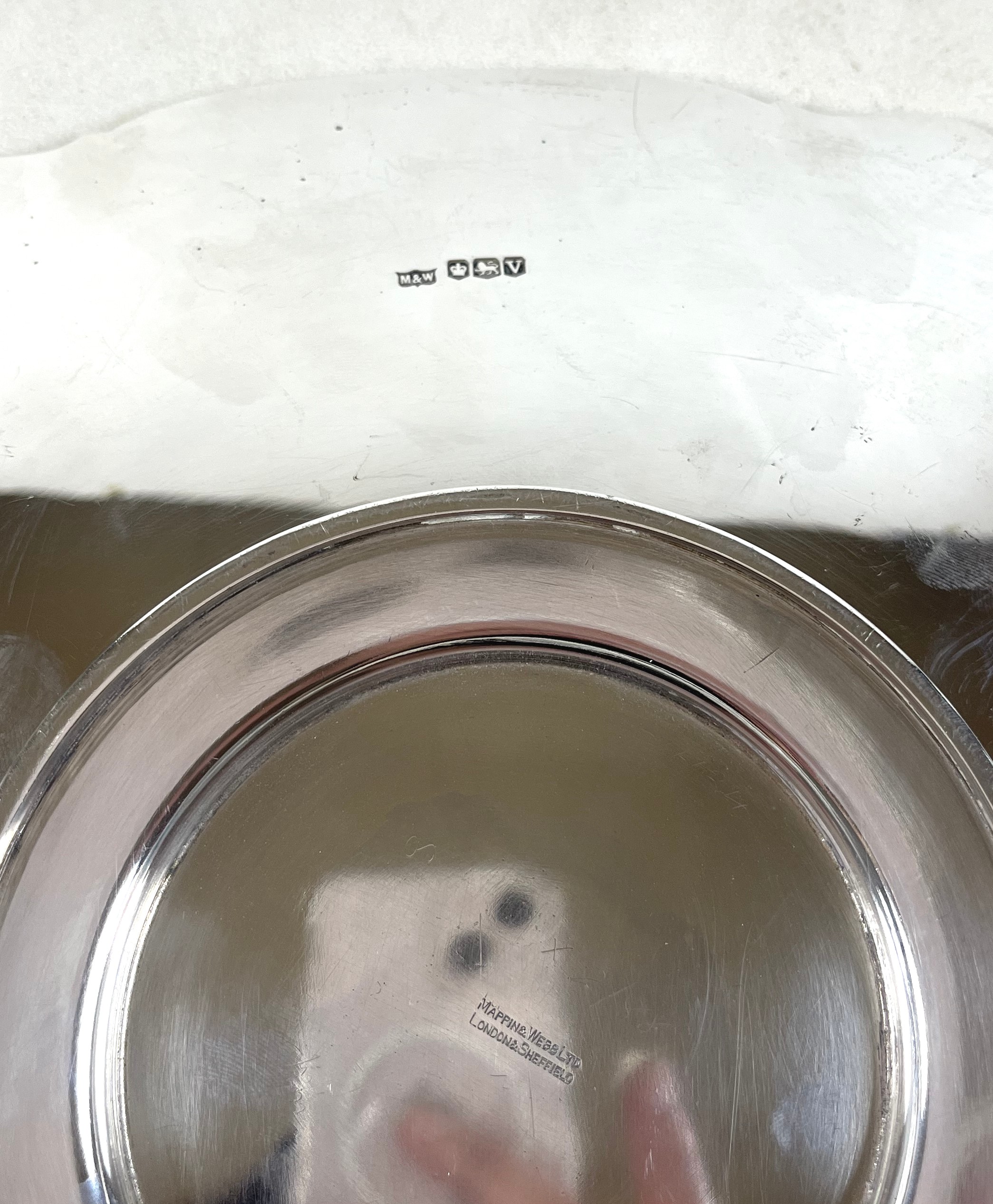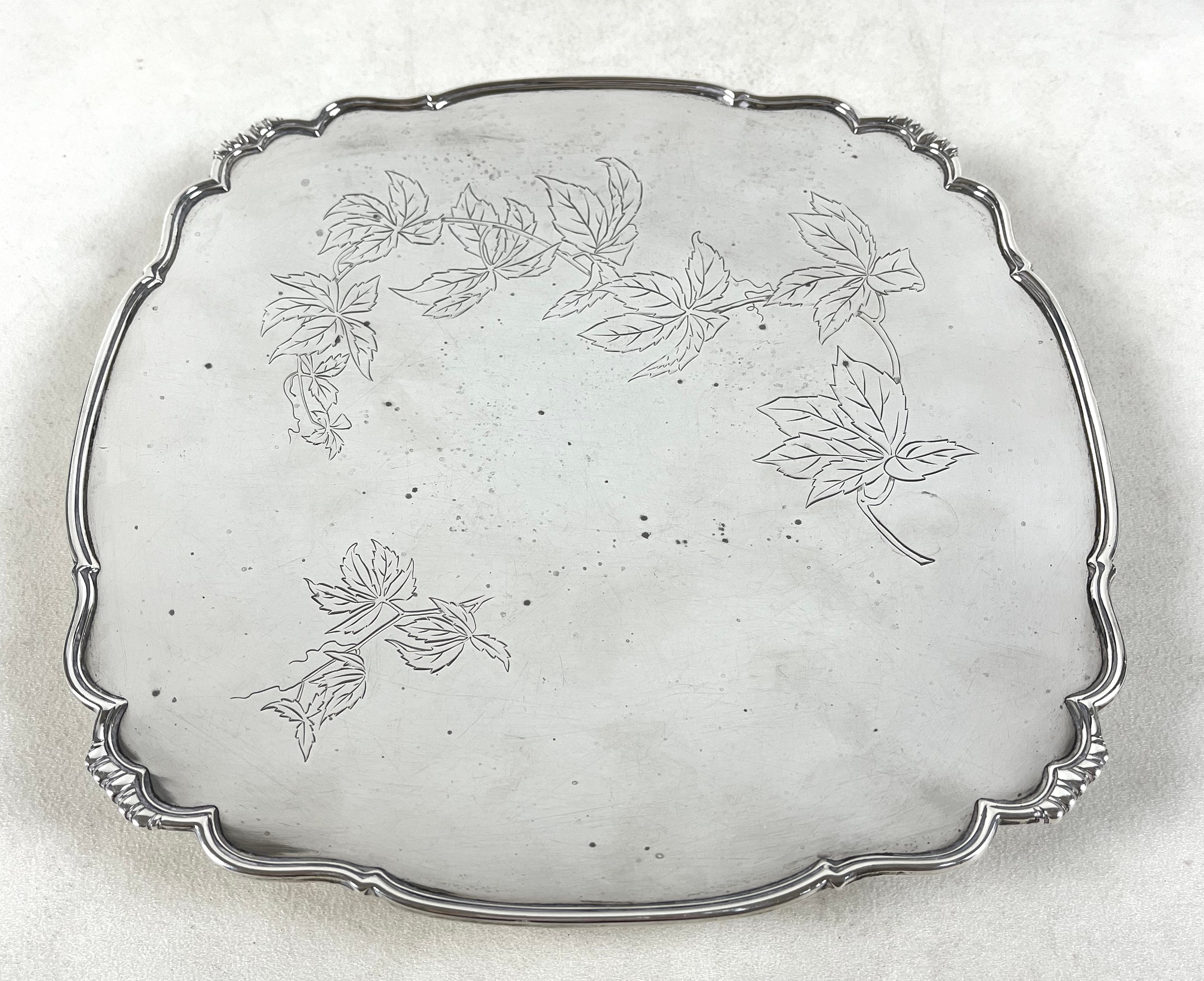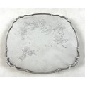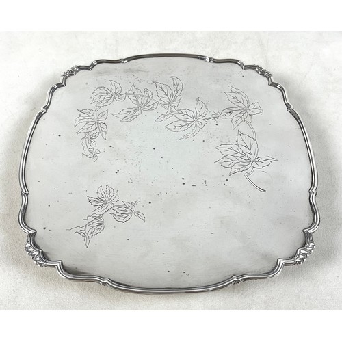 A George VI silver footed salver, with a shaped engraved top on a circular foot, Mappin & Webb Sheffield 1938, 26 by 26 by 2.5cm, 18.5toz.