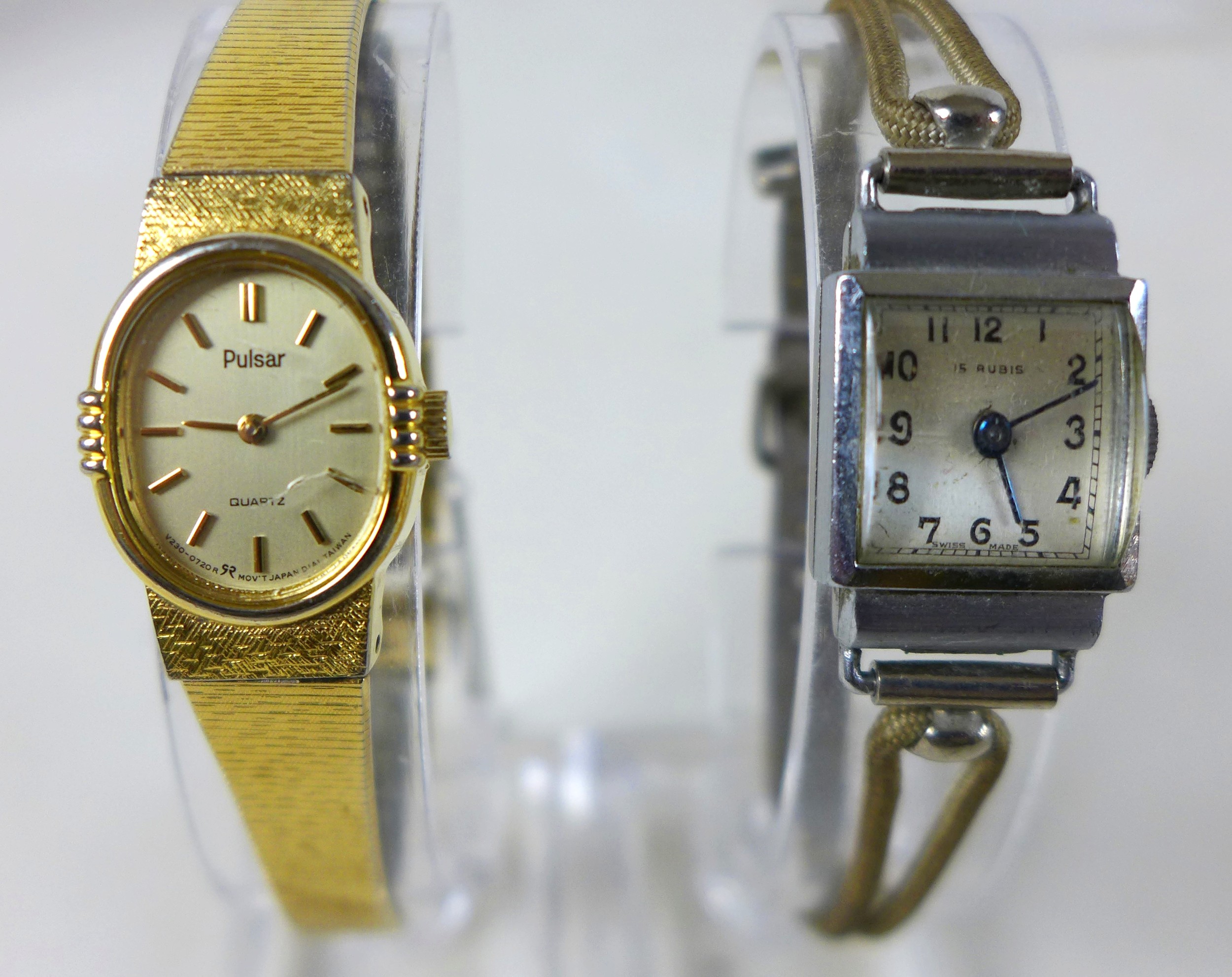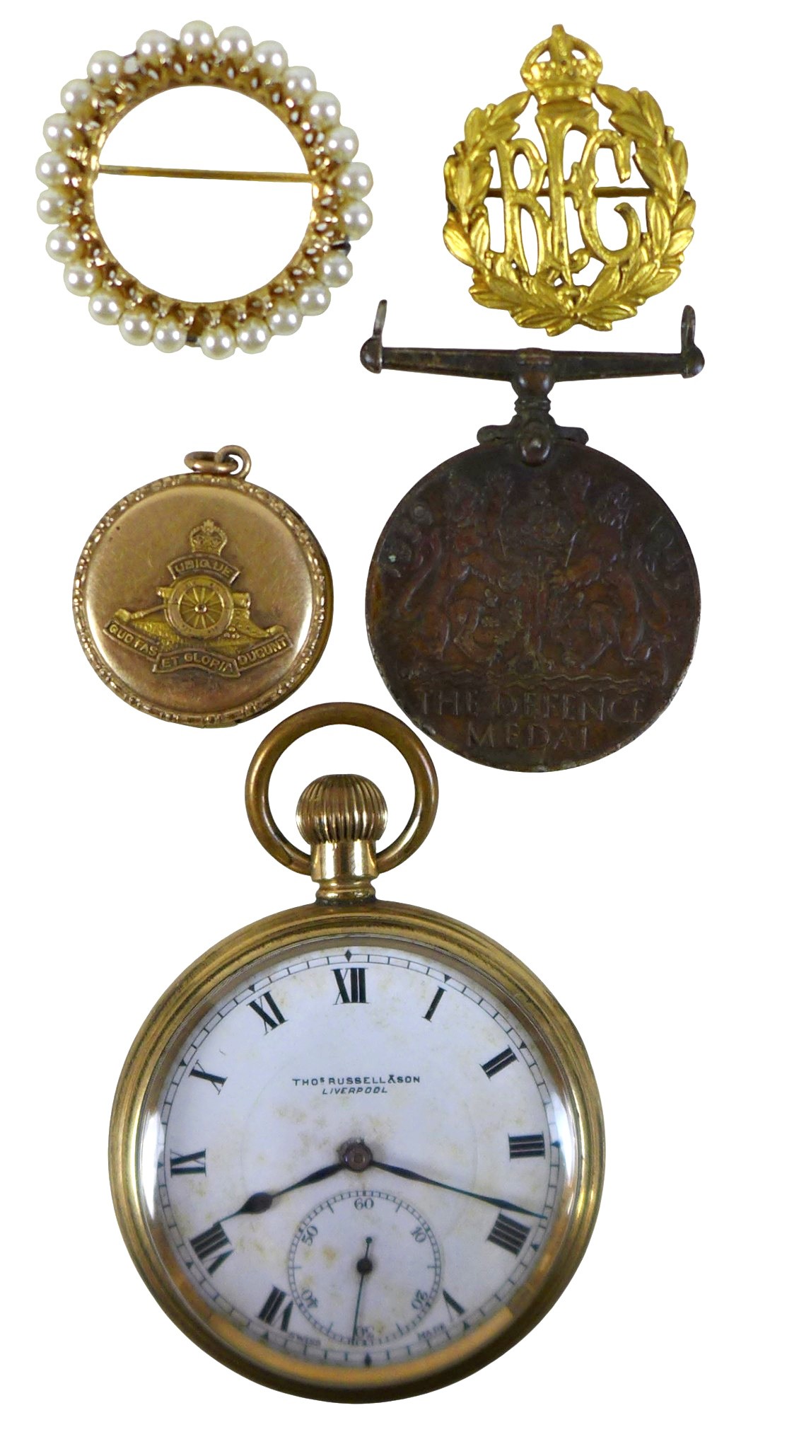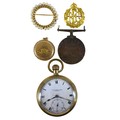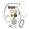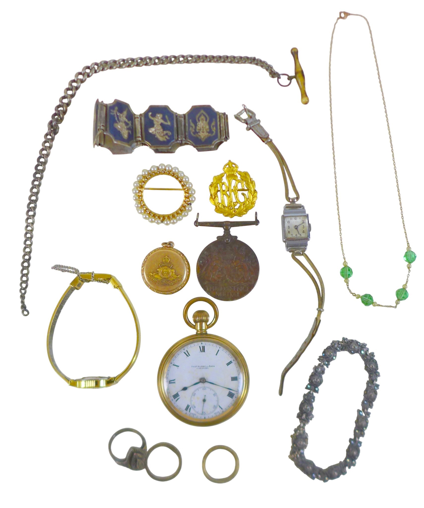 A collection of watches, costume jewellery and militaria, including an Royal Flying Corp cap badge, a Thomas Russell & Son gold plated open faced pocket watch. (1 bag)