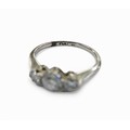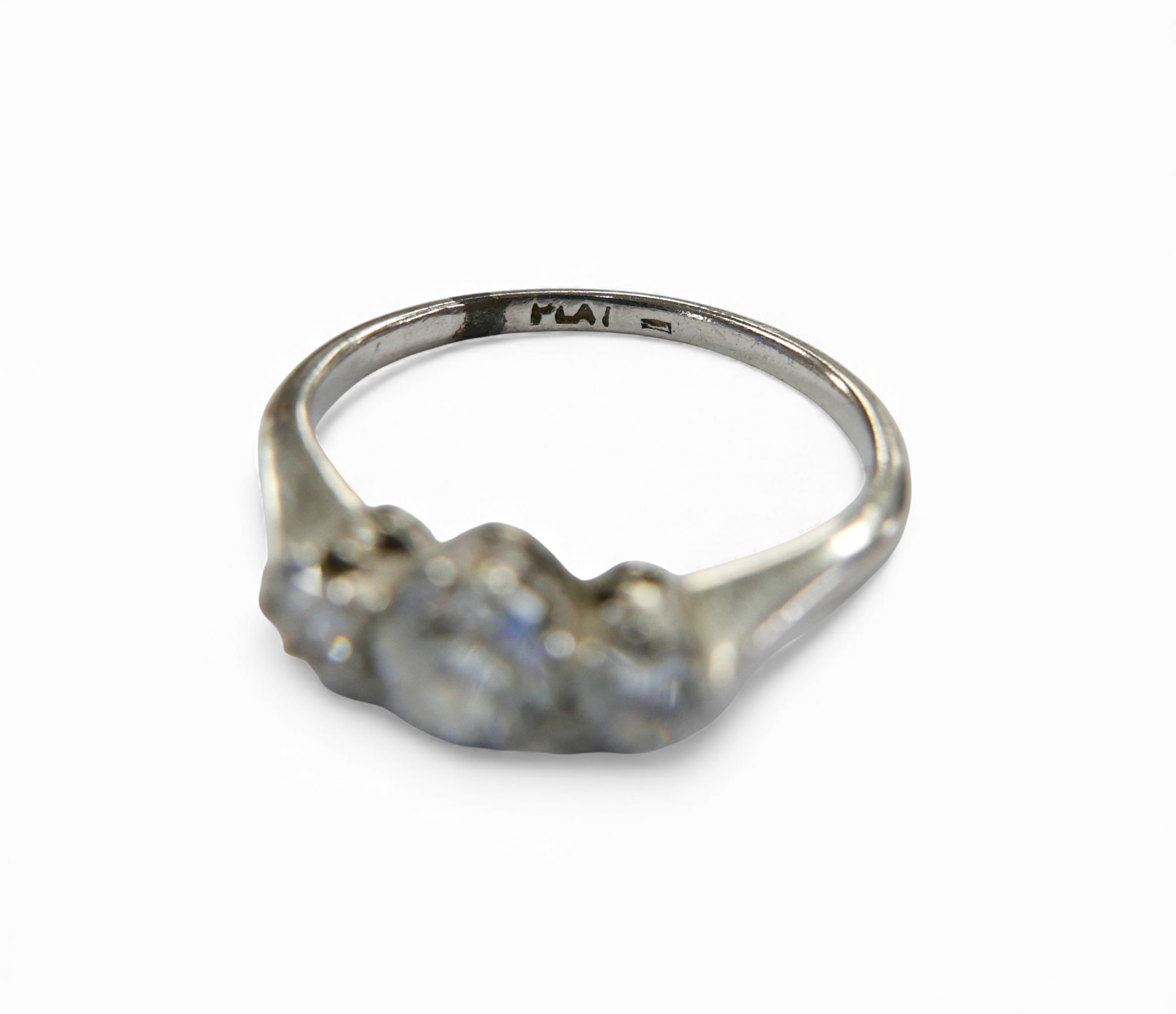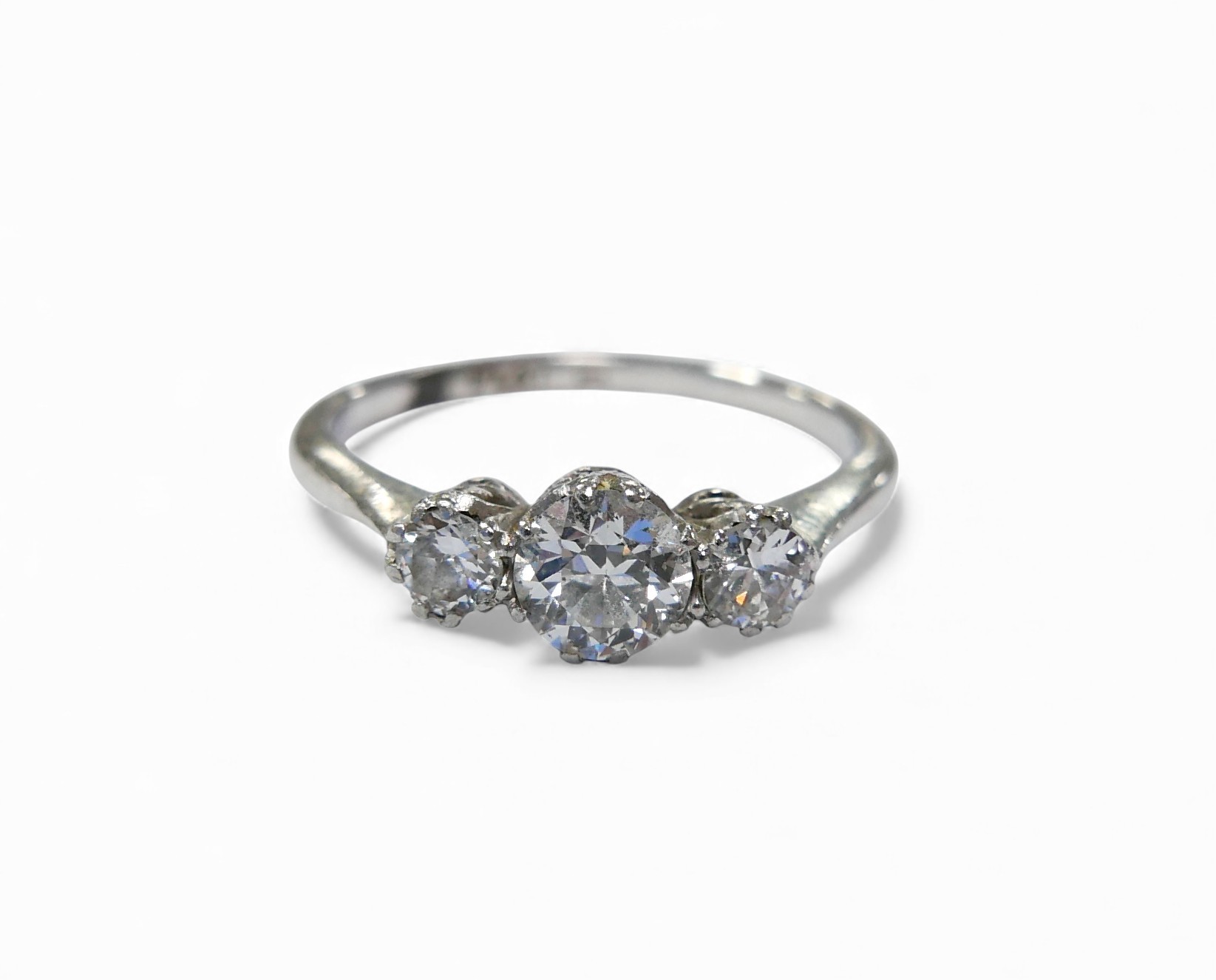 A platinum and diamond three stone ring, the largest central stone approximately 4.5mm in diameter, ring size I, 2.7g.