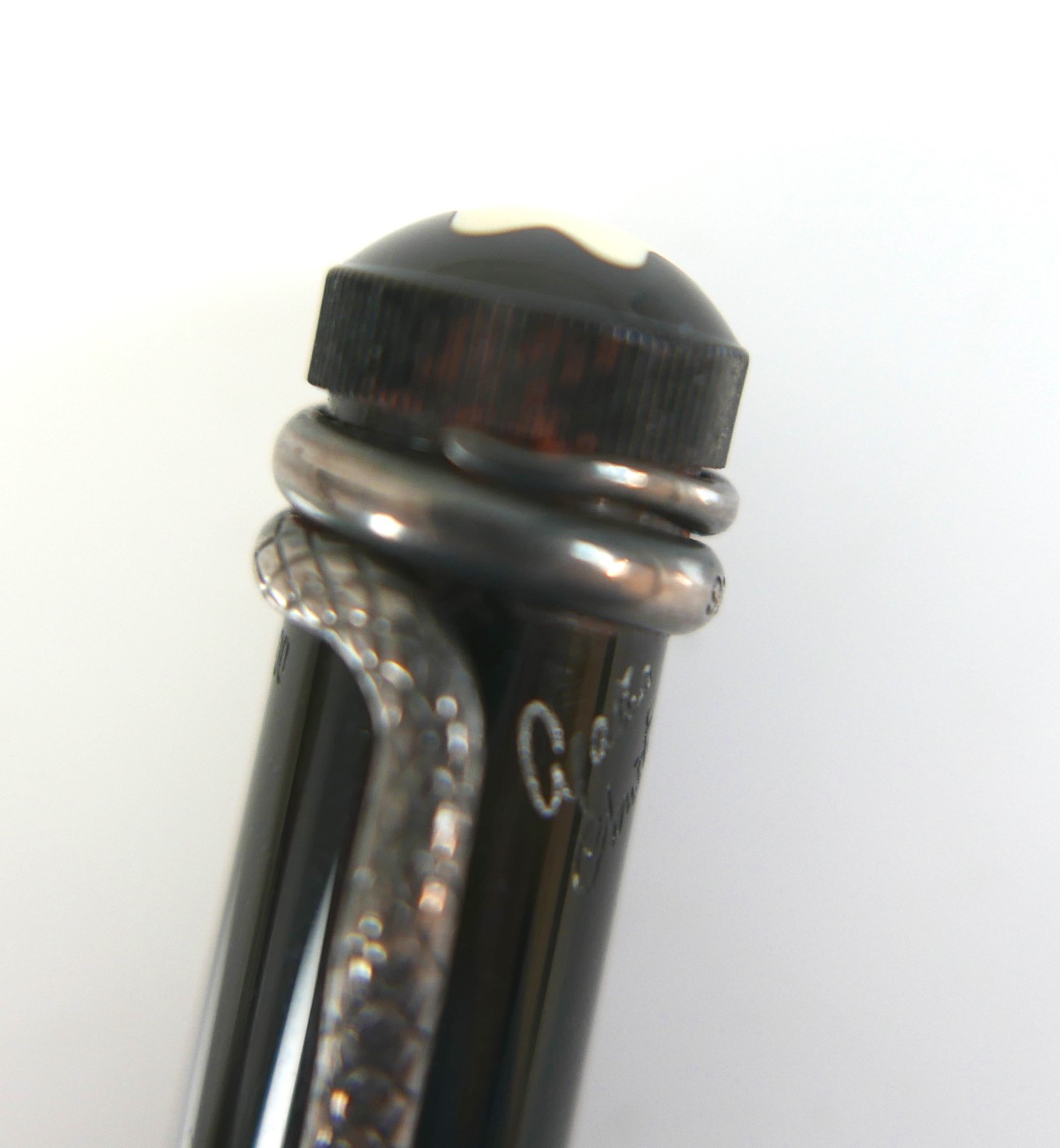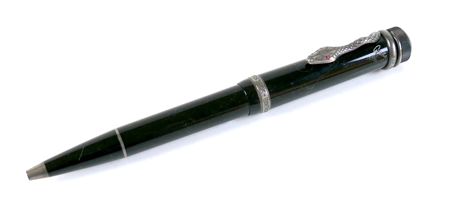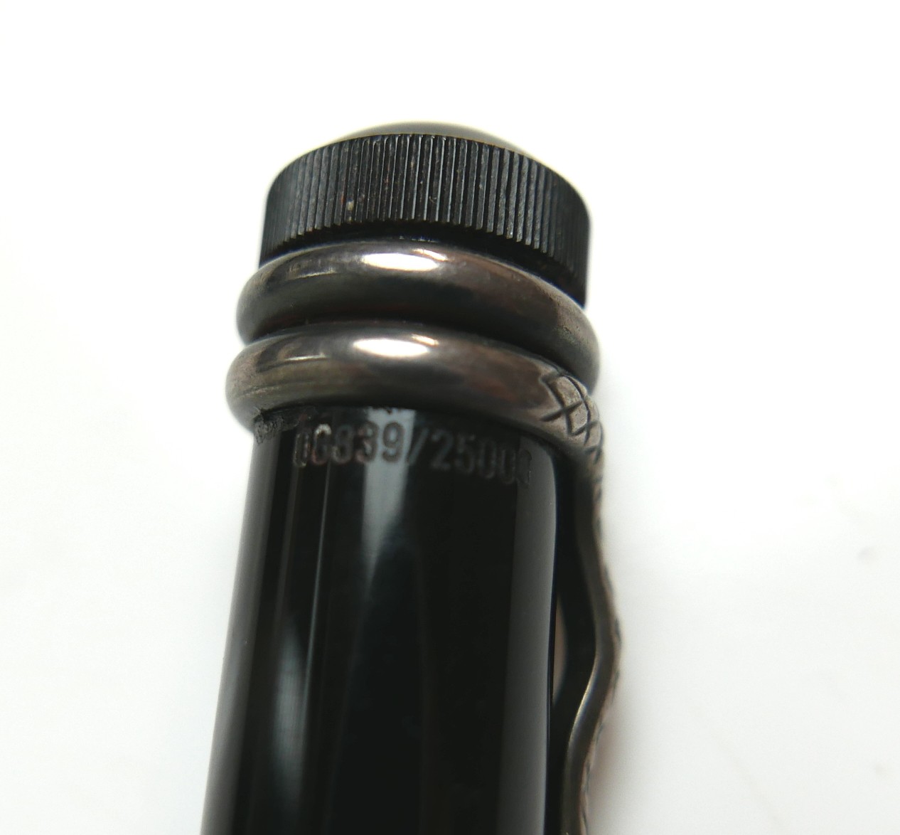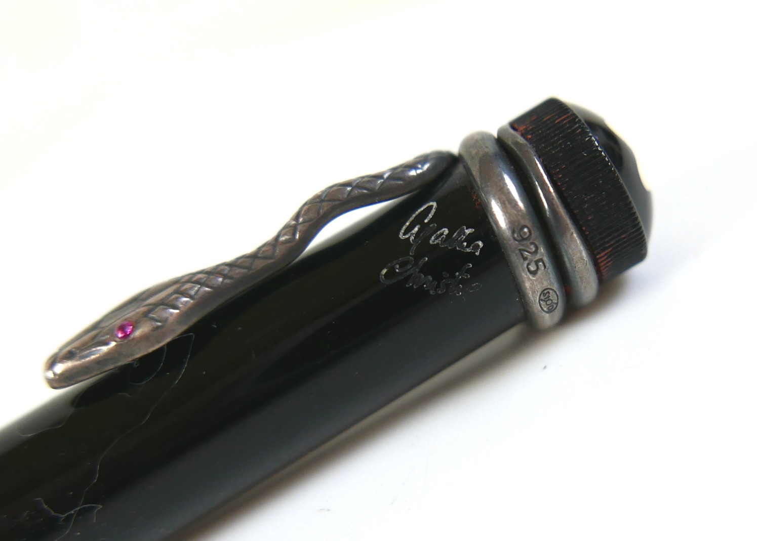 A Montblanc Meisterstuck Writer's Edition 'Agatha Christie' ballpoint pen, no. 008829/25000, circa 1993, black resin cap clasped by a silver snake clip with circular cut ruby eyes, black resin barrel with silver bands, engraved Agatha Christie facsimile signature, stamped 925, 14cm long.