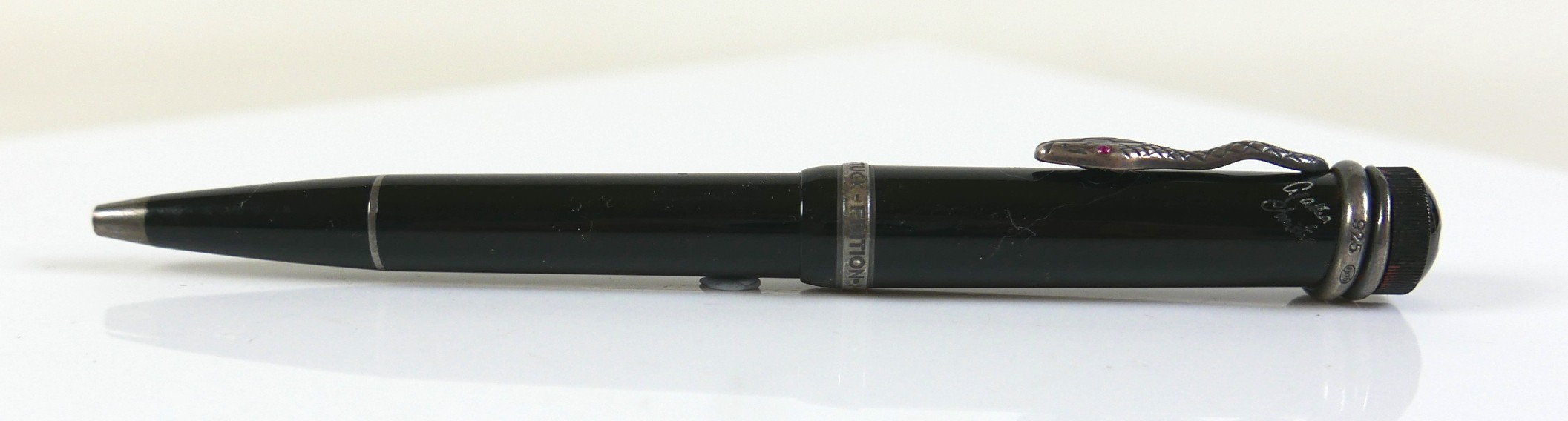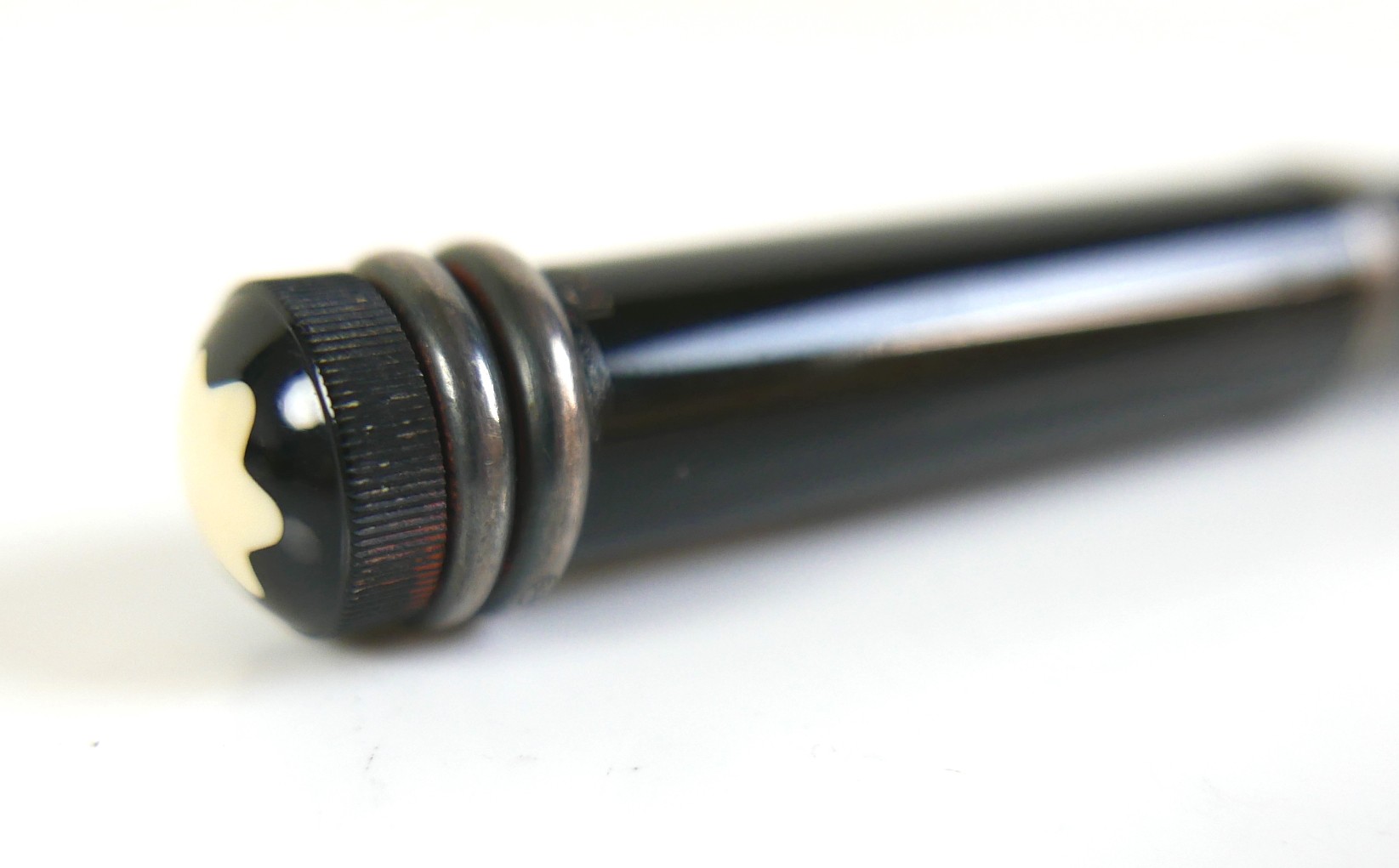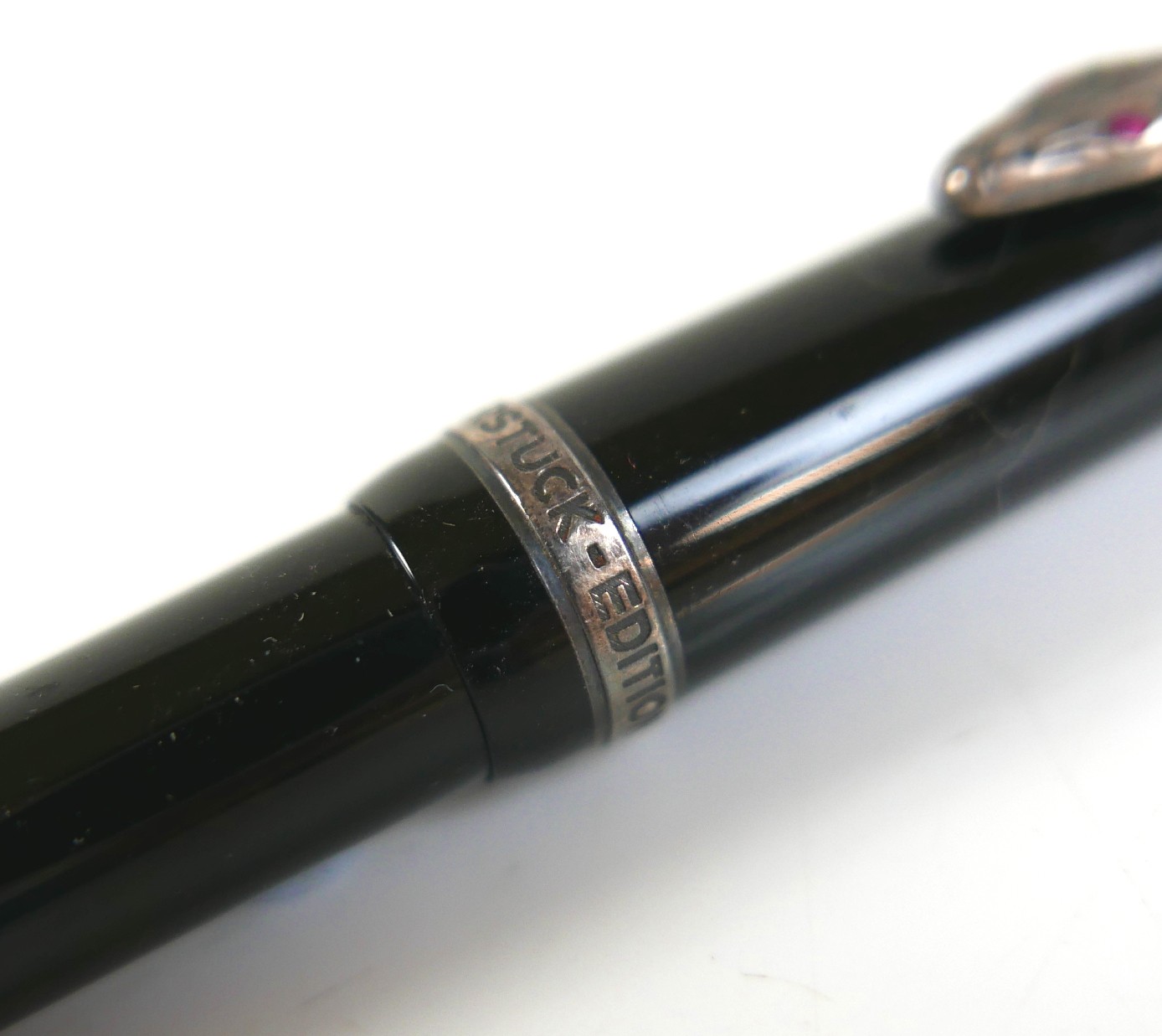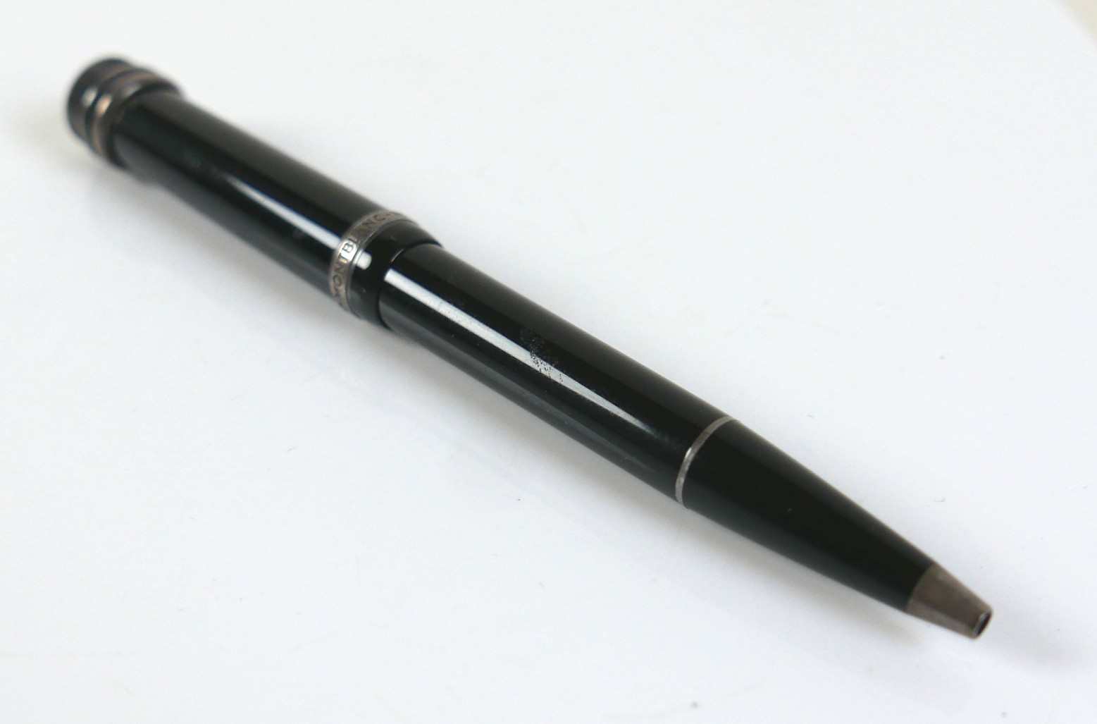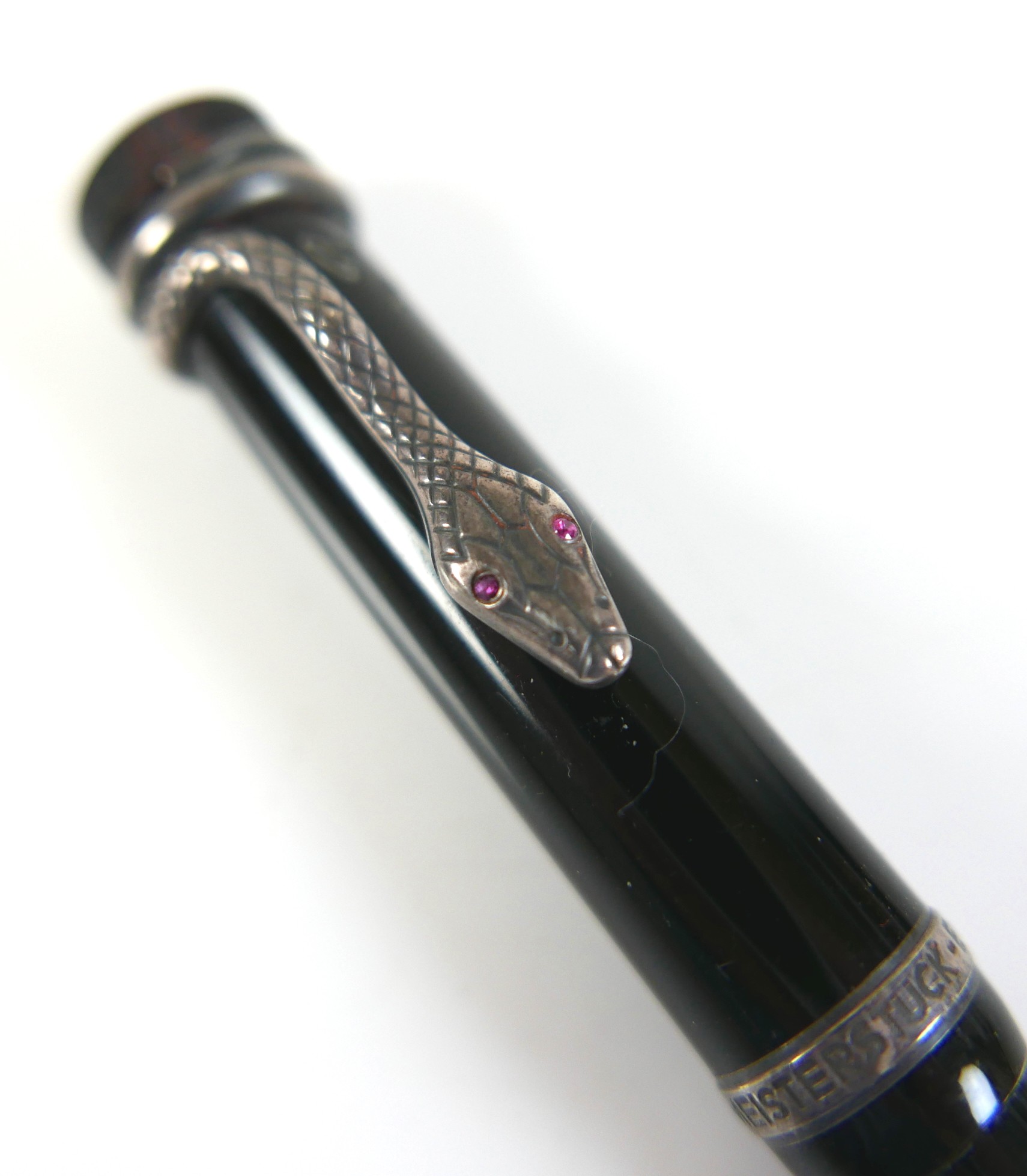 A Montblanc Meisterstuck Writer's Edition 'Agatha Christie' ballpoint pen, no. 008829/25000, circa 1993, black resin cap clasped by a silver snake clip with circular cut ruby eyes, black resin barrel with silver bands, engraved Agatha Christie facsimile signature, stamped 925, 14cm long.