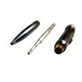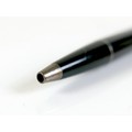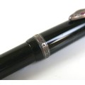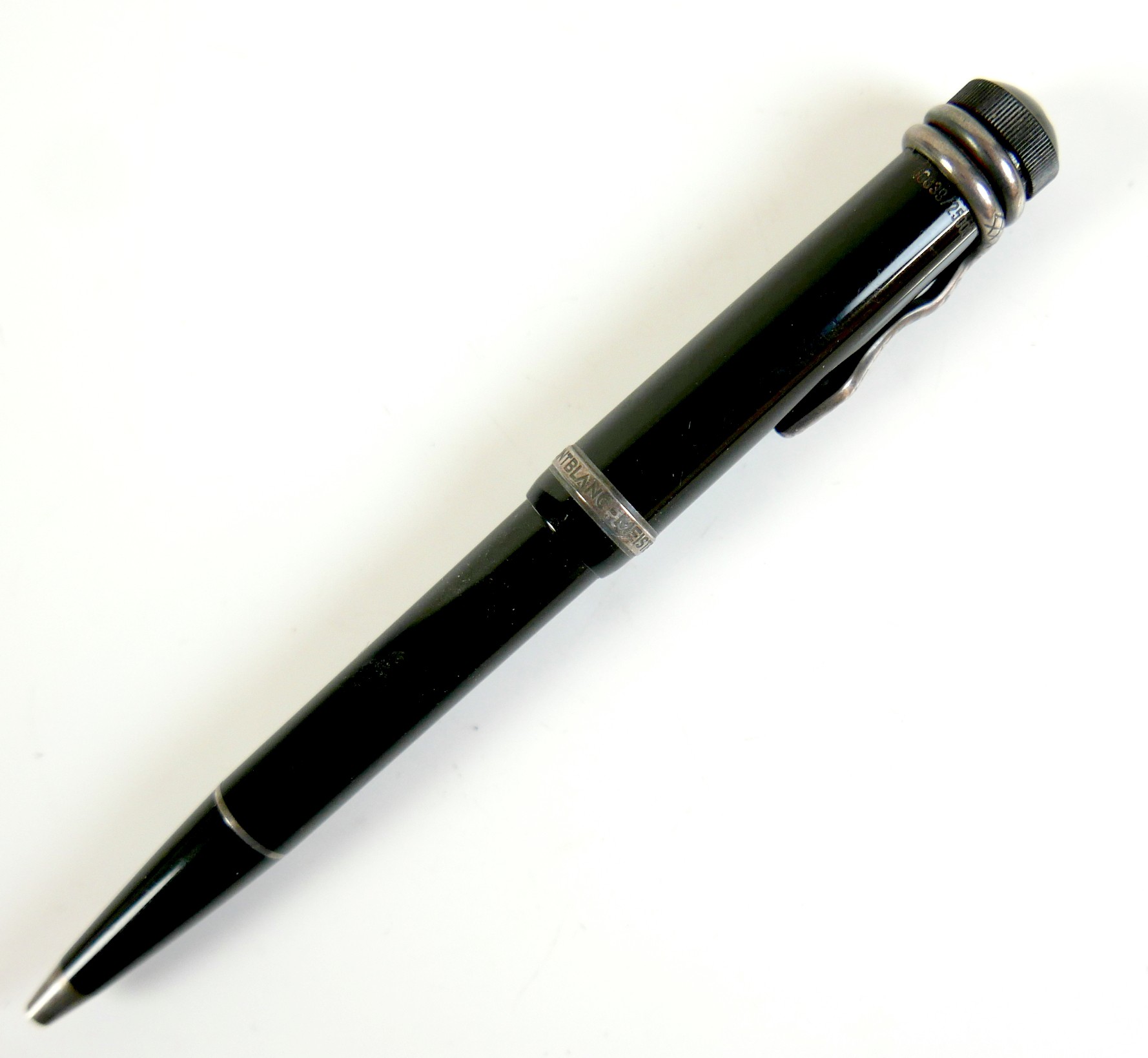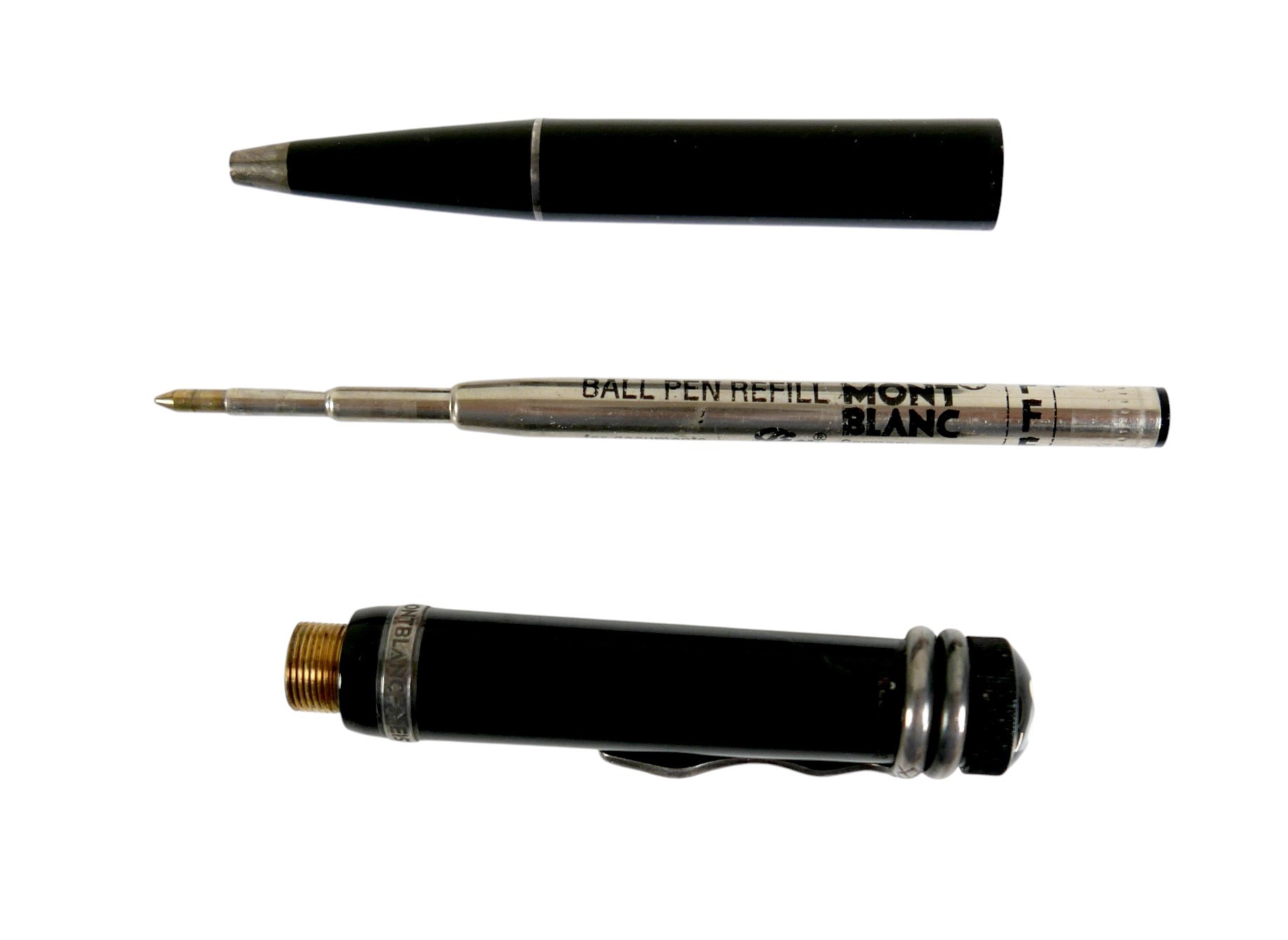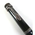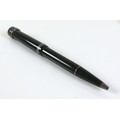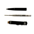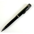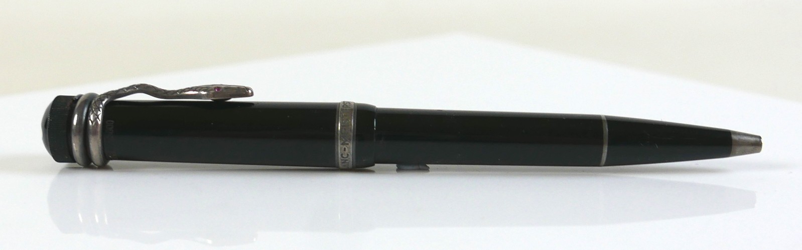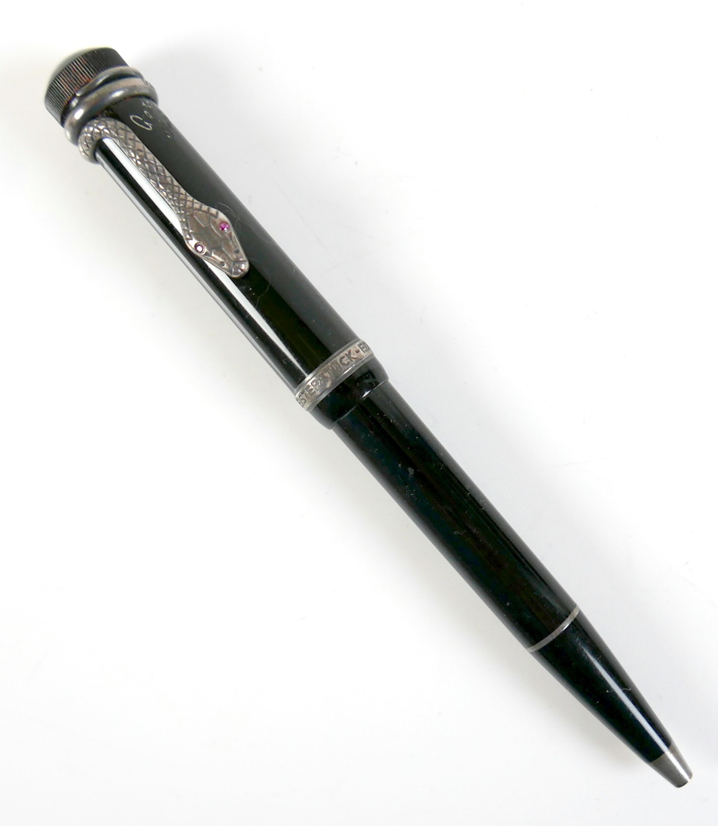 A Montblanc Meisterstuck Writer's Edition 'Agatha Christie' ballpoint pen, no. 008829/25000, circa 1993, black resin cap clasped by a silver snake clip with circular cut ruby eyes, black resin barrel with silver bands, engraved Agatha Christie facsimile signature, stamped 925, 14cm long.