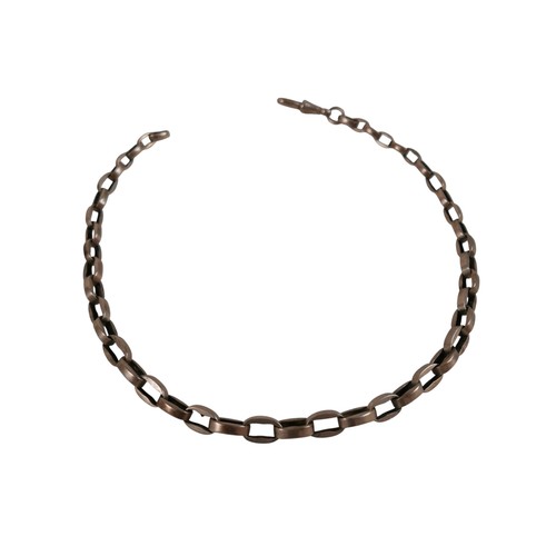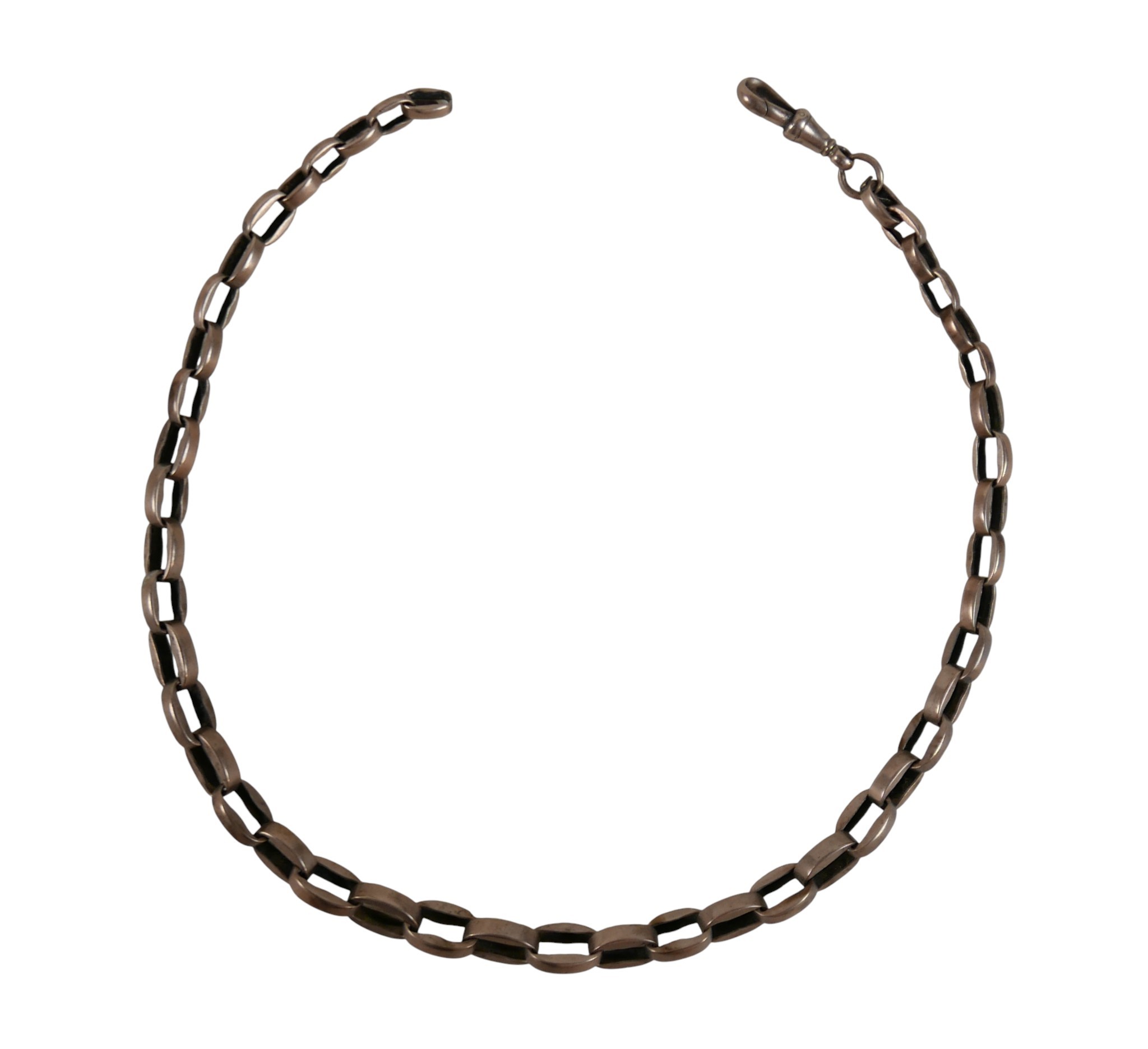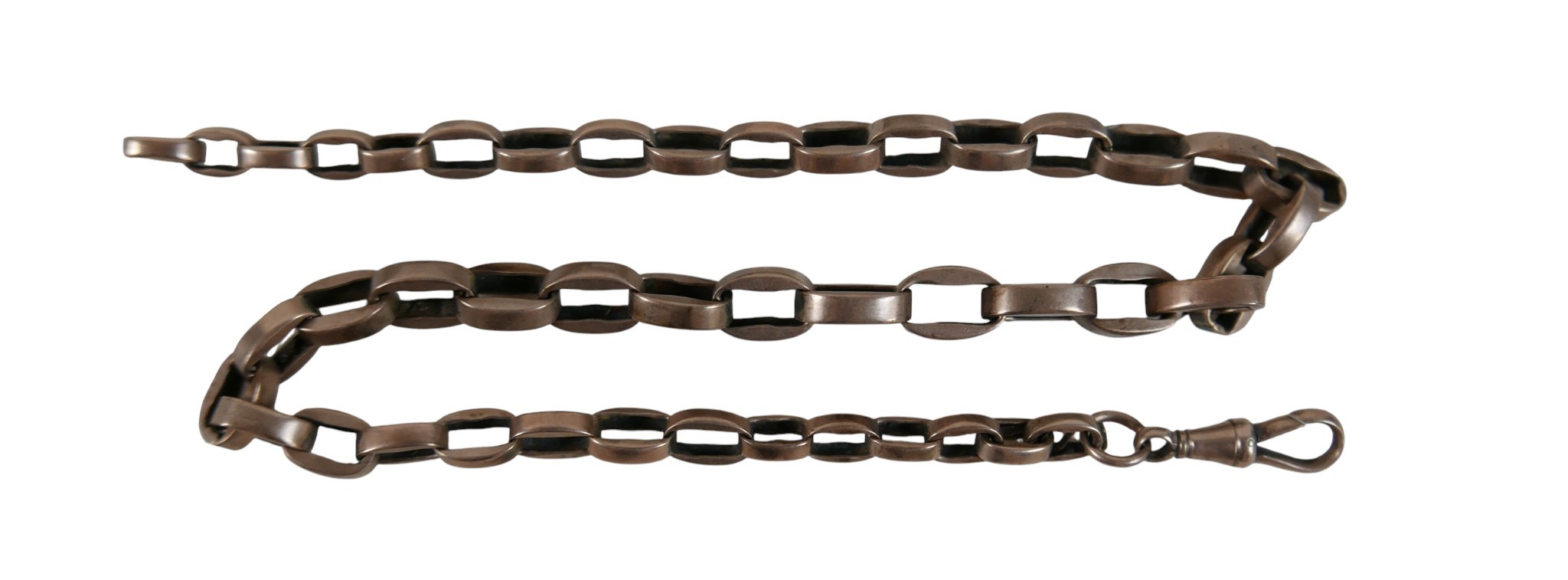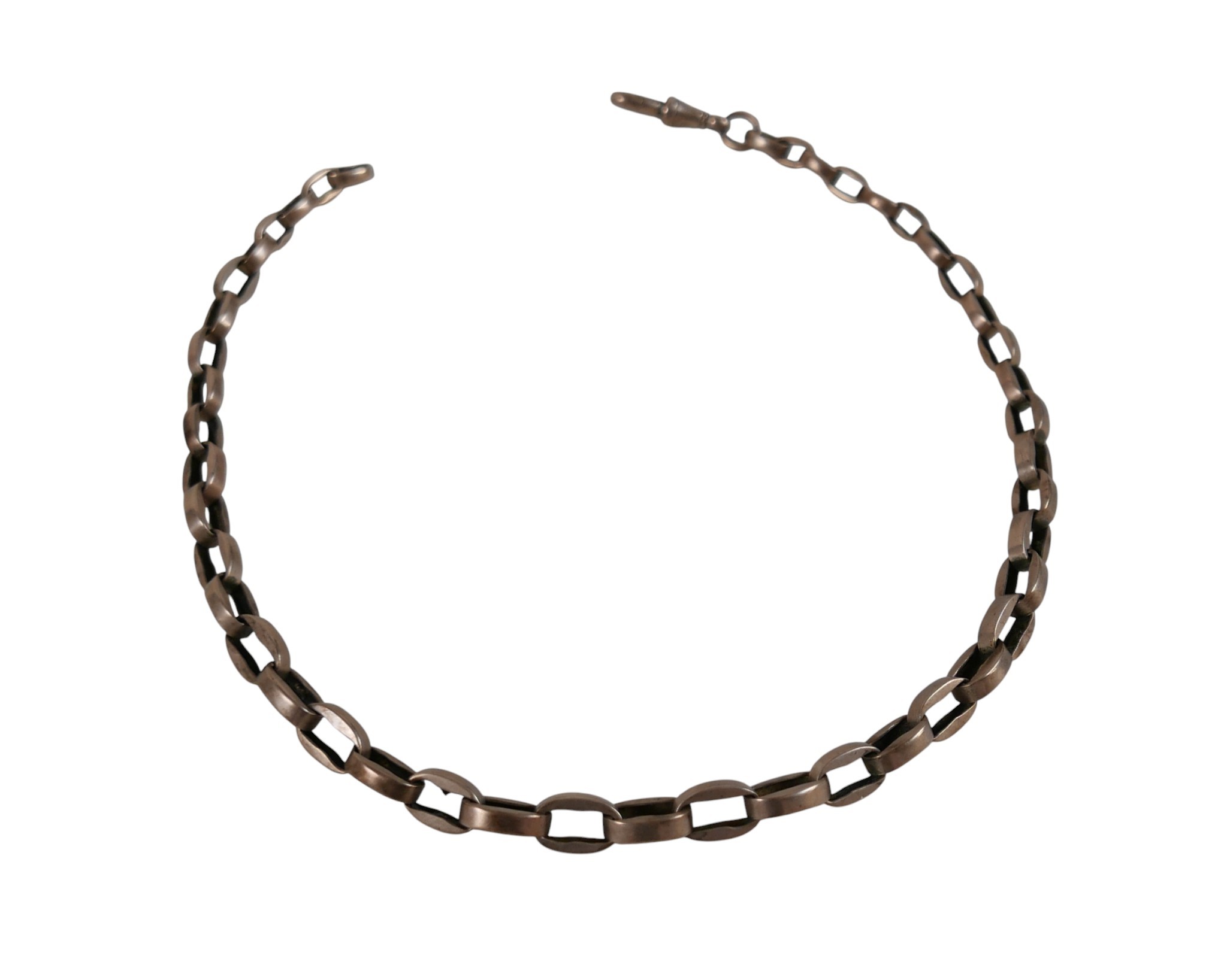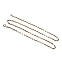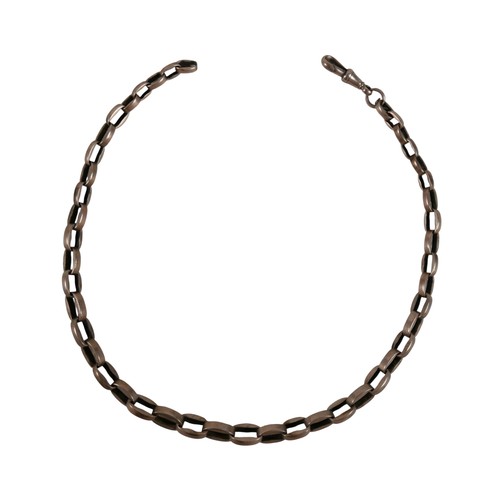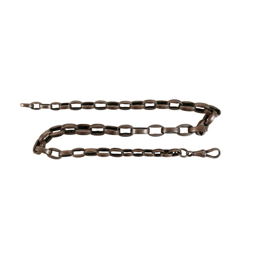 A Victorian low grade yellow gold graduated Albert fob chain, with flattened oval box section links, 9ct gold clasp to one end, testing to approximately 6ct gold or lower, 7.5mm at widest, 36cm long, 18.7g.