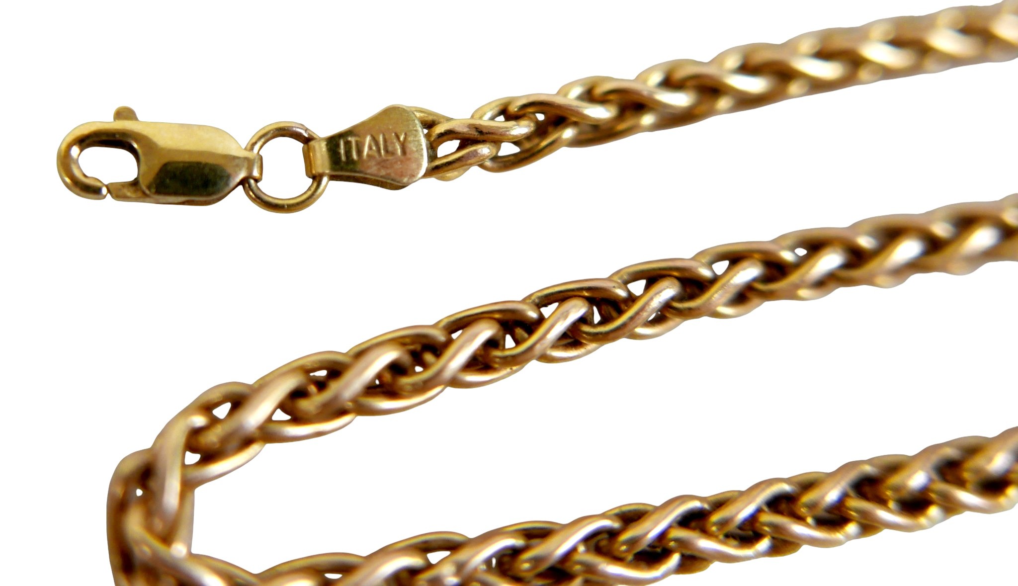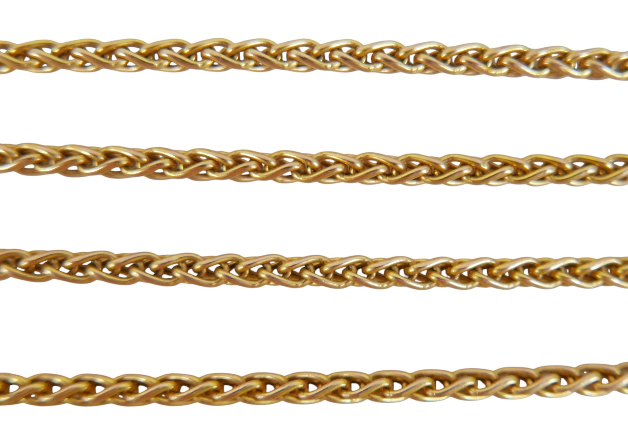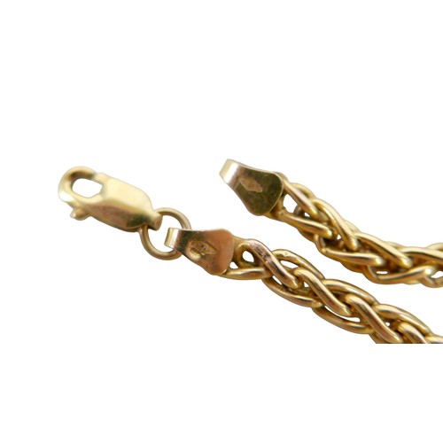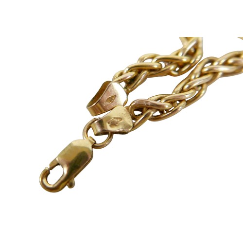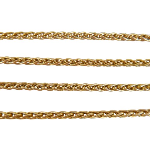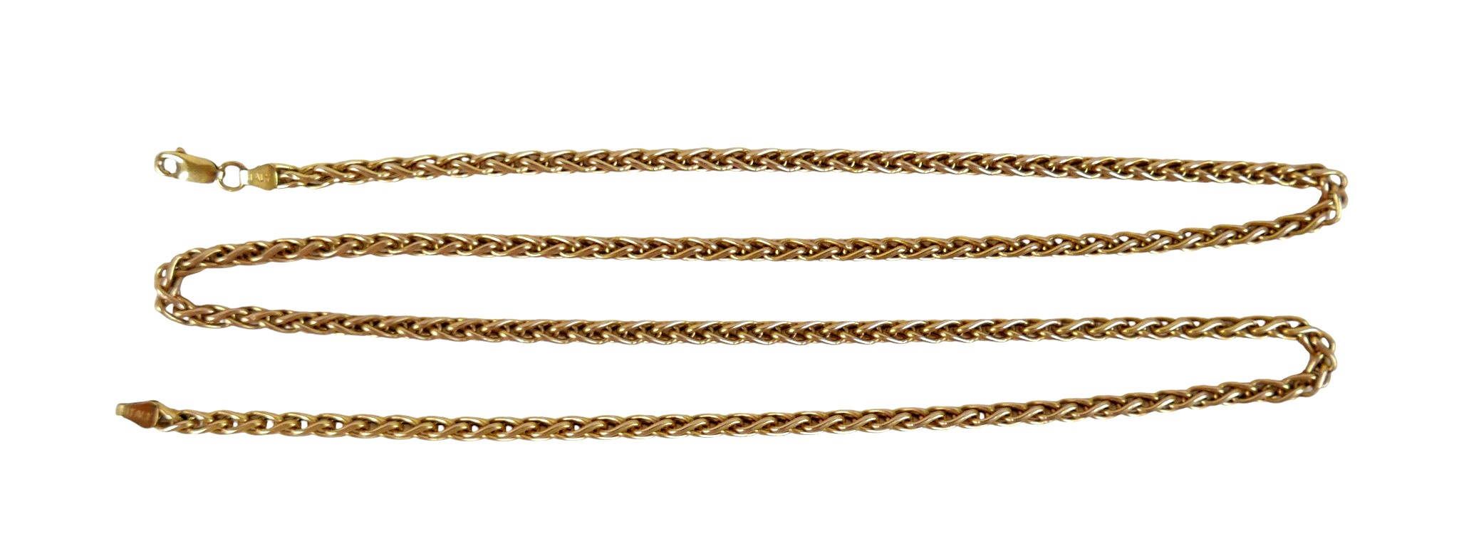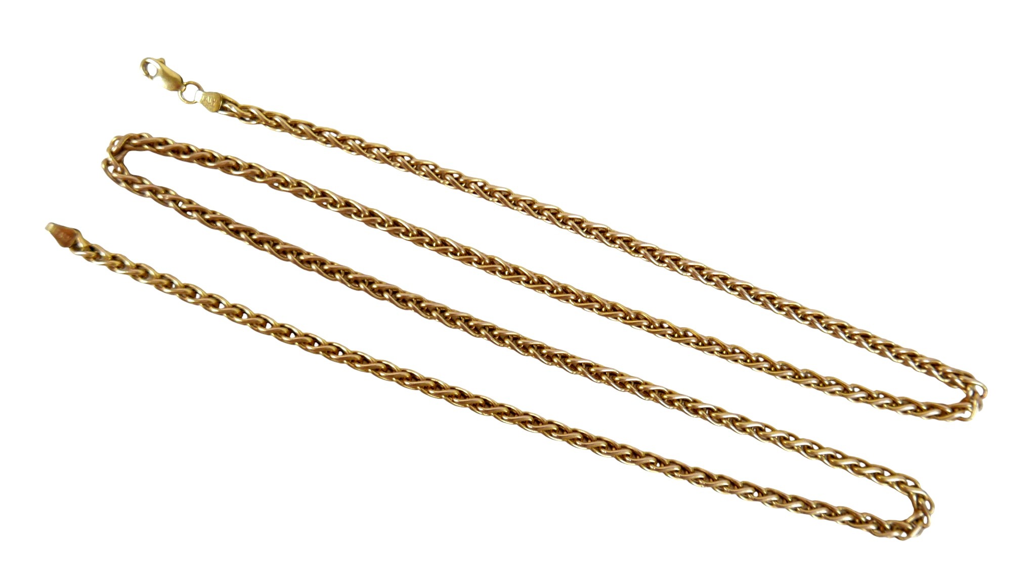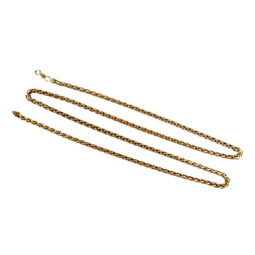 A 9ct yellow gold necklace, spiga links, lobster claw clasp, 4mm wide, 70cm long, 13.5g.