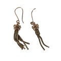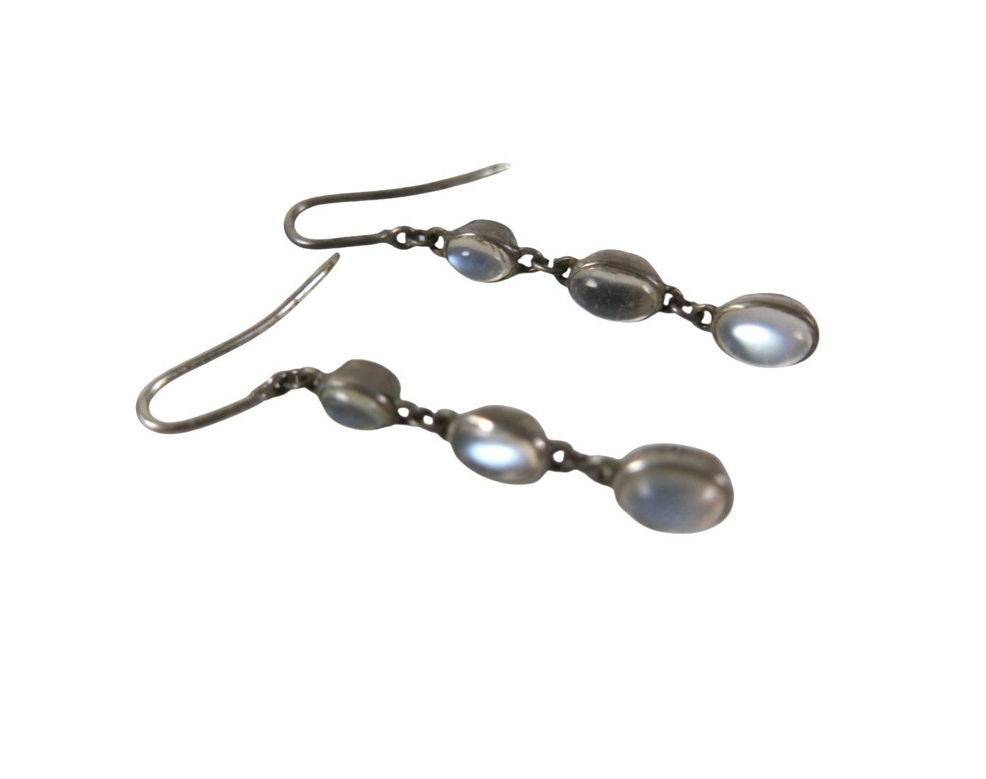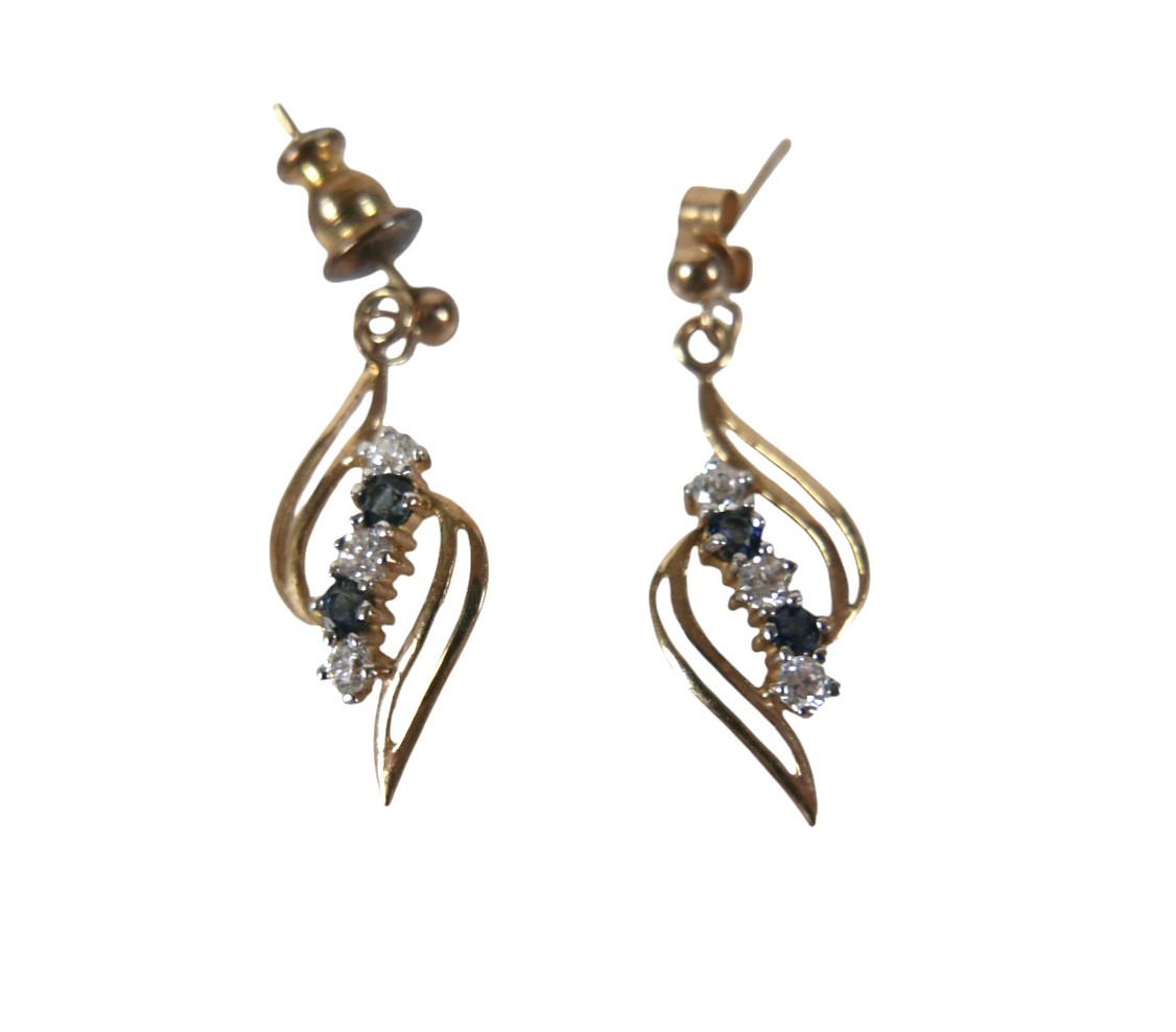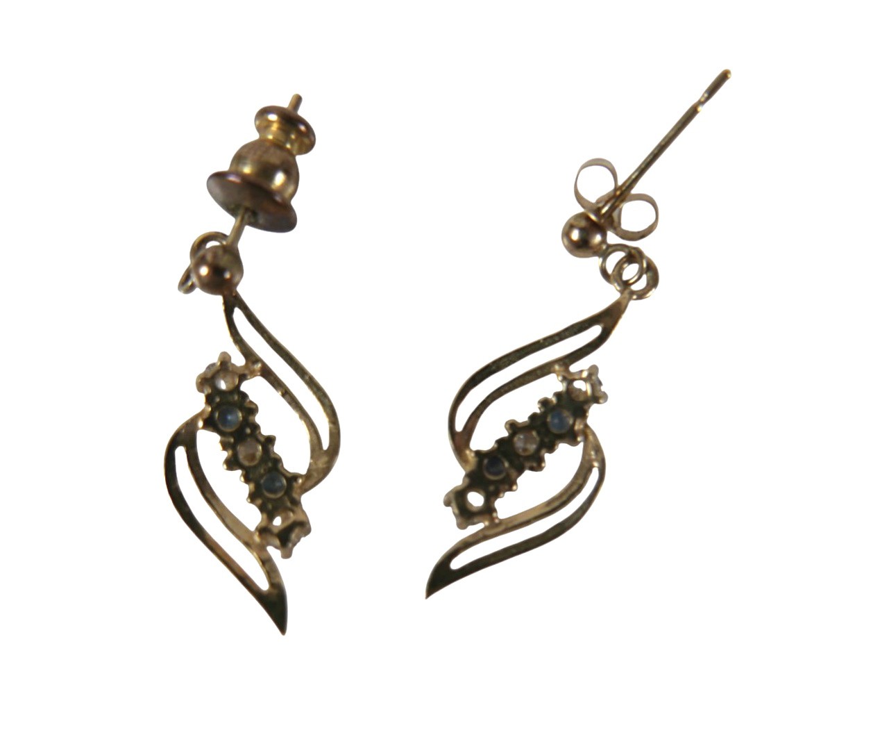 A group of three pairs of earrings, comprising a pair of 9ct gold leaf shaped drop earrings, set with small sapphires and diamonds, 17mm high, a pair of yellow metal tassel form earrings, a/f one hoop damaged, and a pair of silver earrings, with three oval cabochon pendant drops, 36mm high, total combined gross weight 7.9g. (6)