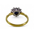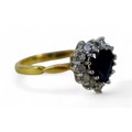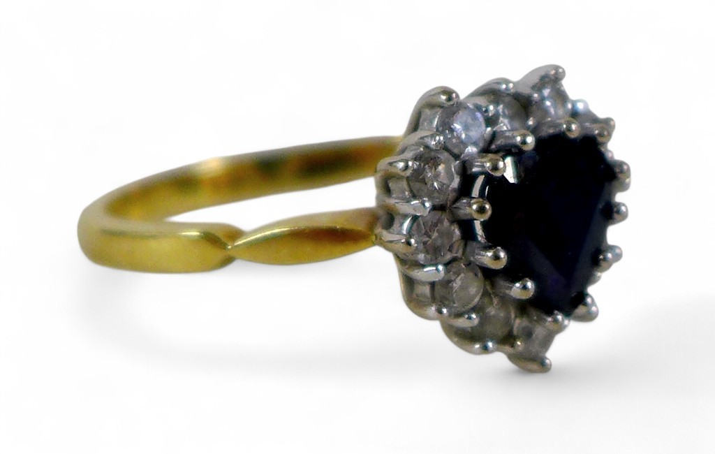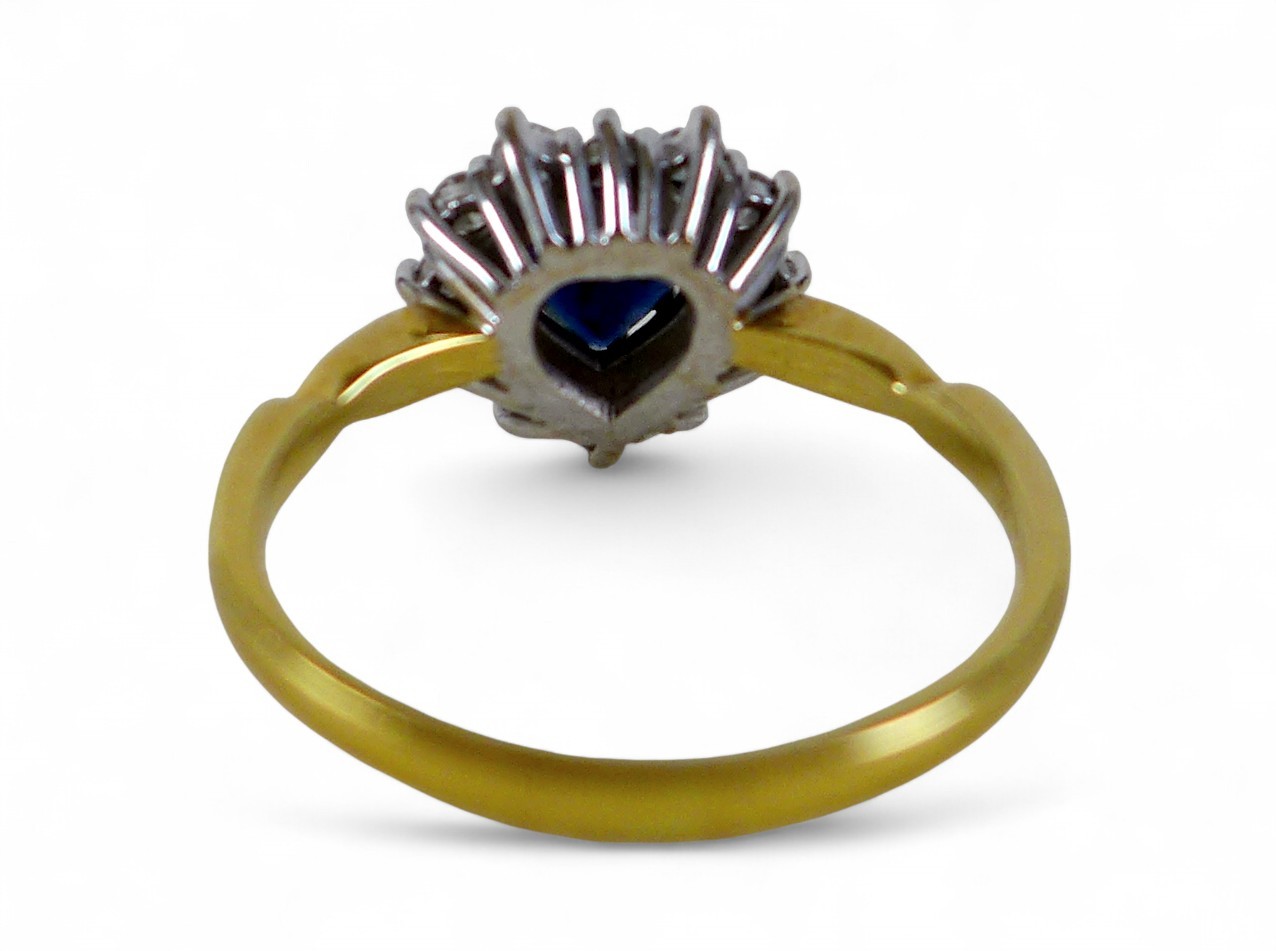 A 9ct yellow gold, sapphire and diamond ring, set with heart shaped dark blue sapphire, 6 by 6 by 3mm, surrounded by twelve round cut diamonds, each 2.0mm, size L, 3.2g, with Insurance Valuation dated 1992.