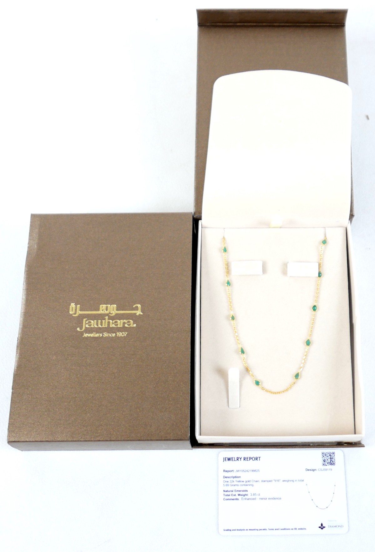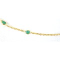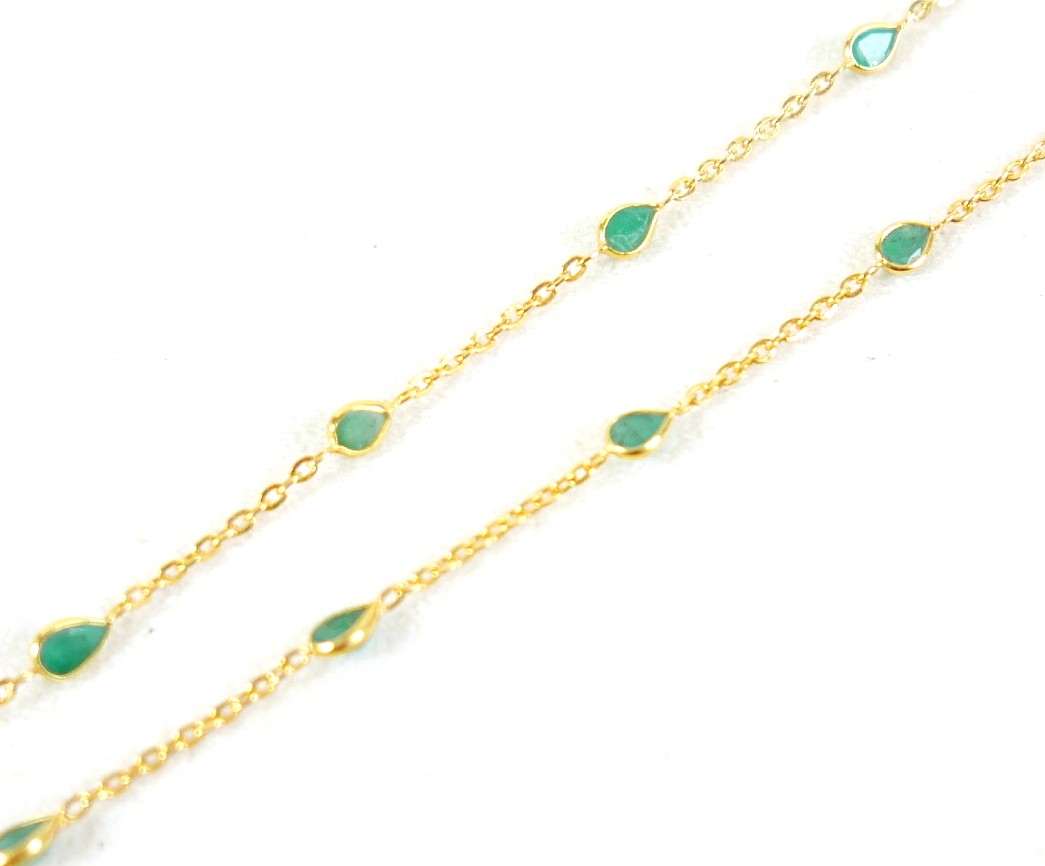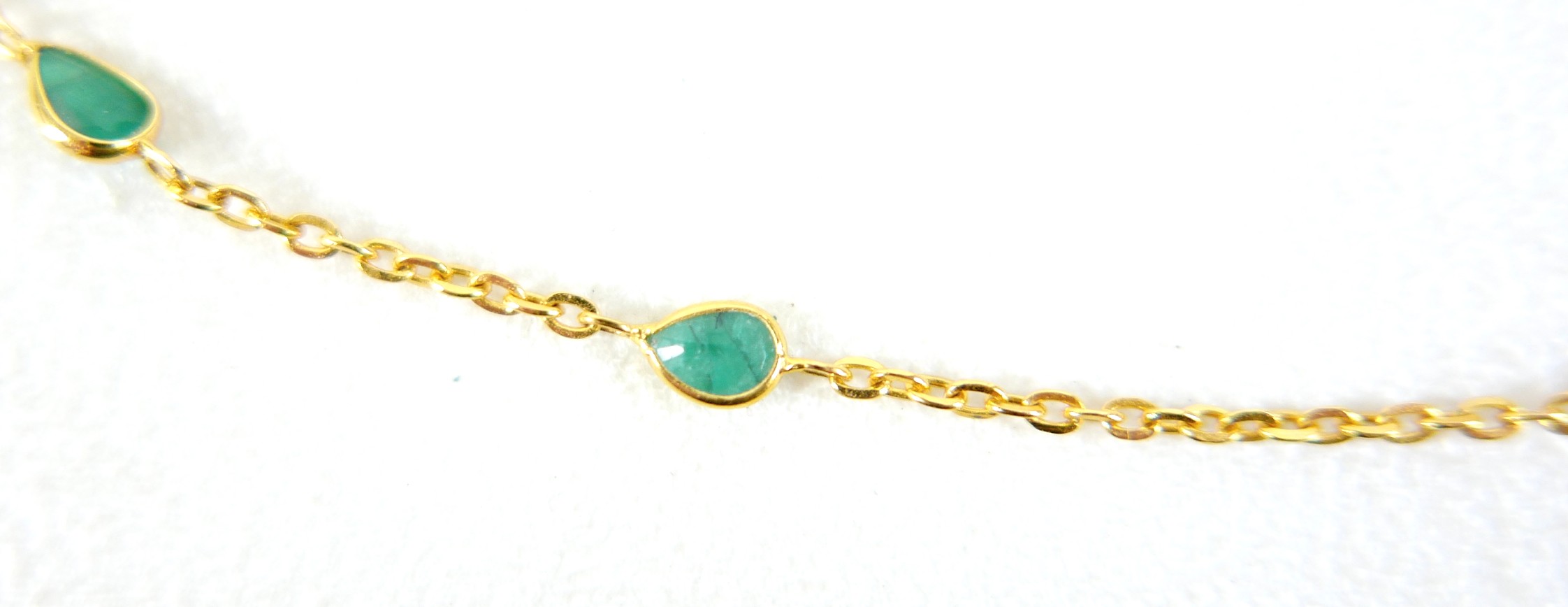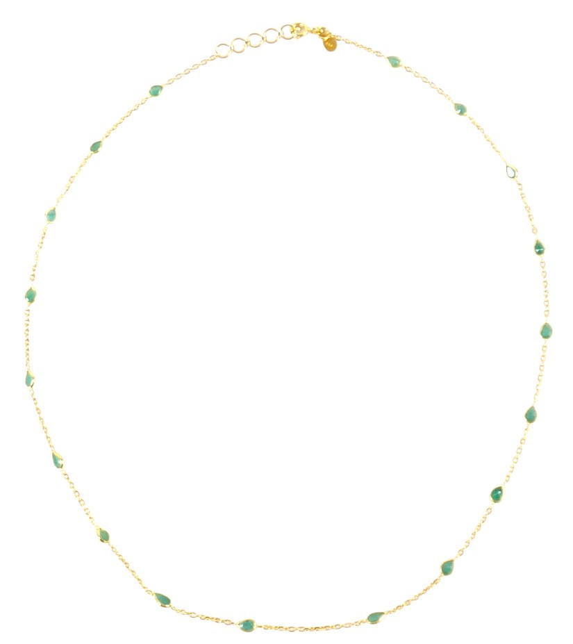 A 22ct yellow gold and emerald necklace, set with eighteen tear drop emeralds estimated weight 3.85ct, stamped 916, 48cm by 3.5mm, 5.6g, with I.D.L. report, from Jawhara Jewellers.