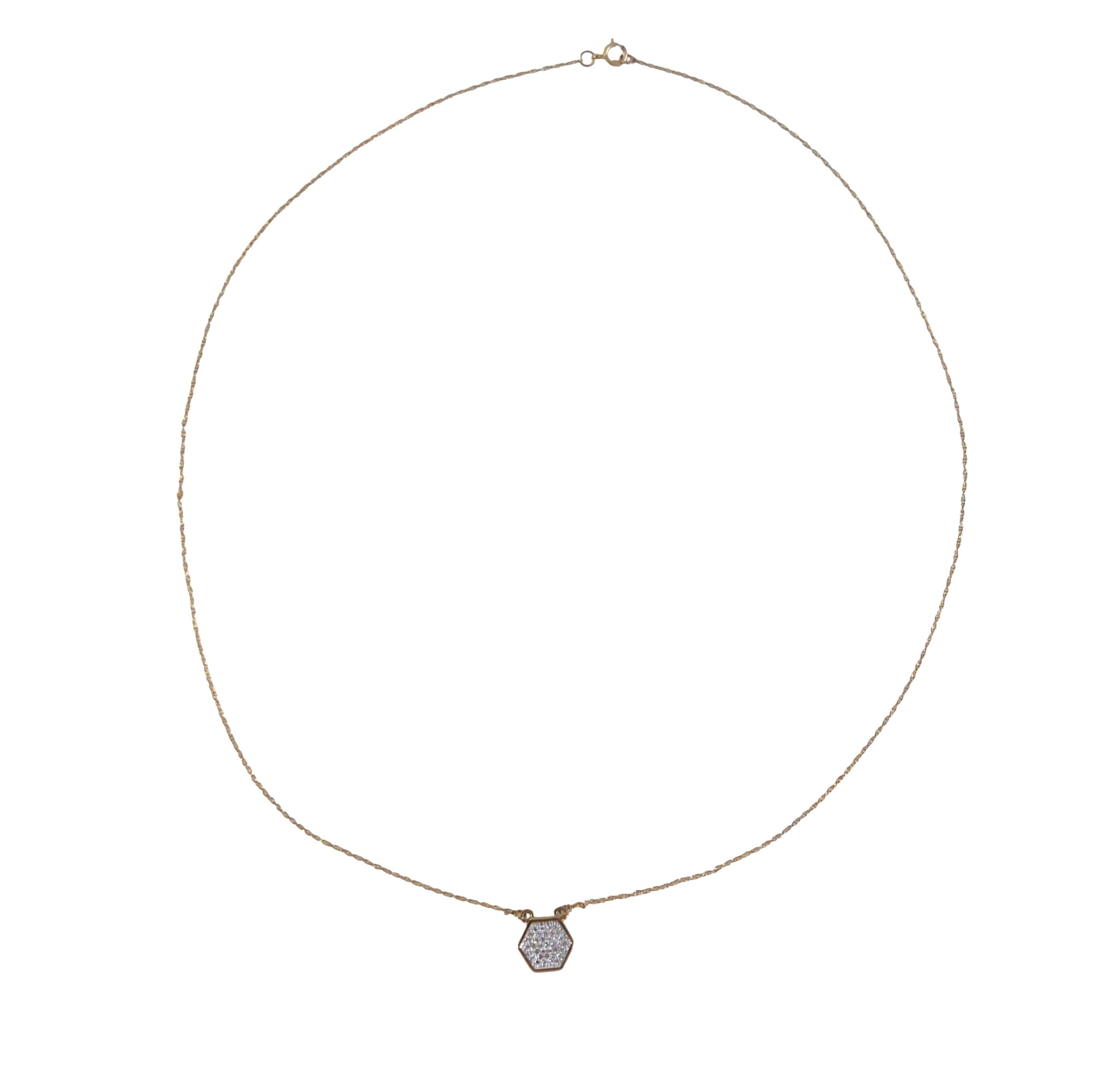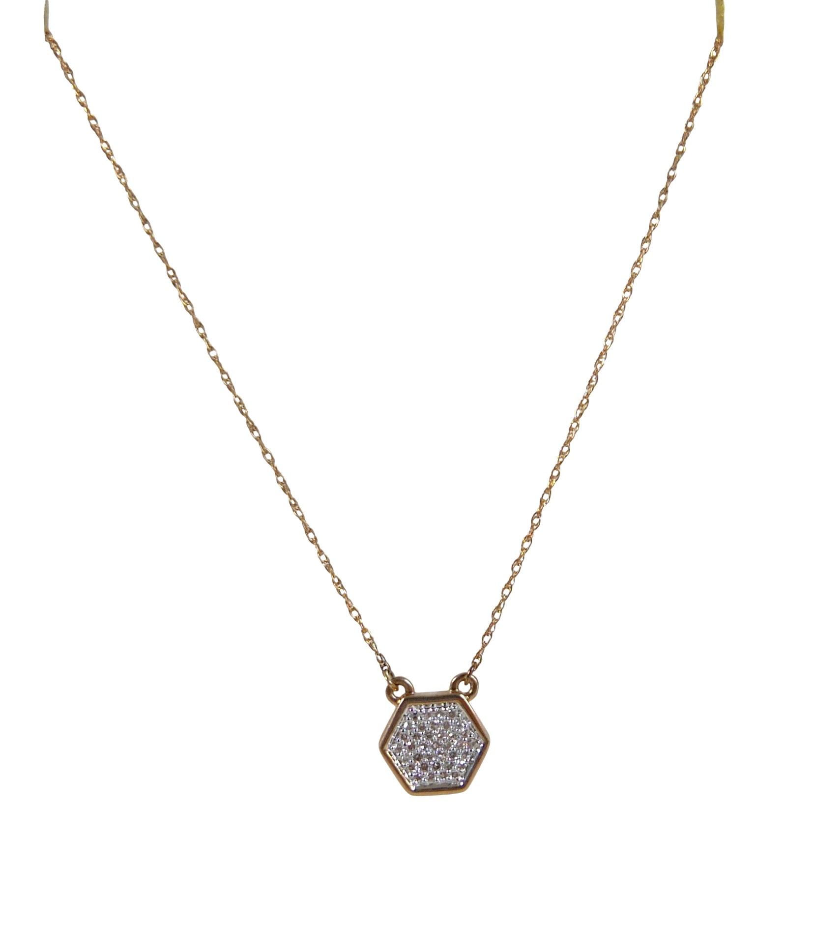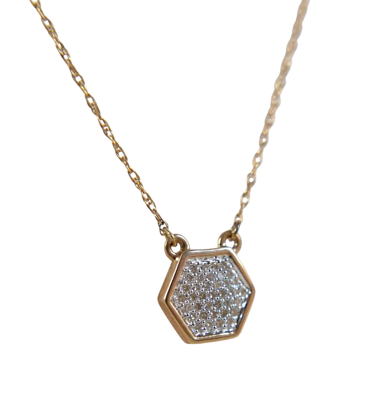 A 9ct yellow gold and diamond set pendant, of hexagonal form, 18mm, on fine chain, 40cm long, 1.3g.