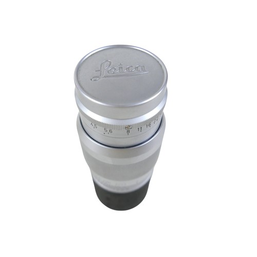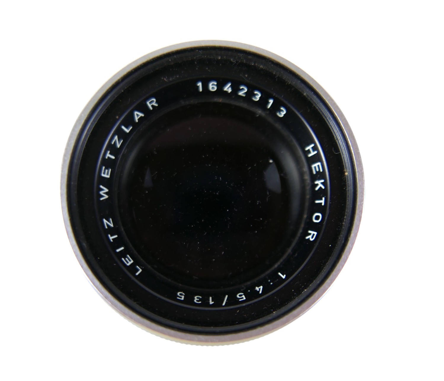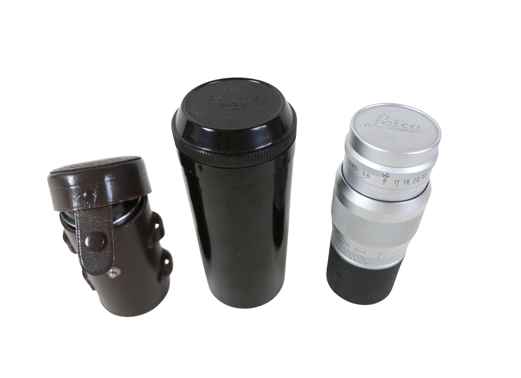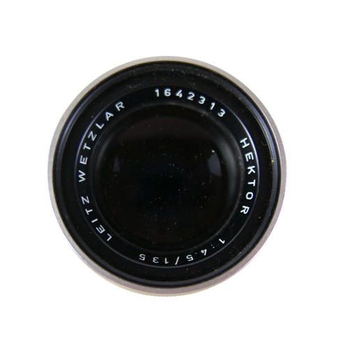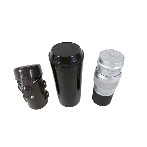 Three Ernst Leitz Wetzlar camera lens Elmar f=9cm 1:4 no 653302 and f=9cm 1:4 no 615974, both with cases and caps, and a Leitz Wetzlar Hektor f=4.5 13.5cm Lens, serial number 1642313. (3)