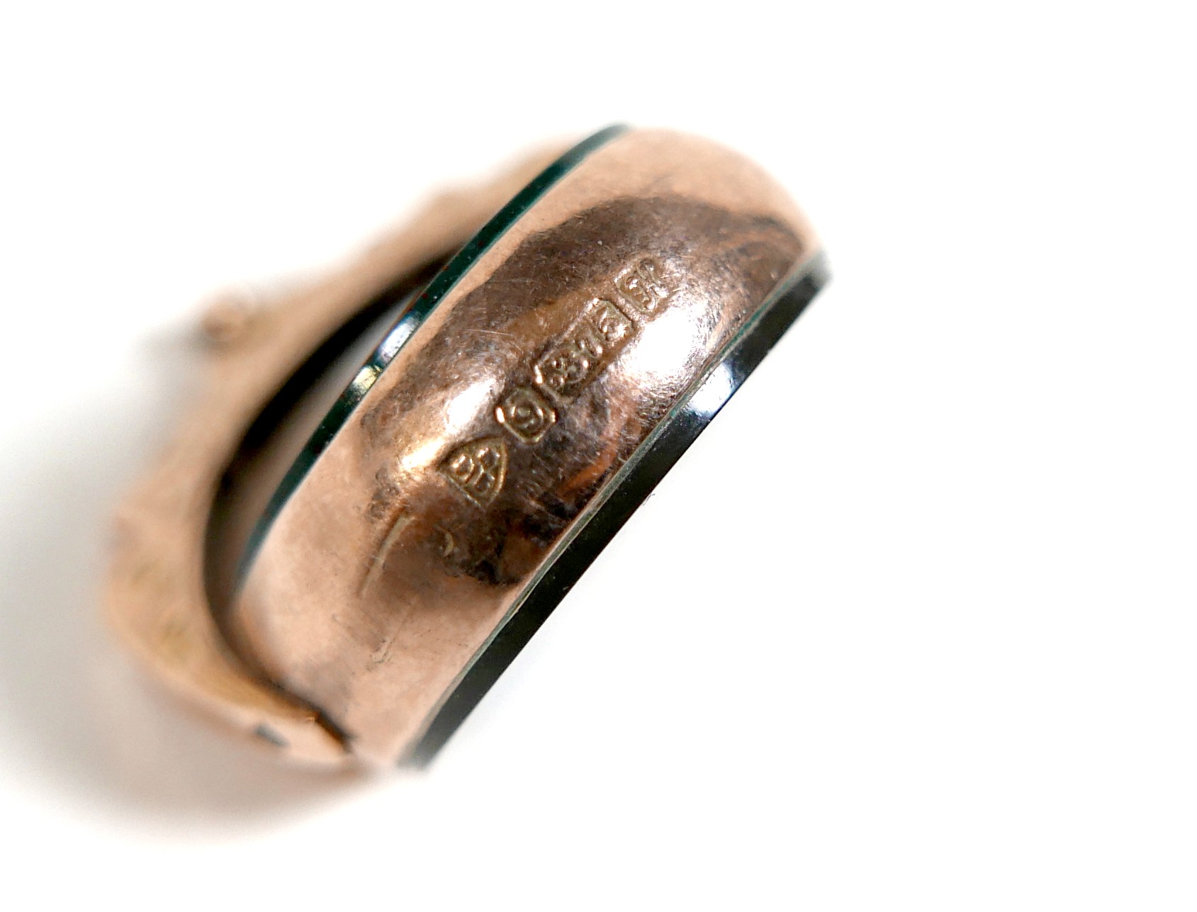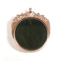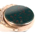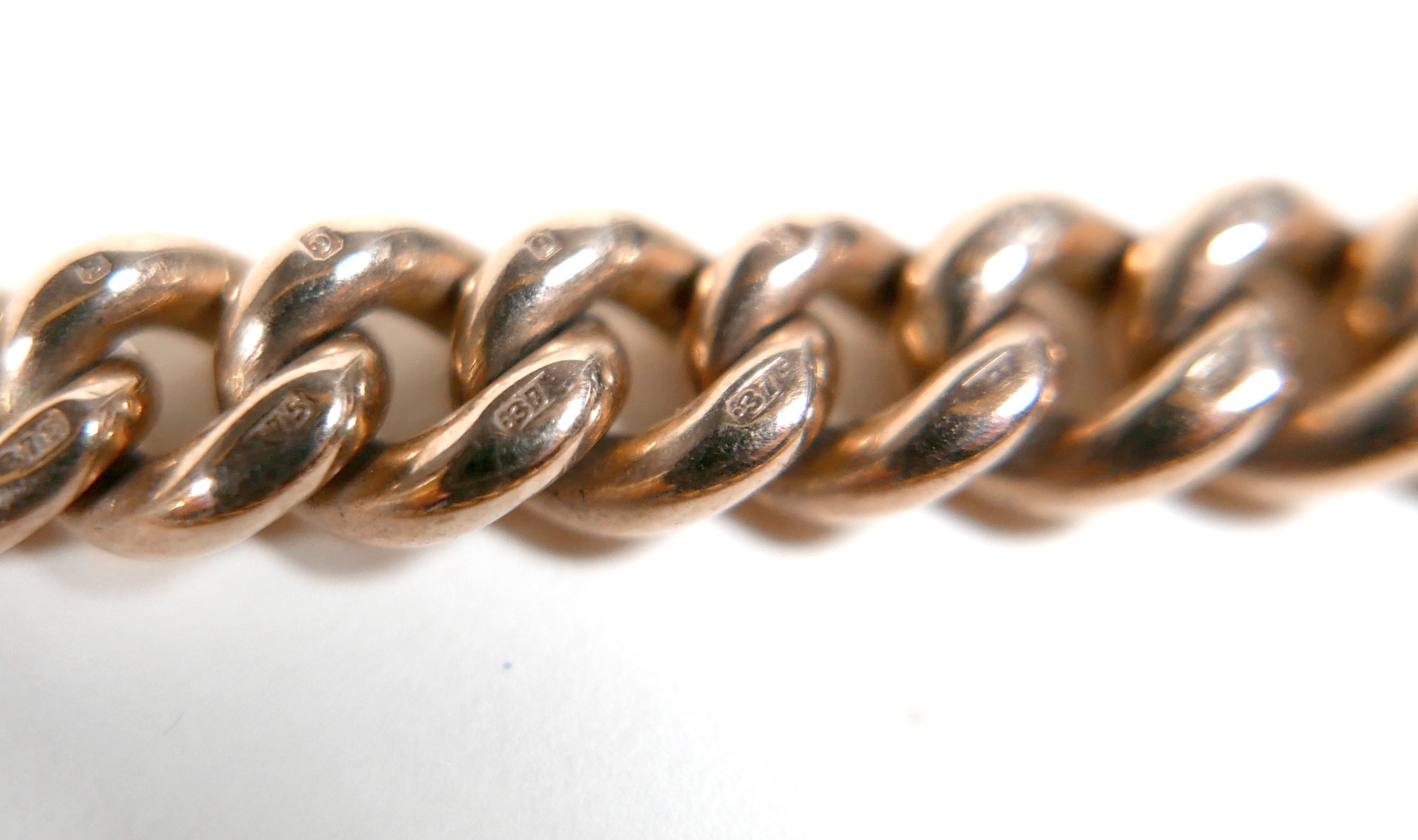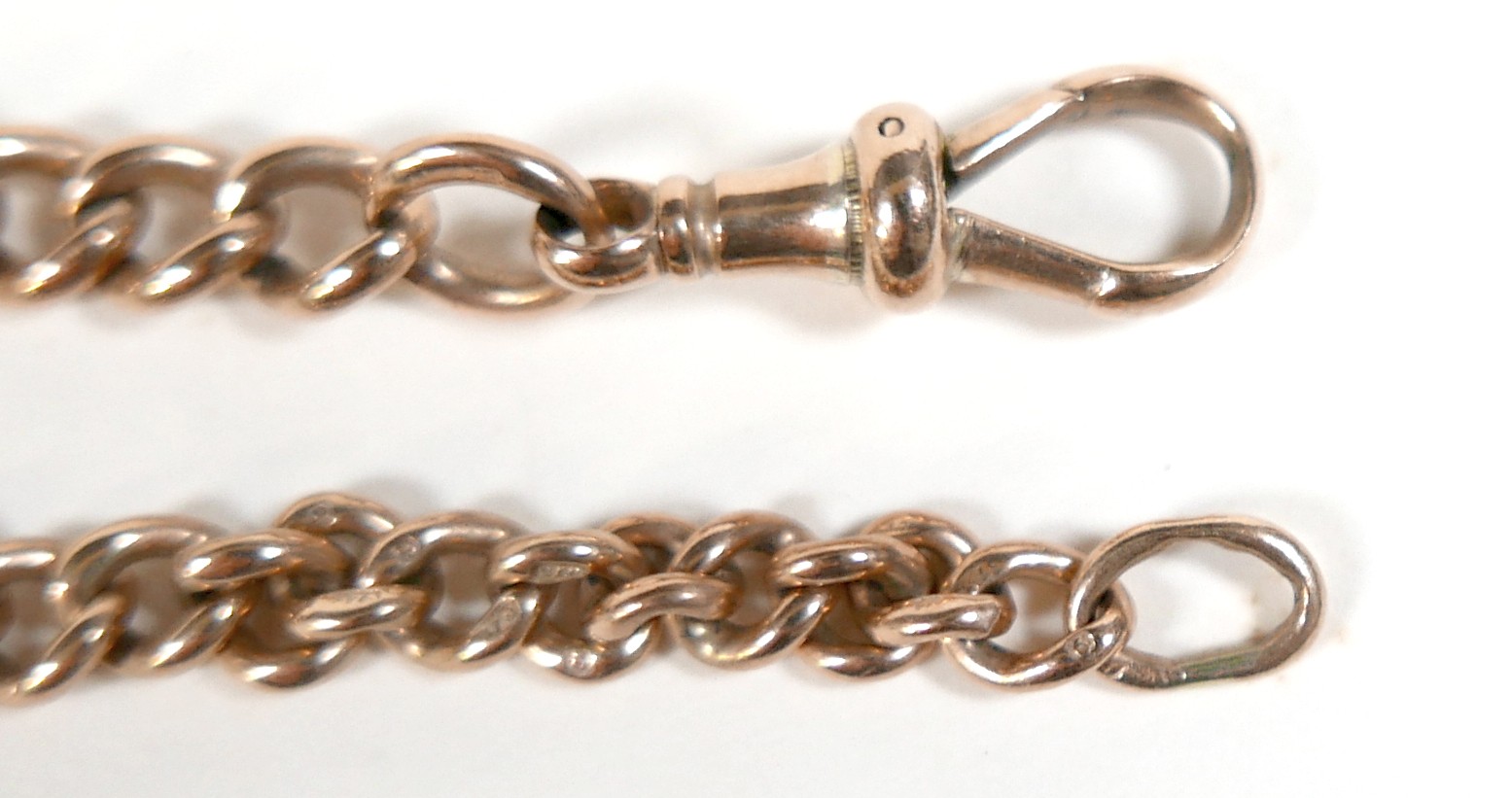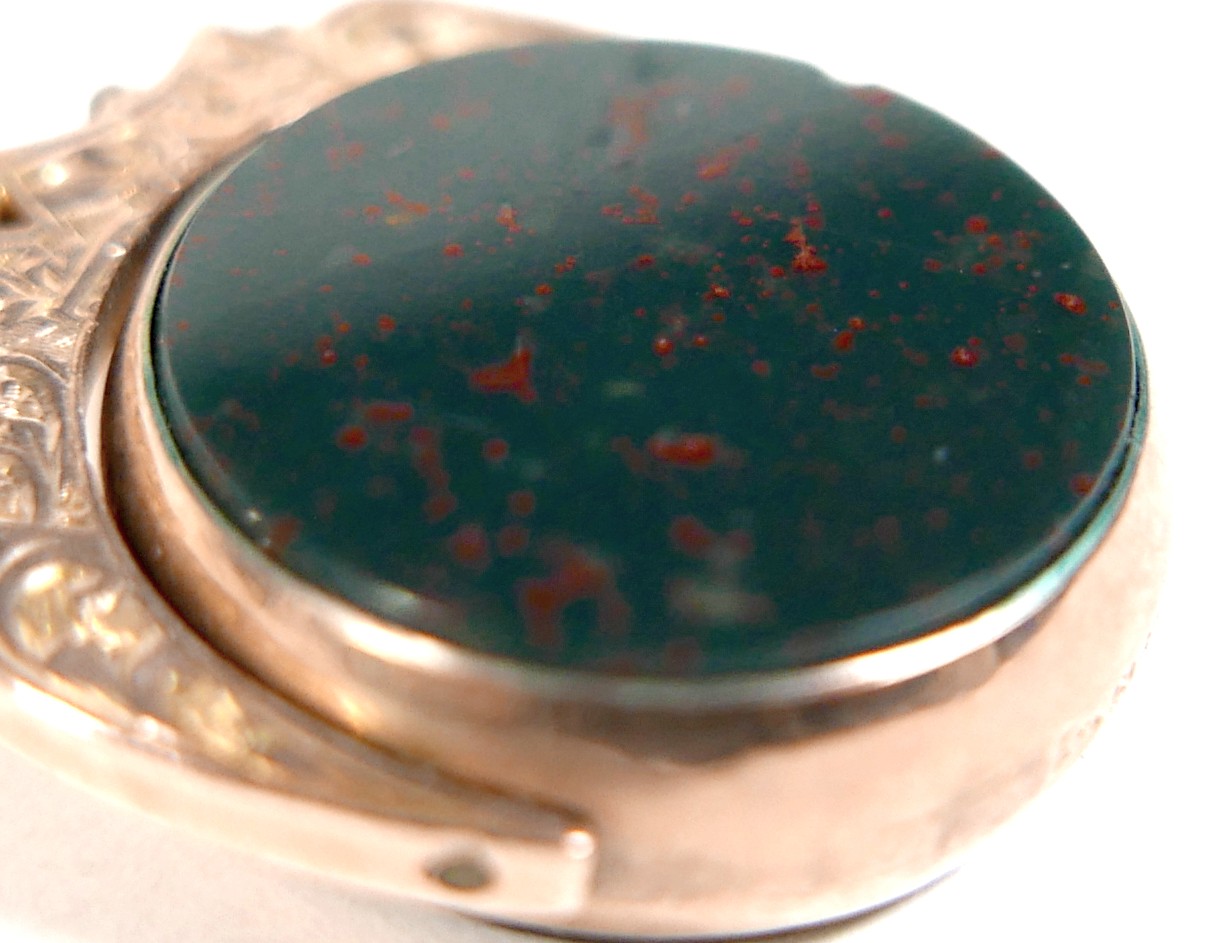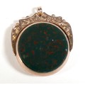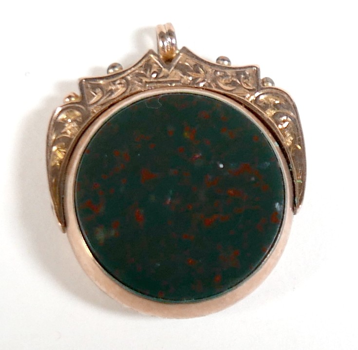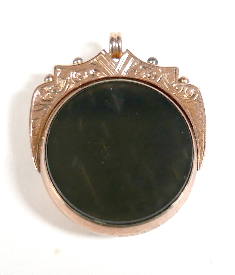 A Victorian 9ct yellow gold graduating Albert fob watch chain, each link marked '375, 9', graduating from 5mm to 9mm, 37cm long, together with a 9ct yellow gold and bloodstone swivel fob, total weight 55.4g. (2)