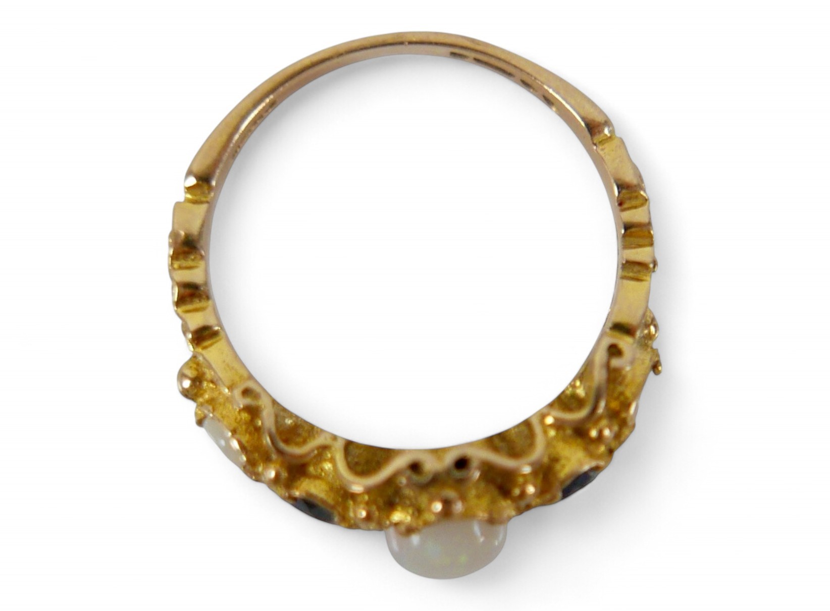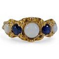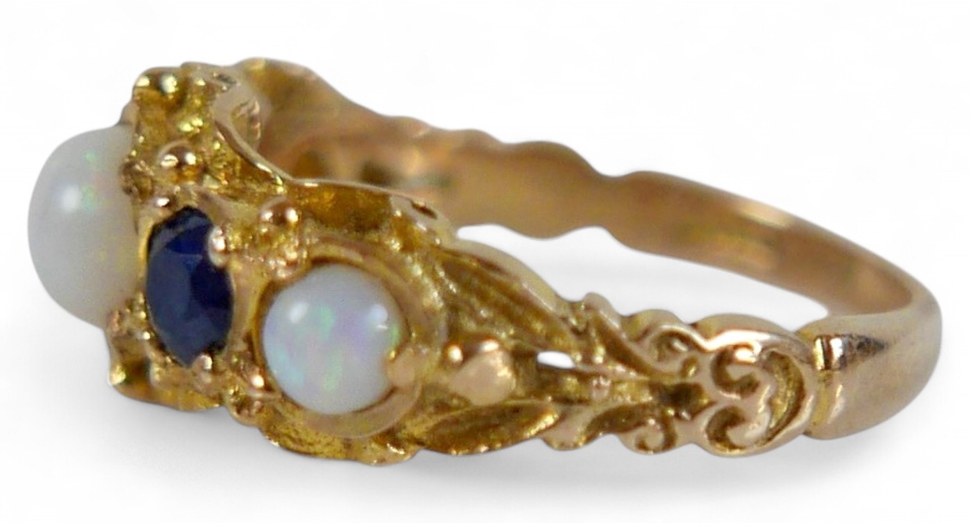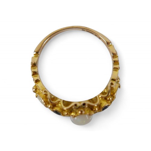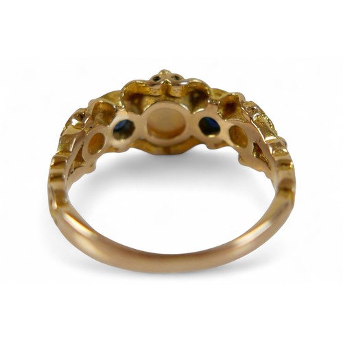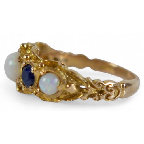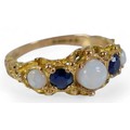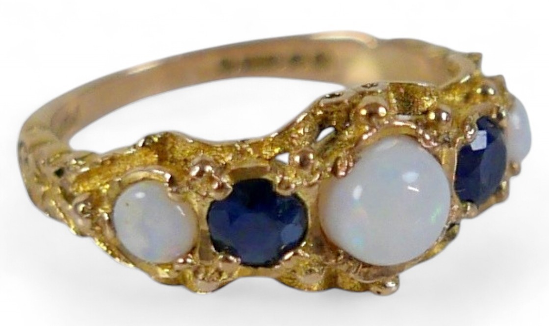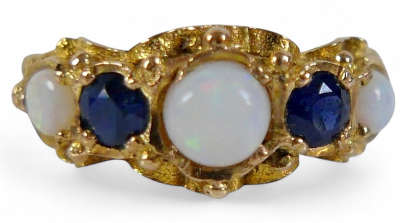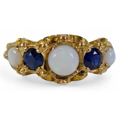 A 9ct yellow gold opal and sapphire five stone ring head width 8mm, ring size L, 3.2g.