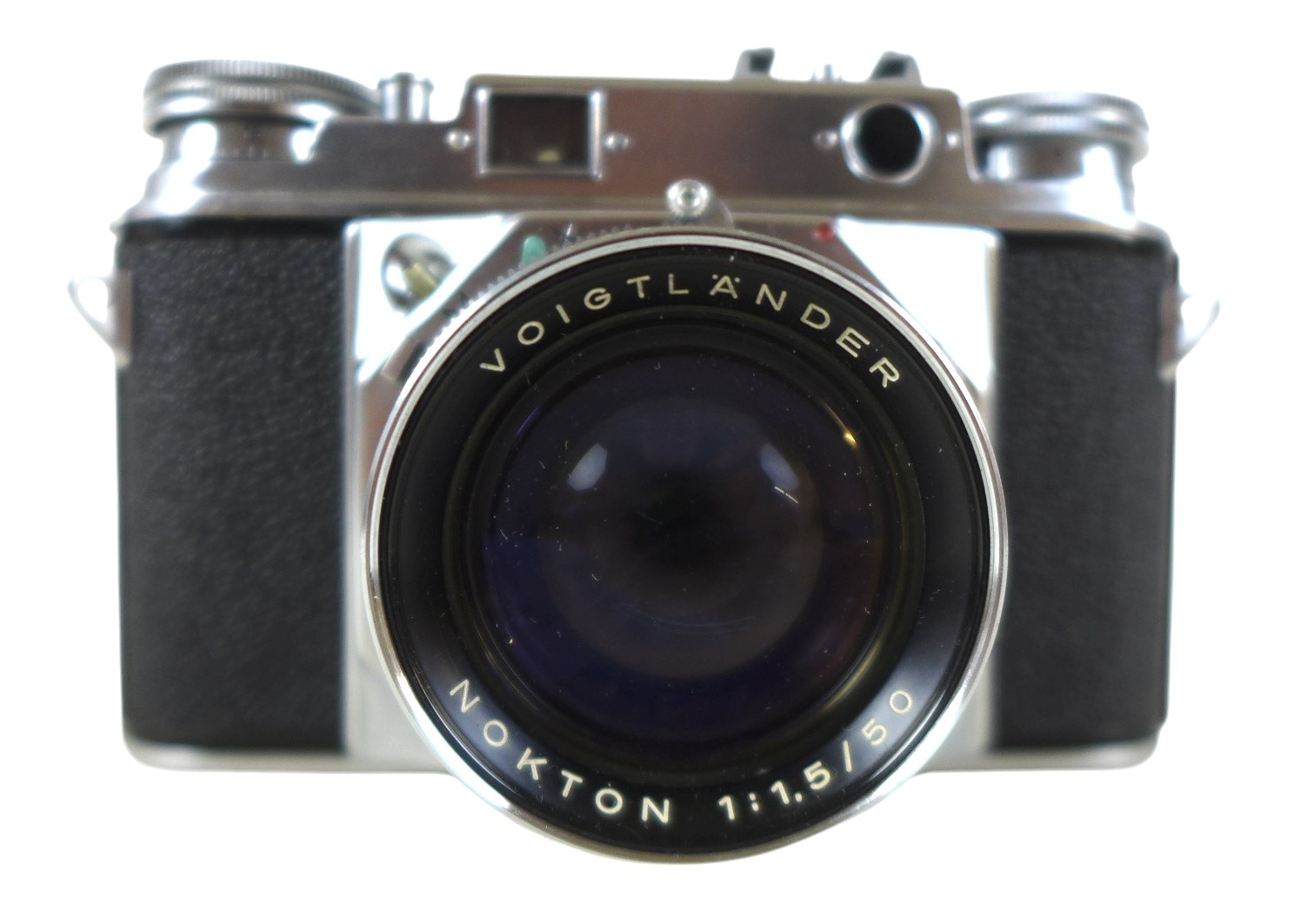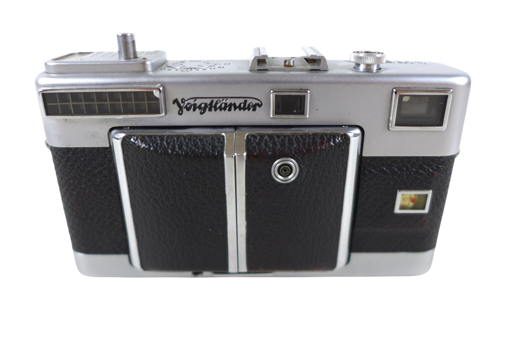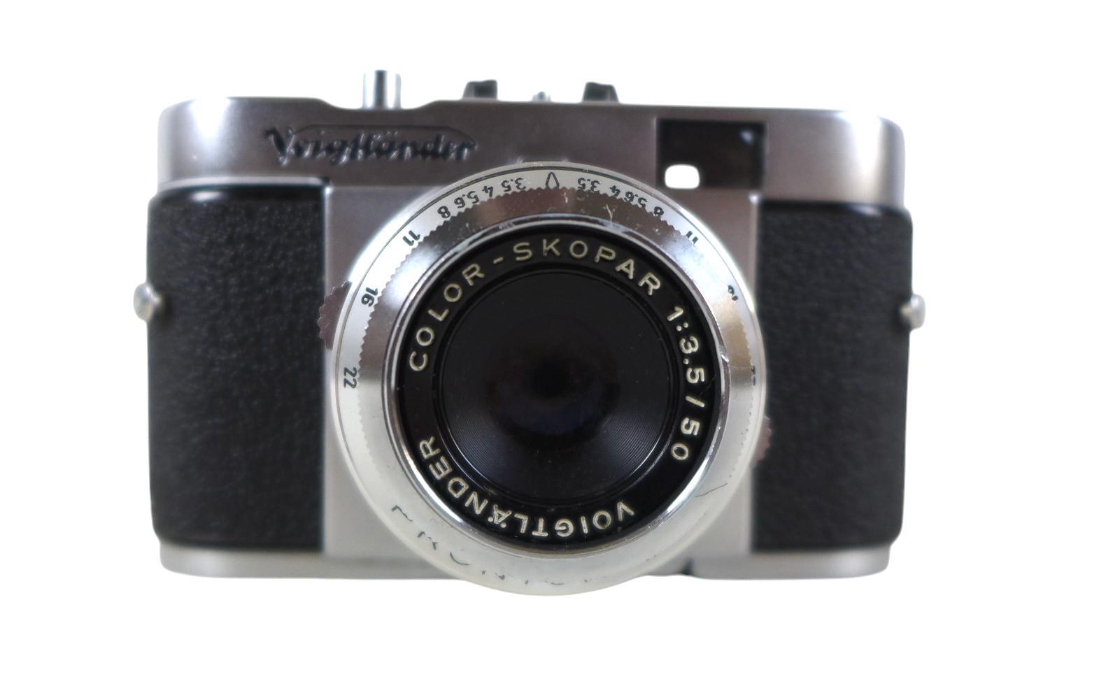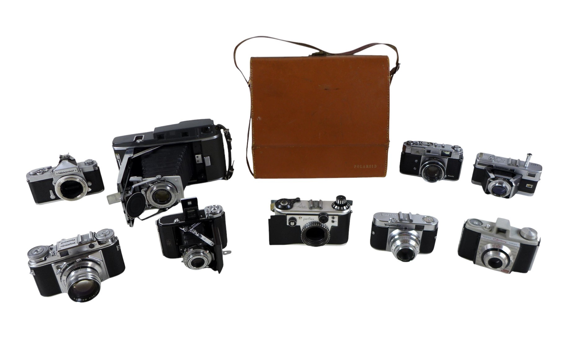 A collection of nine vintage cameras comprising a Polaroid land camera, Voigtlander Vito B and Prominent, Corfield perplex body, Beauty Super L, Voigtlander Vitessa, Nikkormat body, Colorsnap Bantam, and a Zeiss Ikon.(9)
