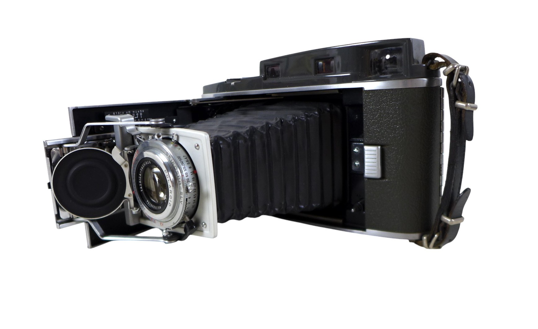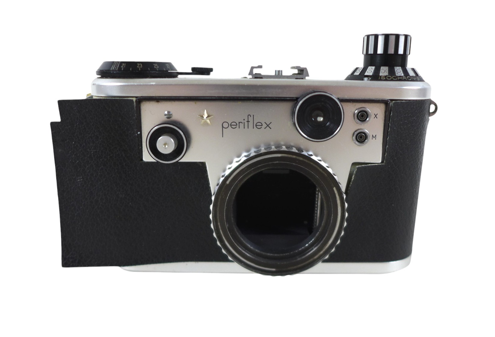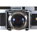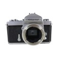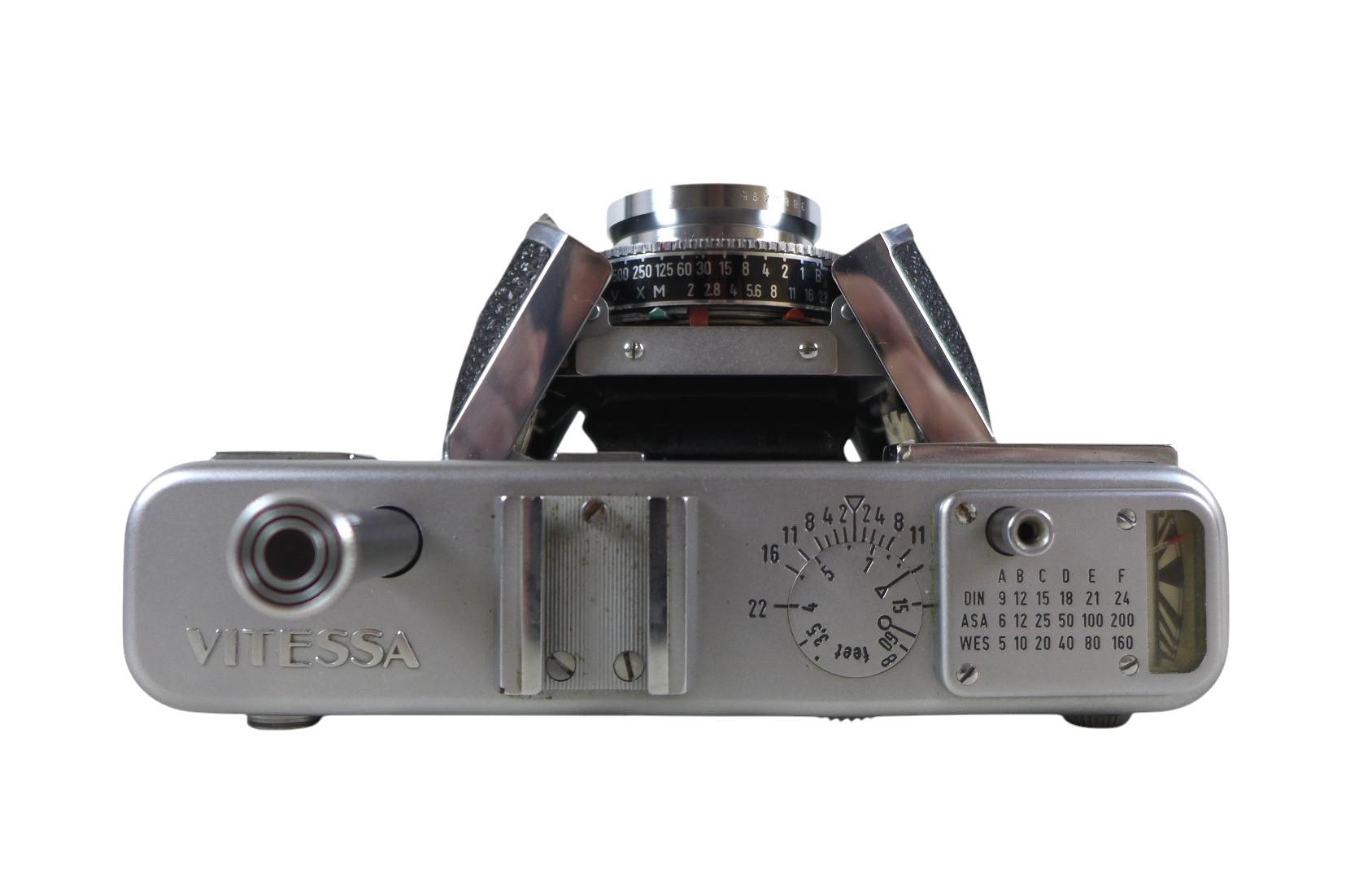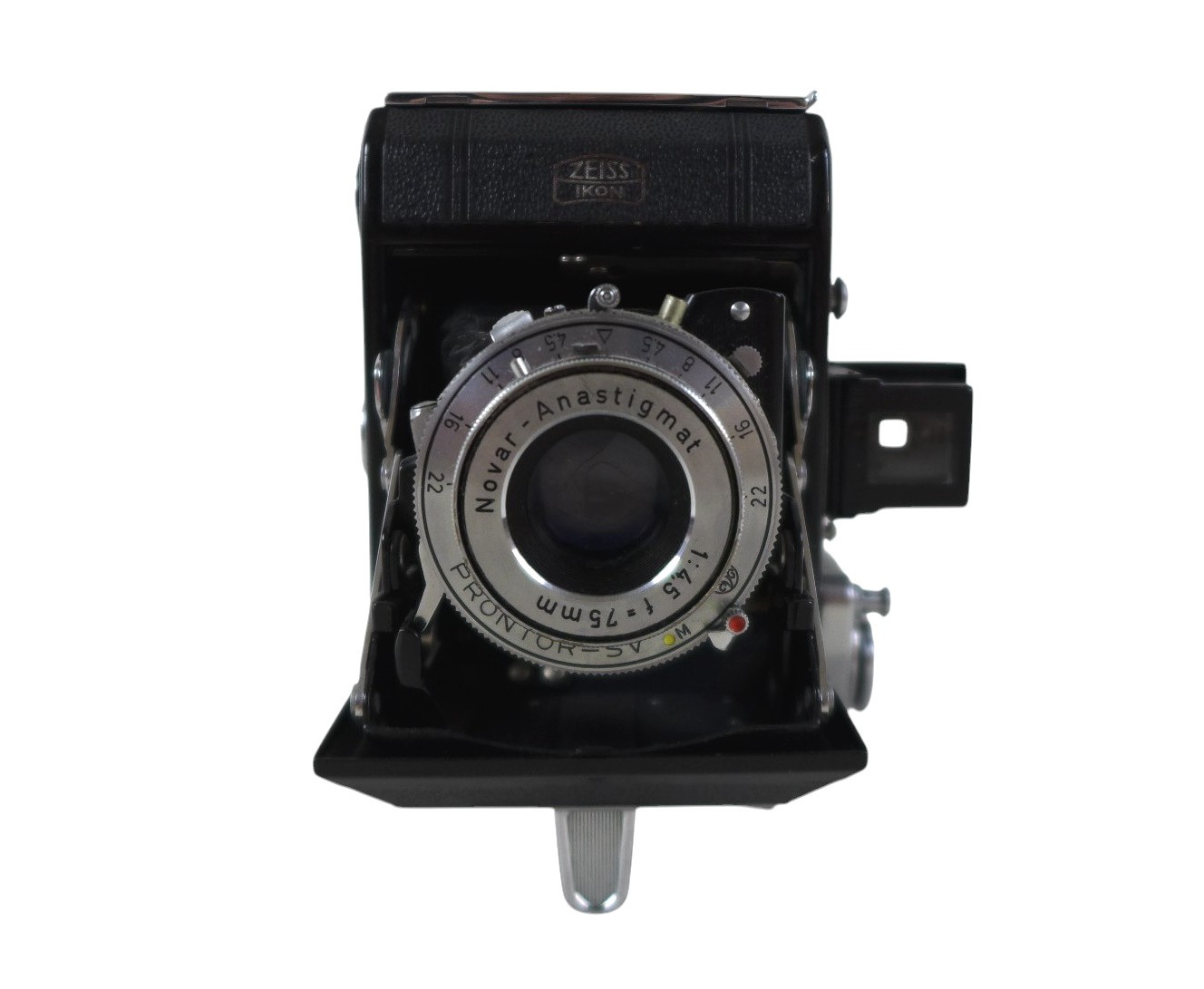 A collection of nine vintage cameras comprising a Polaroid land camera, Voigtlander Vito B and Prominent, Corfield perplex body, Beauty Super L, Voigtlander Vitessa, Nikkormat body, Colorsnap Bantam, and a Zeiss Ikon.(9)