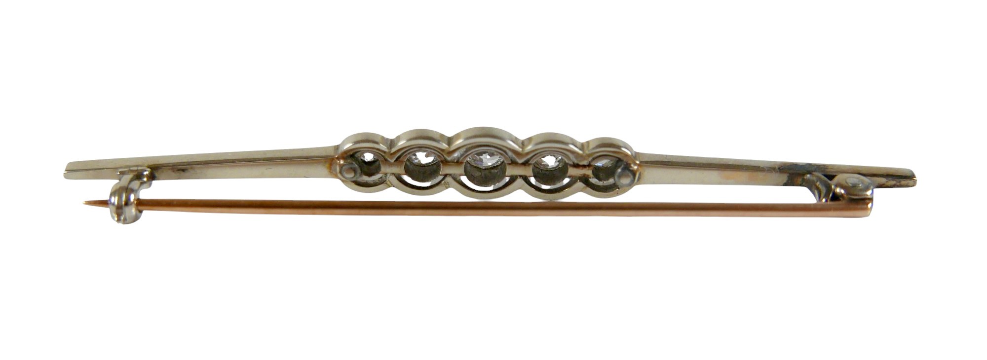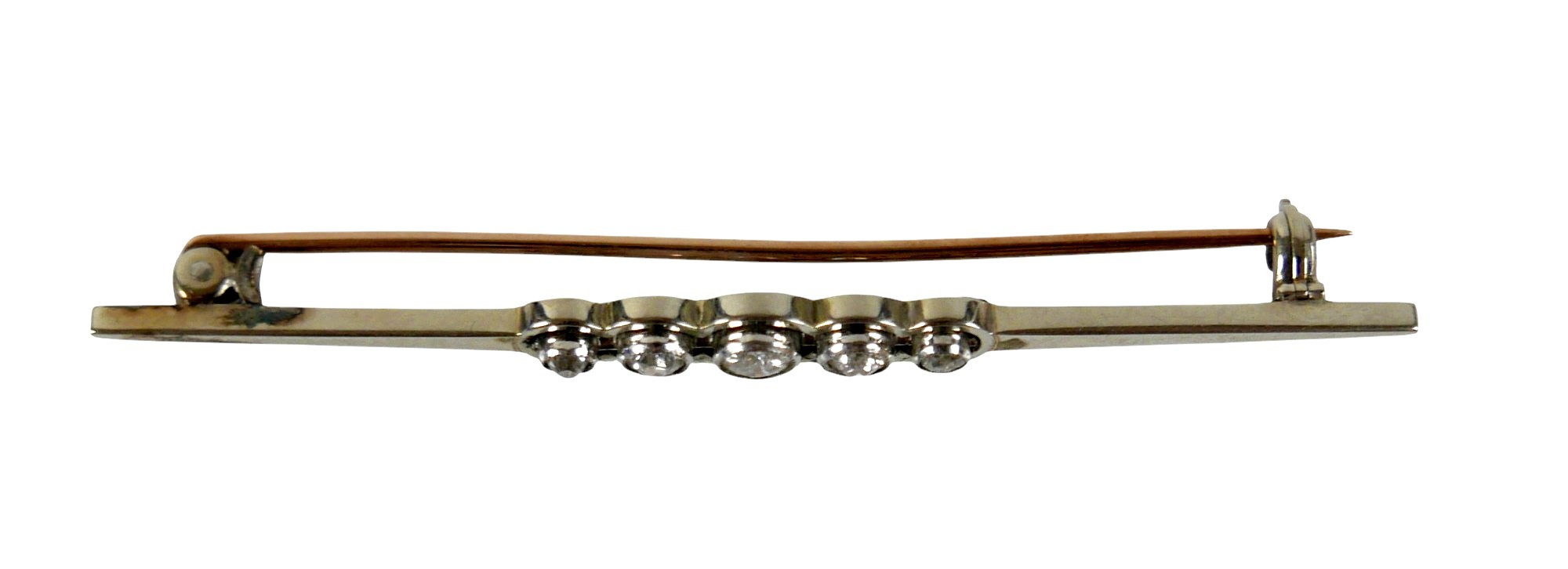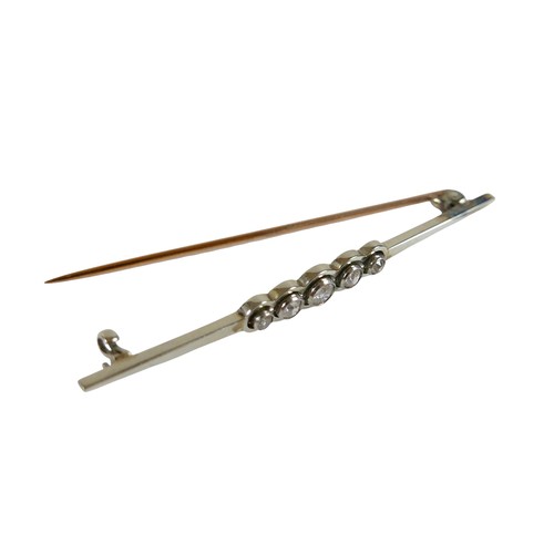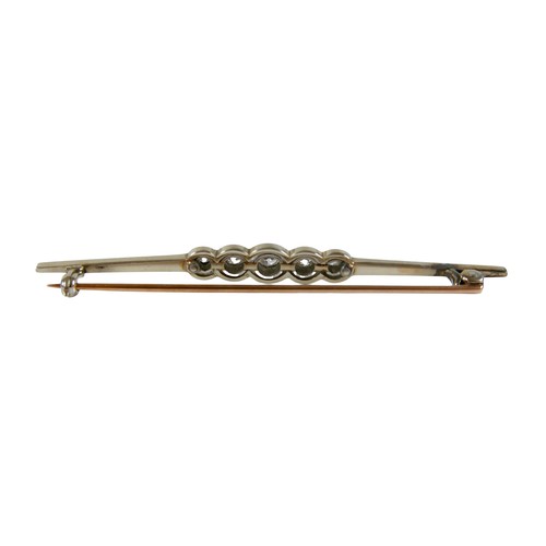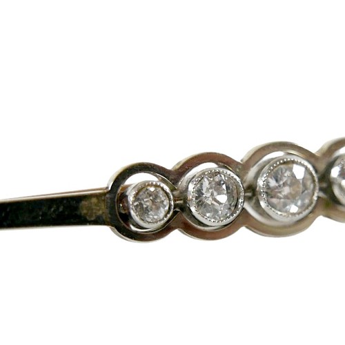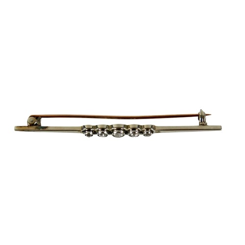 A white and yellow gold bar brooch, with a row of round brilliant cut diamonds, largest 3.0 by 1.8mm, 6 by 63mm, 4.3g.