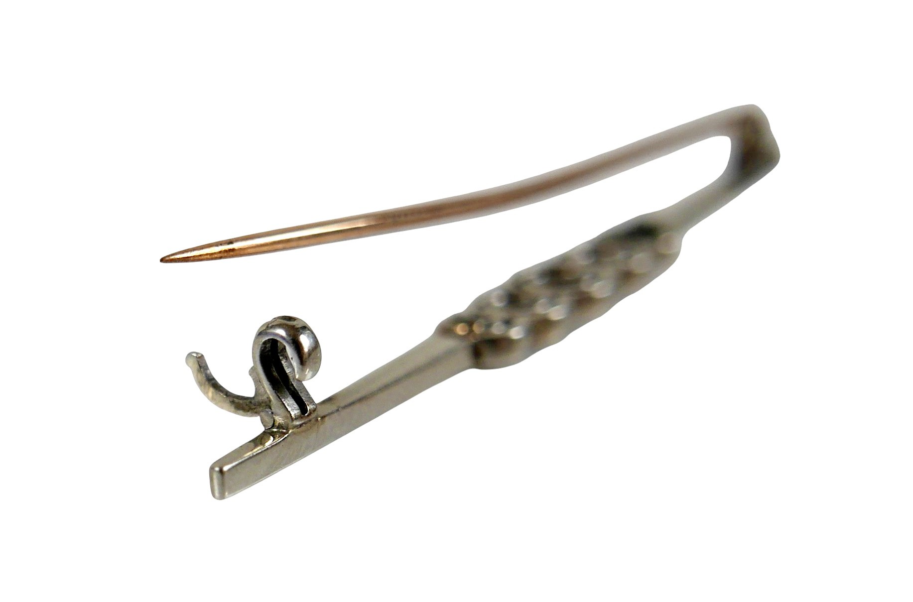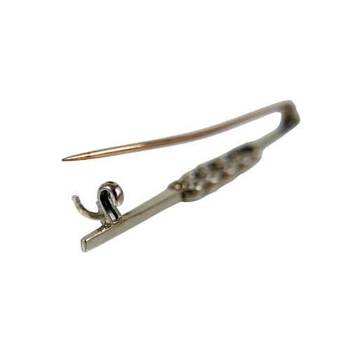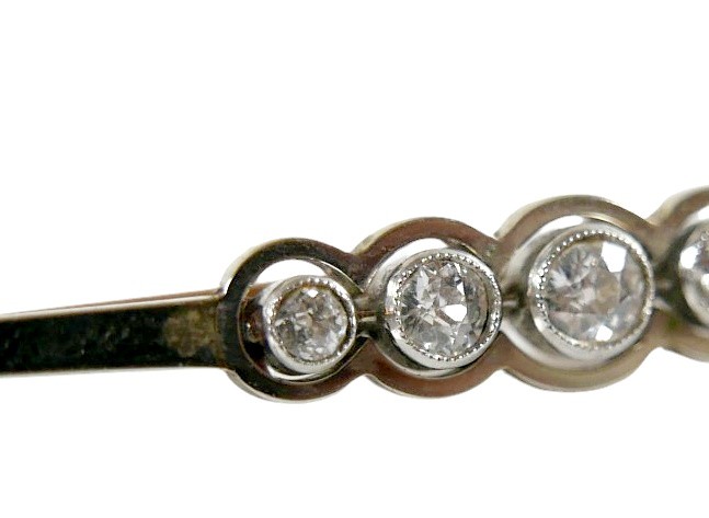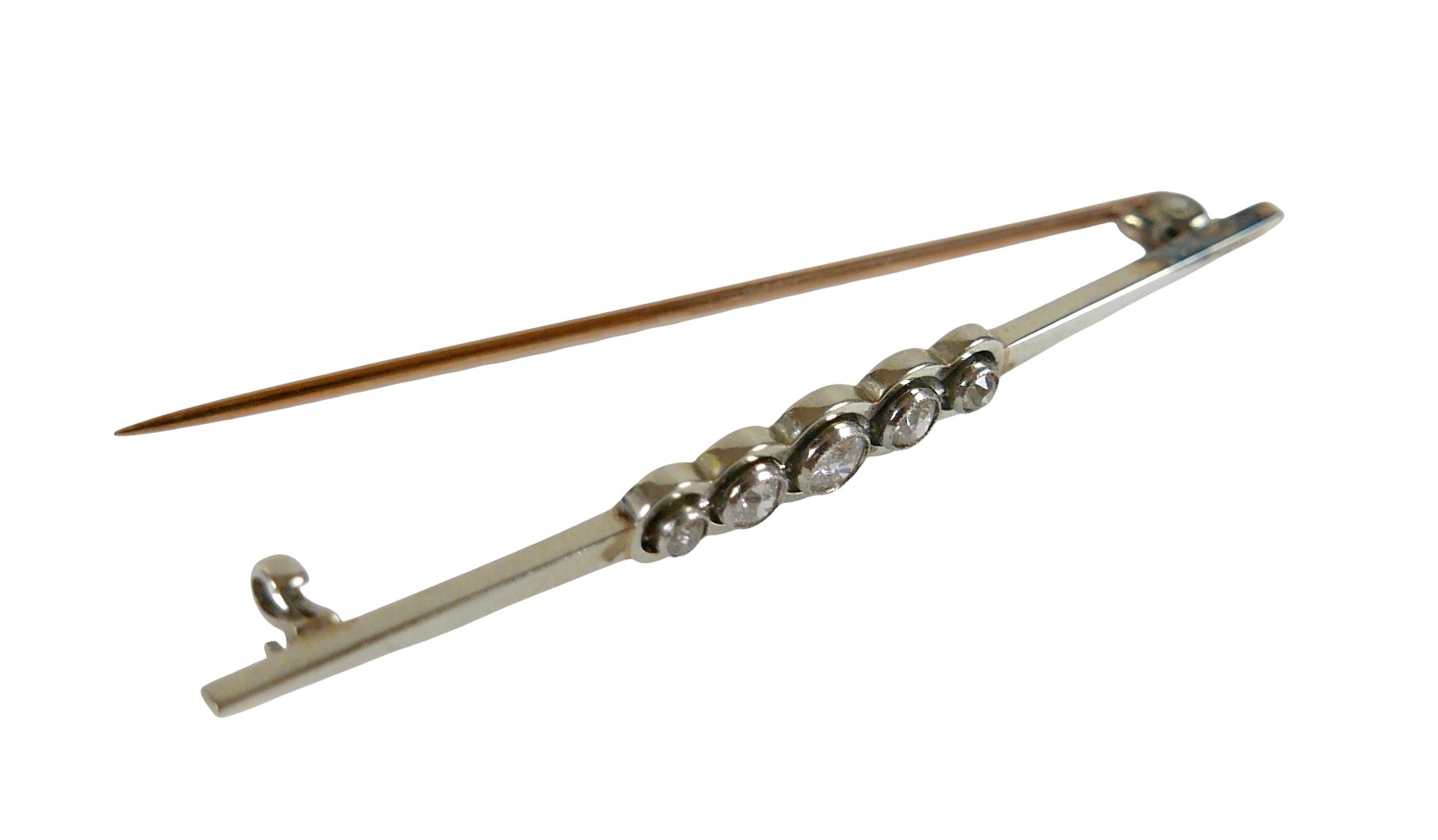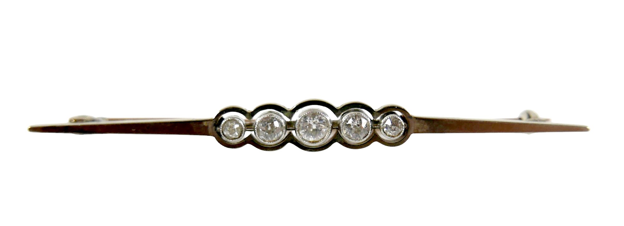 A white and yellow gold bar brooch, with a row of round brilliant cut diamonds, largest 3.0 by 1.8mm, 6 by 63mm, 4.3g.
