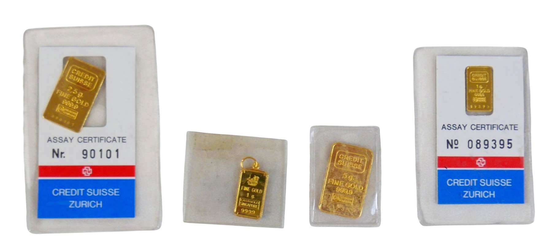 Four yellow gold ingots of 999.9 fine gold comprising 5g, 2.5g, and two 1g, total 9.5g.(4)