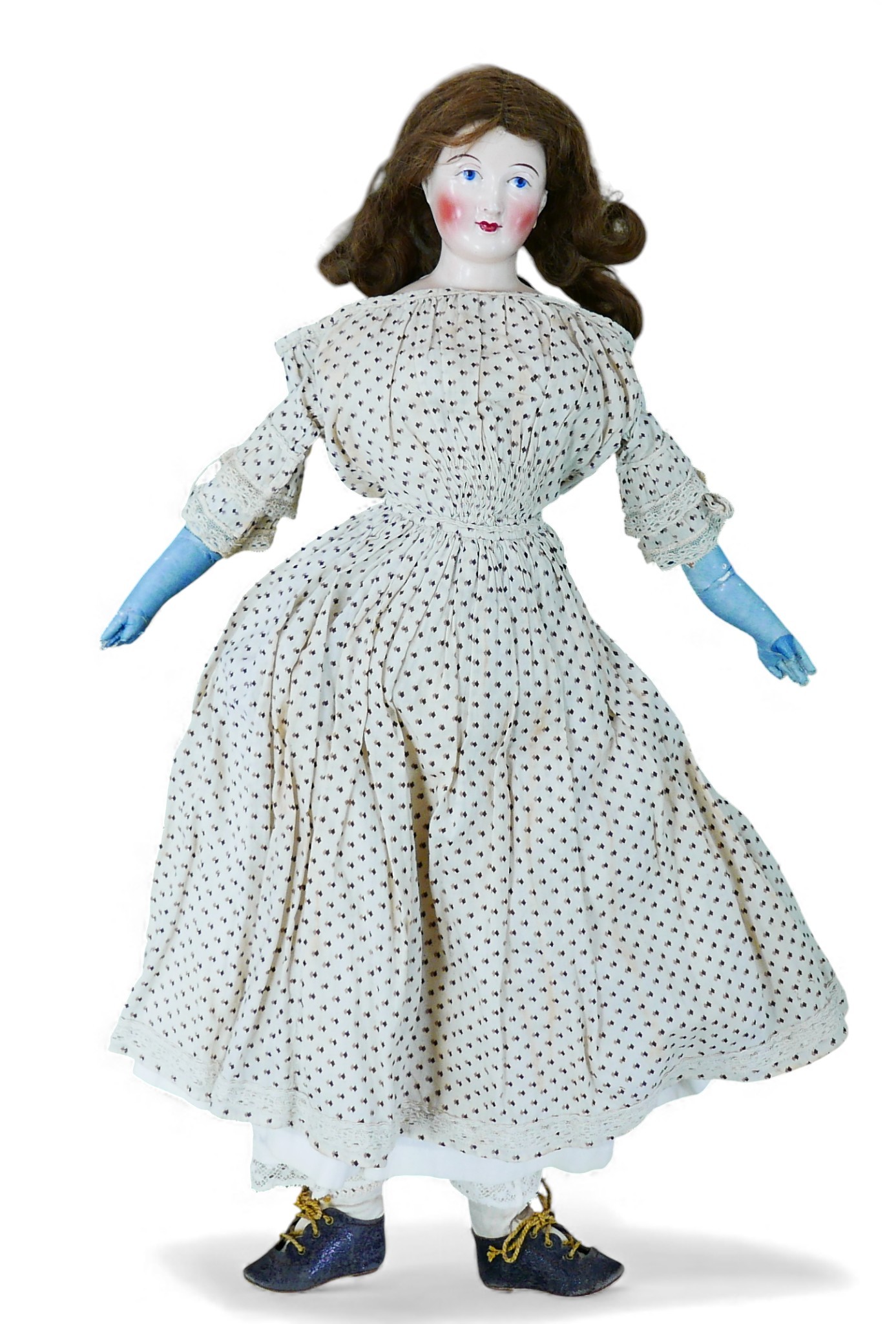 A 19th century German porcelain headed doll, possibly by Lippert & Haas, with hand painted face, and 19th century and later costume, 21 /12" (52cm) high.