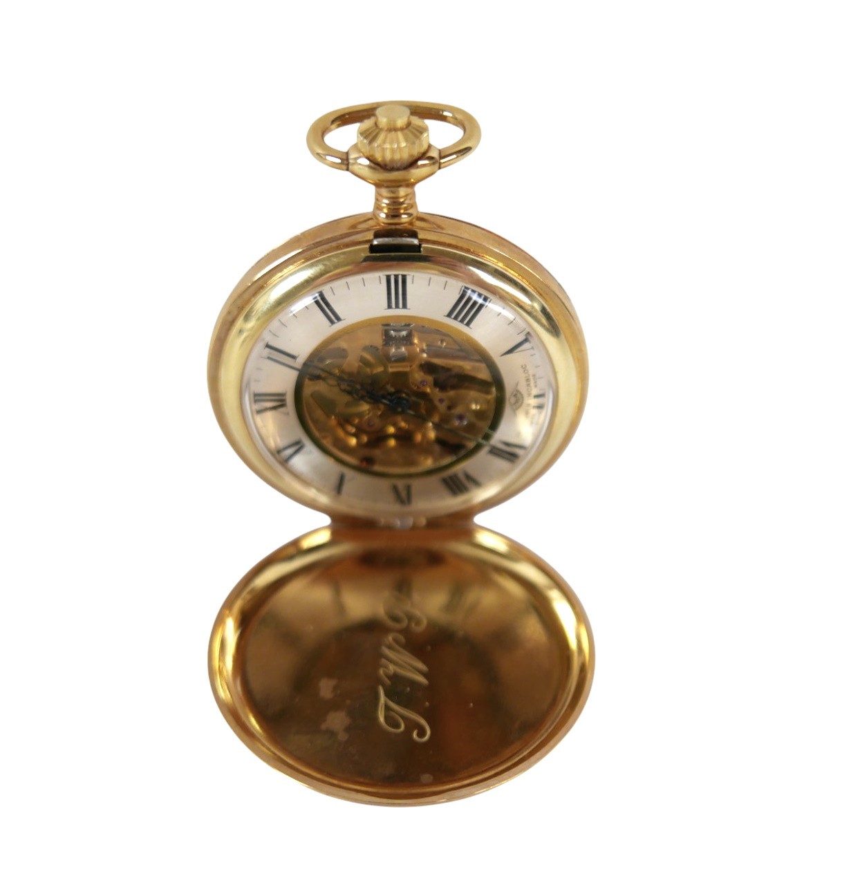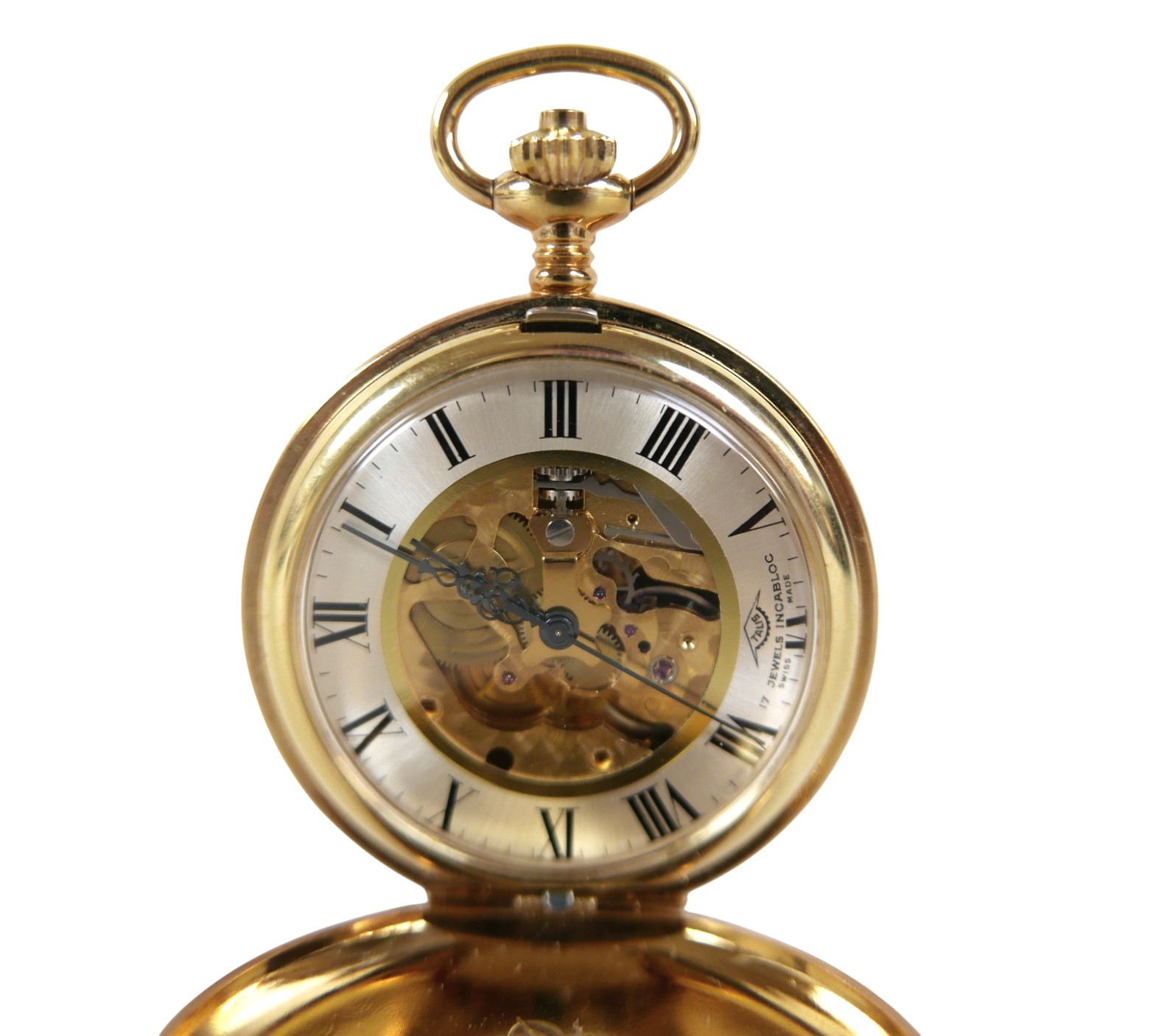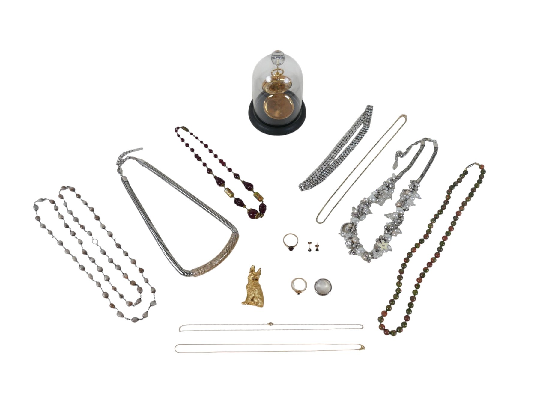 A collection of jewellery comprising two 9ct yellow gold fine chains , a 9ct yellow gold ring size P and a pair of 9ct earrings , total weight 4.0g, assorted costume jewellery, Trifari dog brooch, and a modern hunter watch.