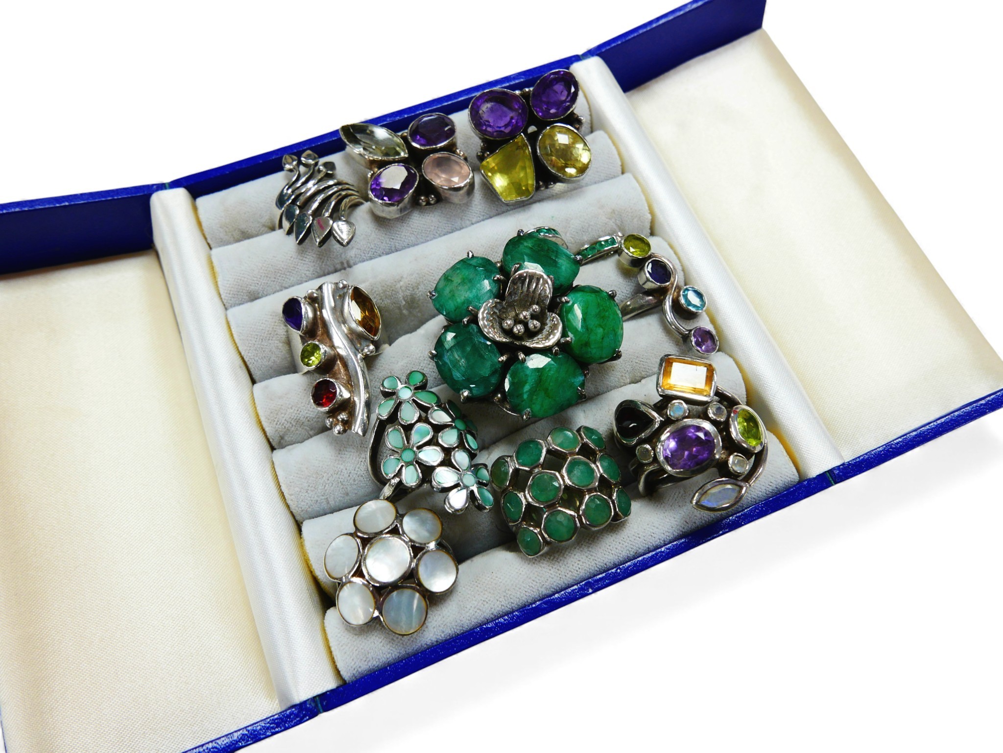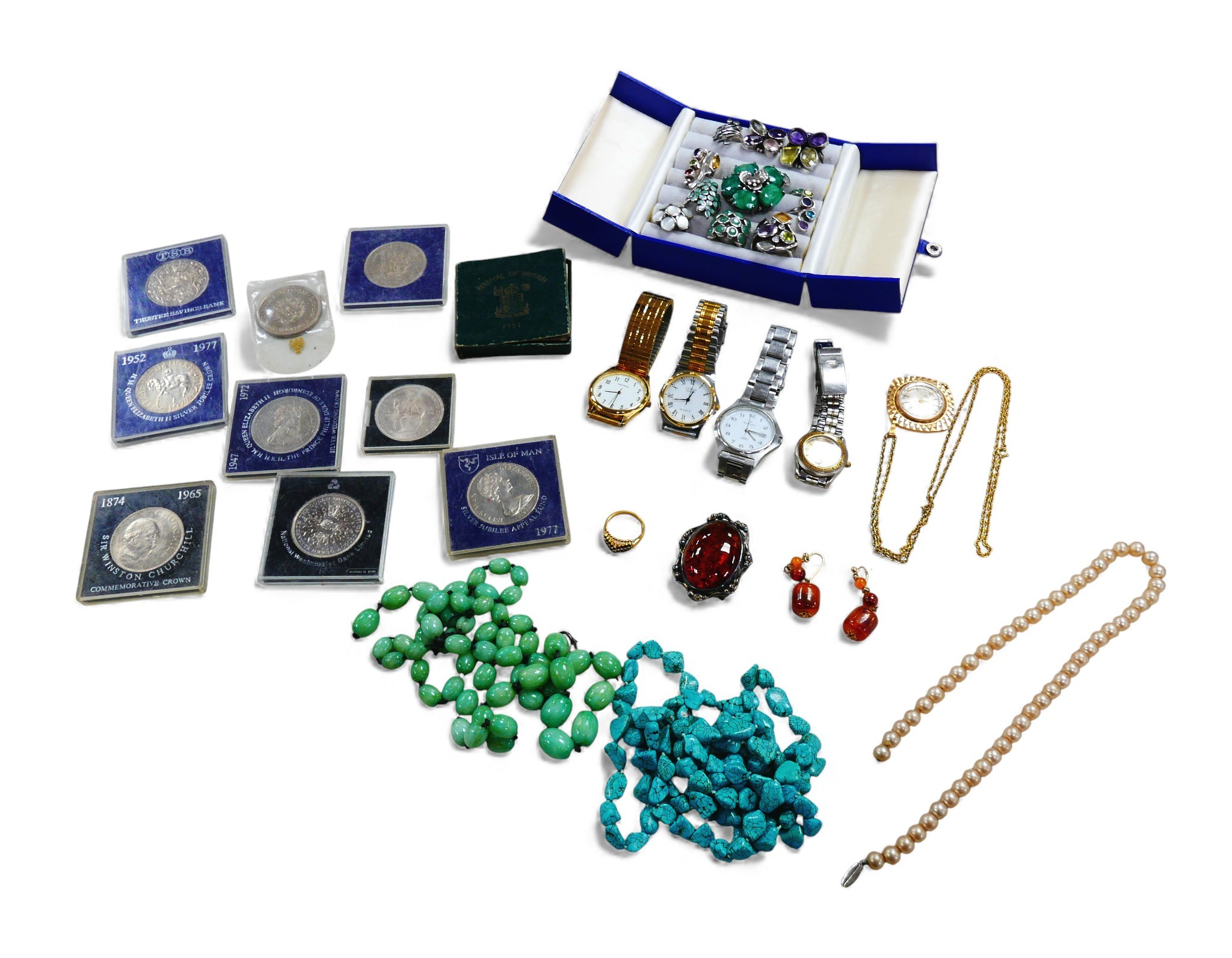 A collection of assorted silver dress rings and costume jewellery, together with a small group of watches and coins. (1 bag)