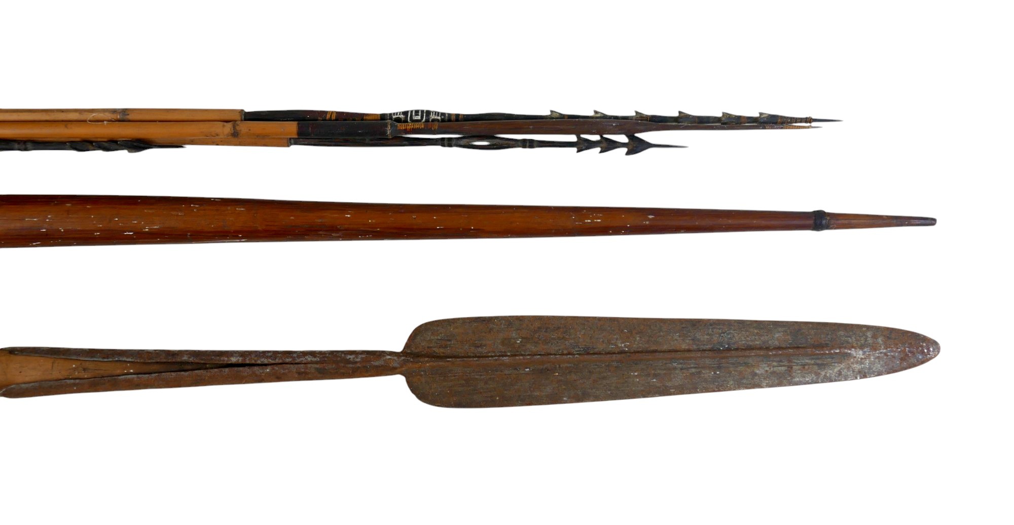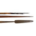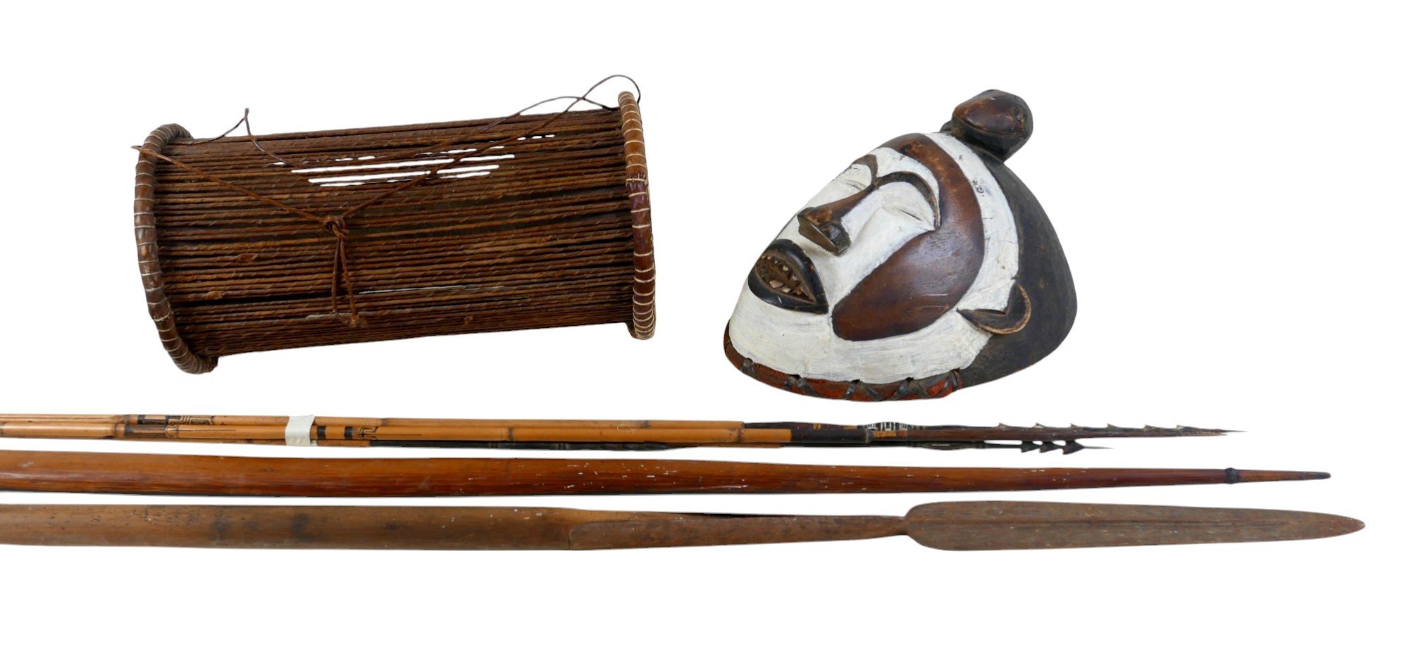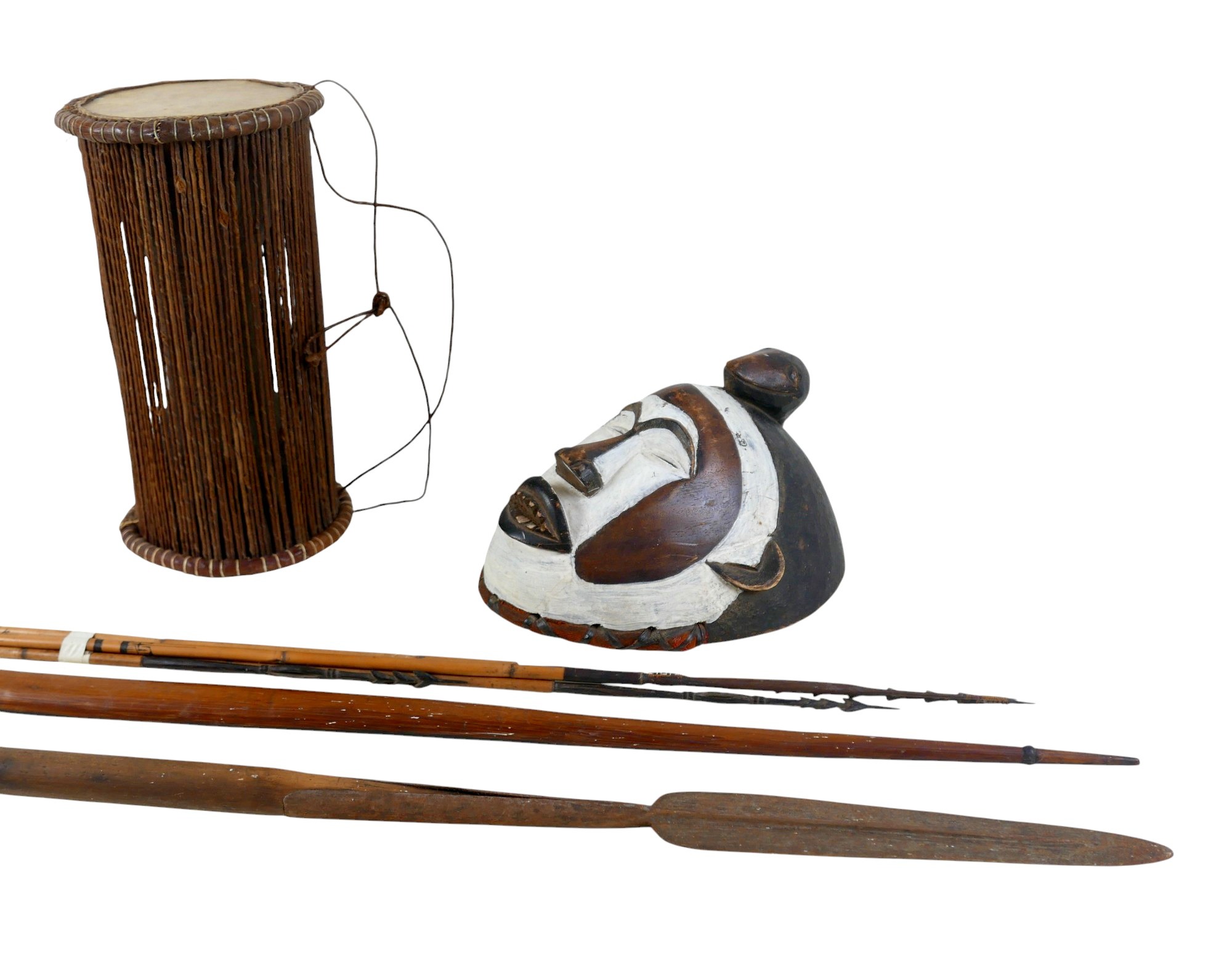 A collection of tribal items comprising drum, mask, spear, bow, and four arrows, one arrow 137cm long(8)