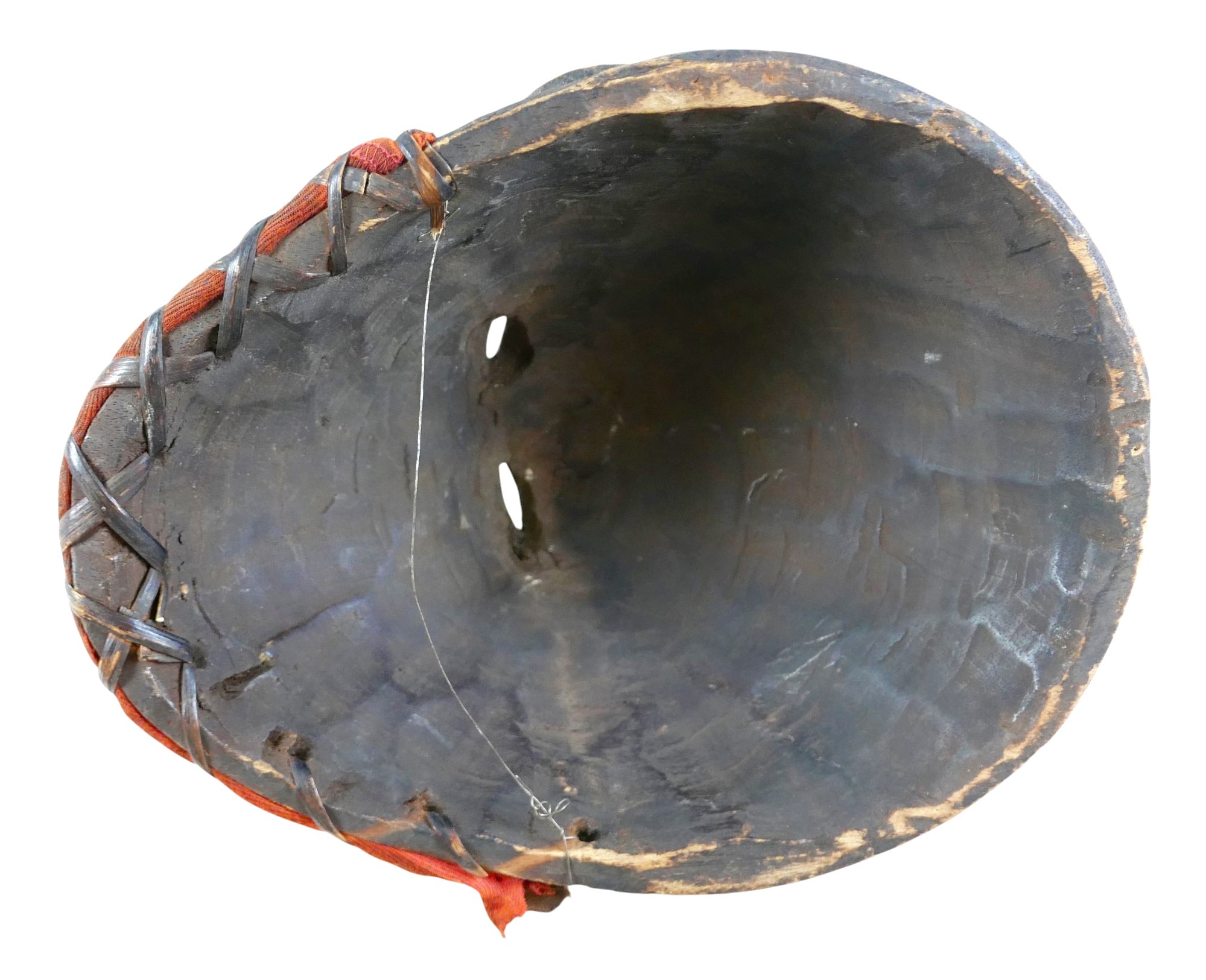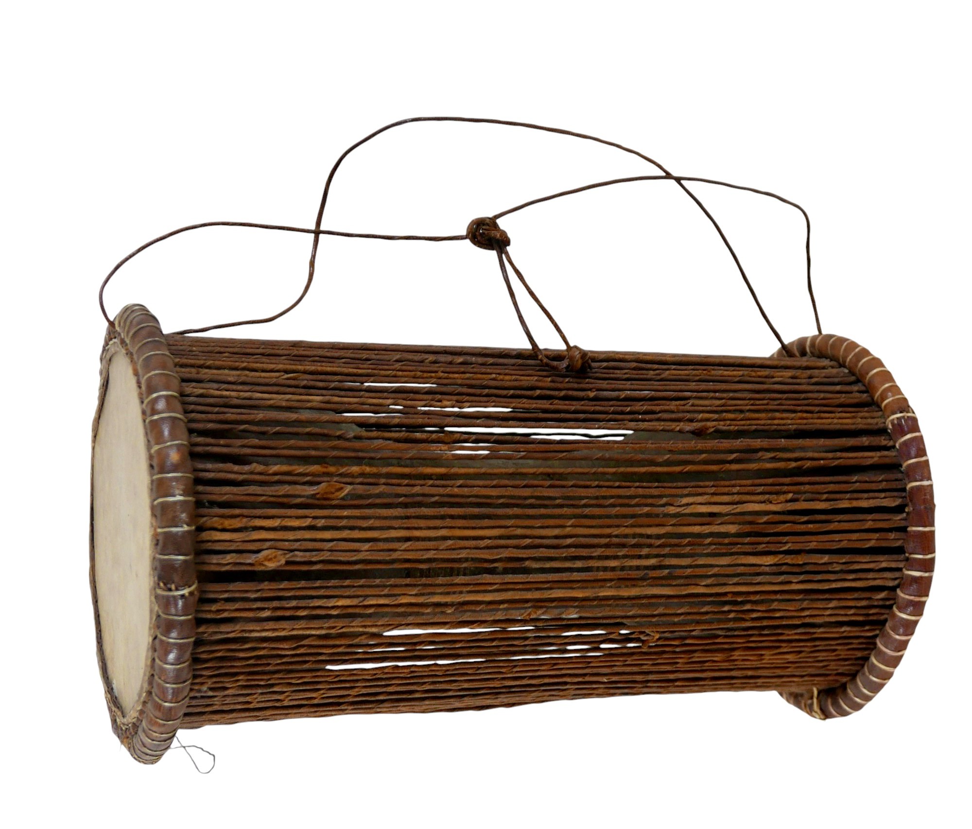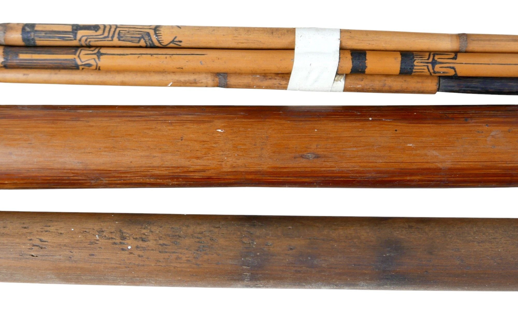 A collection of tribal items comprising drum, mask, spear, bow, and four arrows, one arrow 137cm long(8)