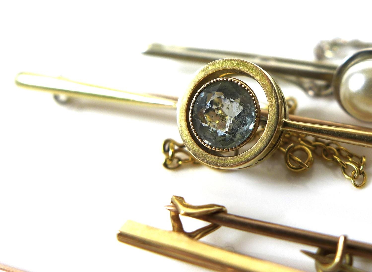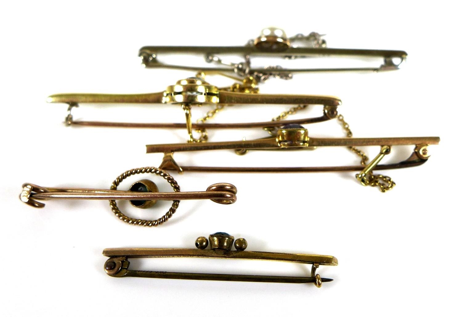A group of five bar brooches, comprising a 15ct gold and aquamarine brooch, 5.1g, an amethyst set brooch, gold unmarked but at least 9ct, 3g, a 9ct gold and turquoise brooch, a 9ct white gold and pearl brooch, 5.1g together, and a yellow metal brooch set with a black stone. (5)
