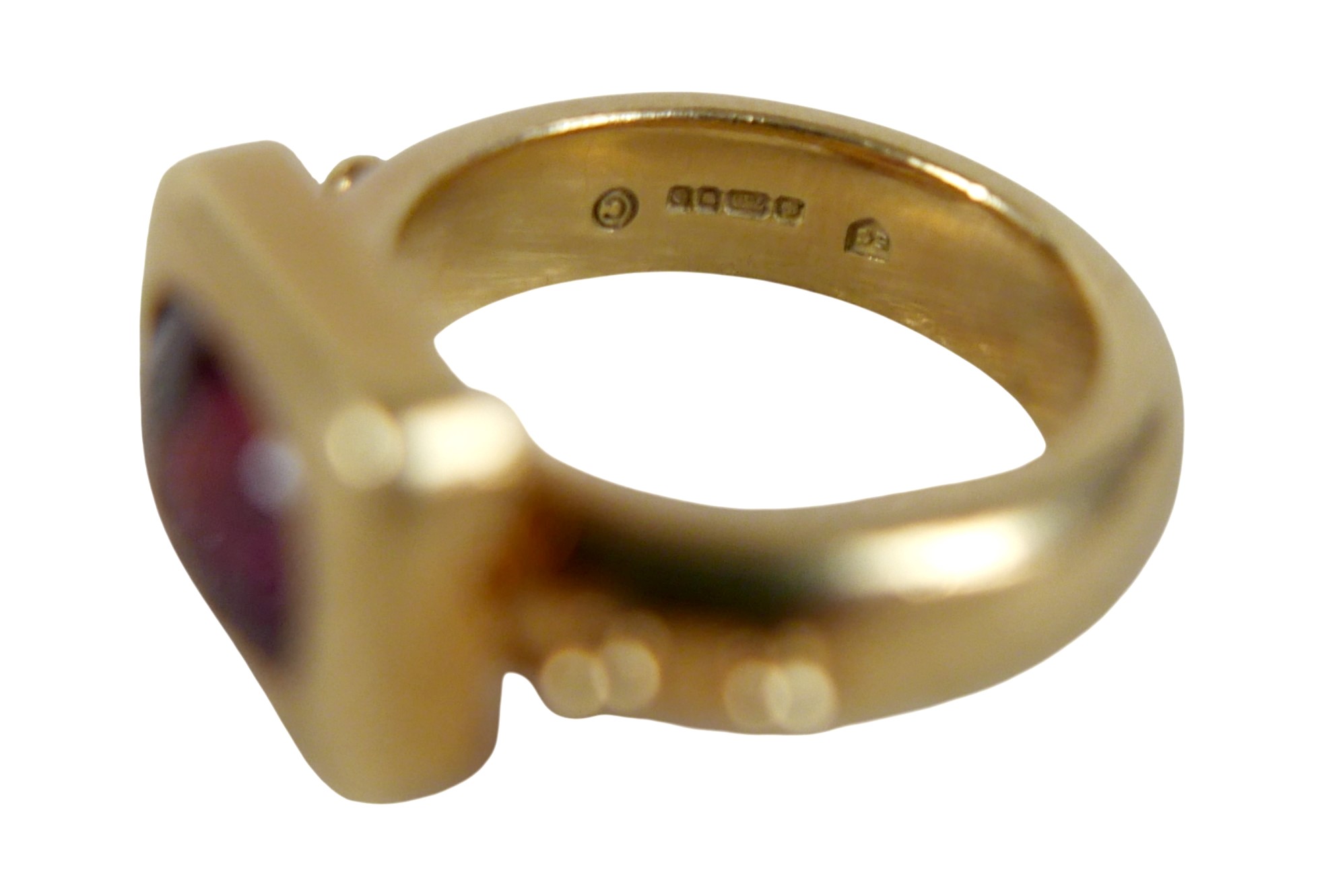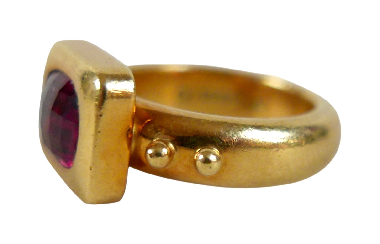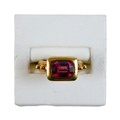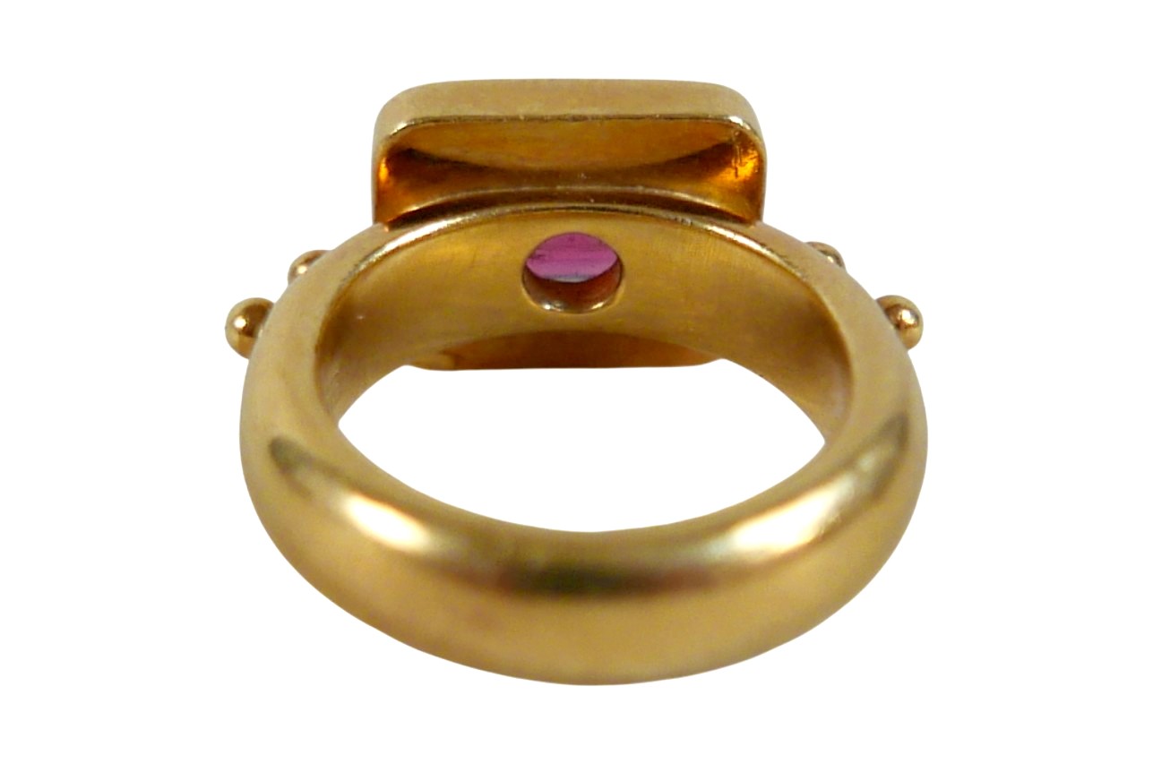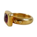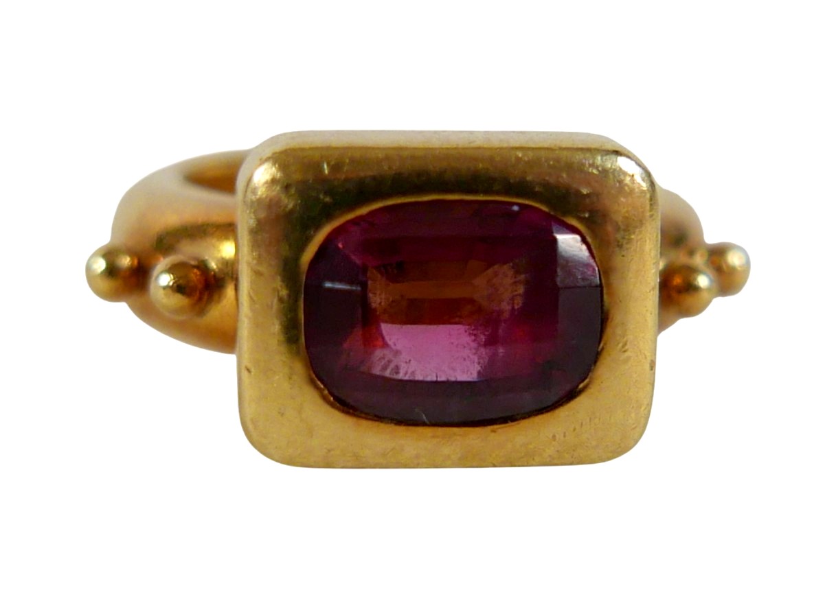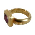 Elizabeth Gage: an 18ct yellow gold "Valois" pinkie ring, set with a rhodolite garnet, head size 9 by 11.5 by 3.5mm, size G, 10.6g.