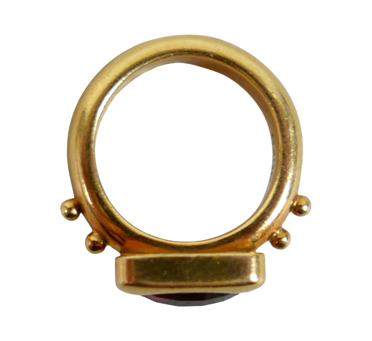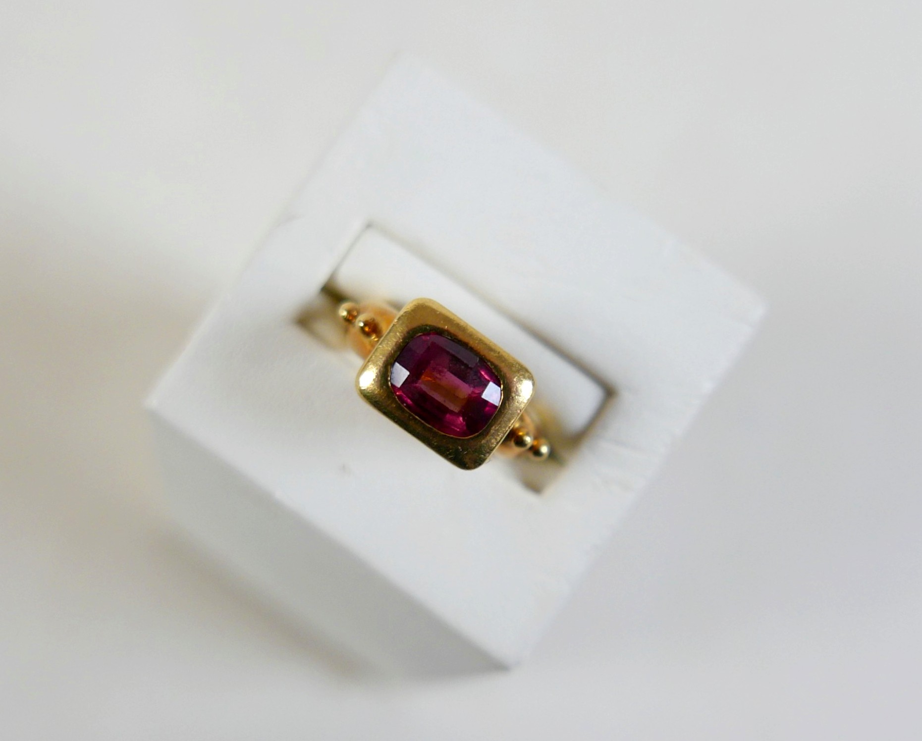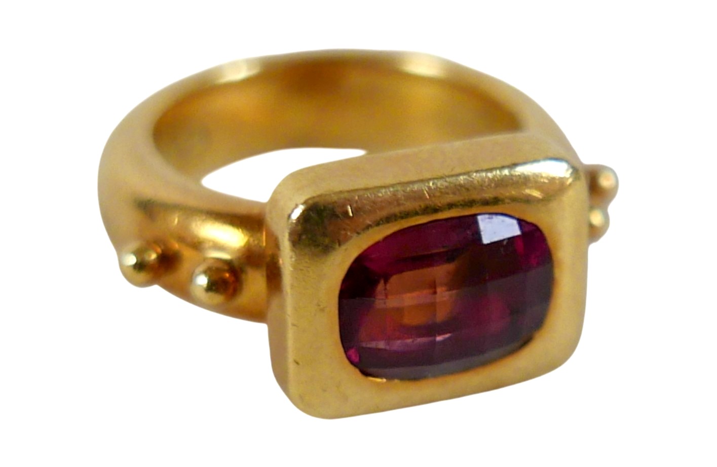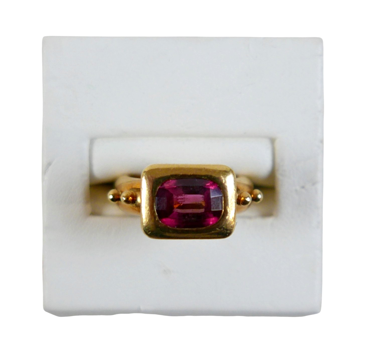 Elizabeth Gage: an 18ct yellow gold "Valois" pinkie ring, set with a rhodolite garnet, head size 9 by 11.5 by 3.5mm, size G, 10.6g.