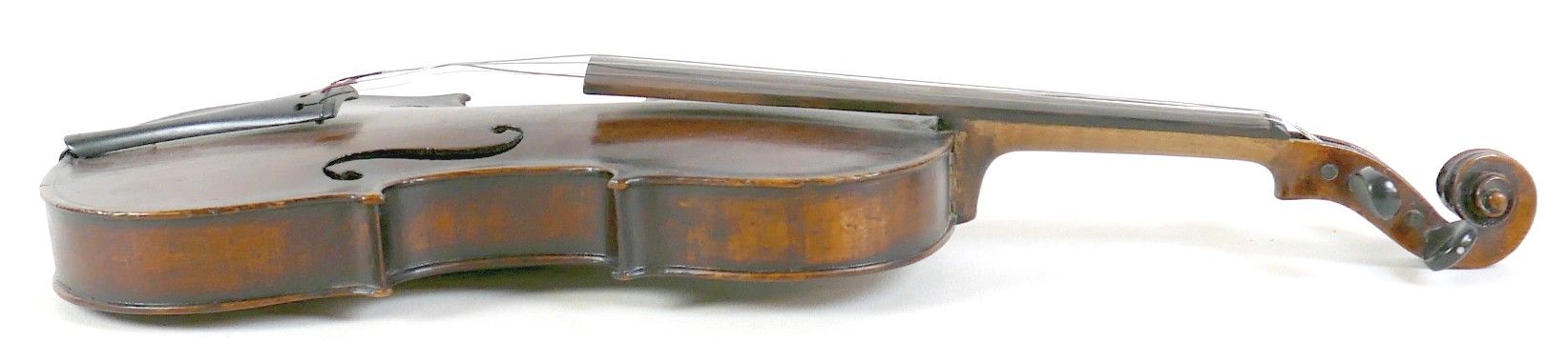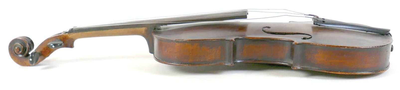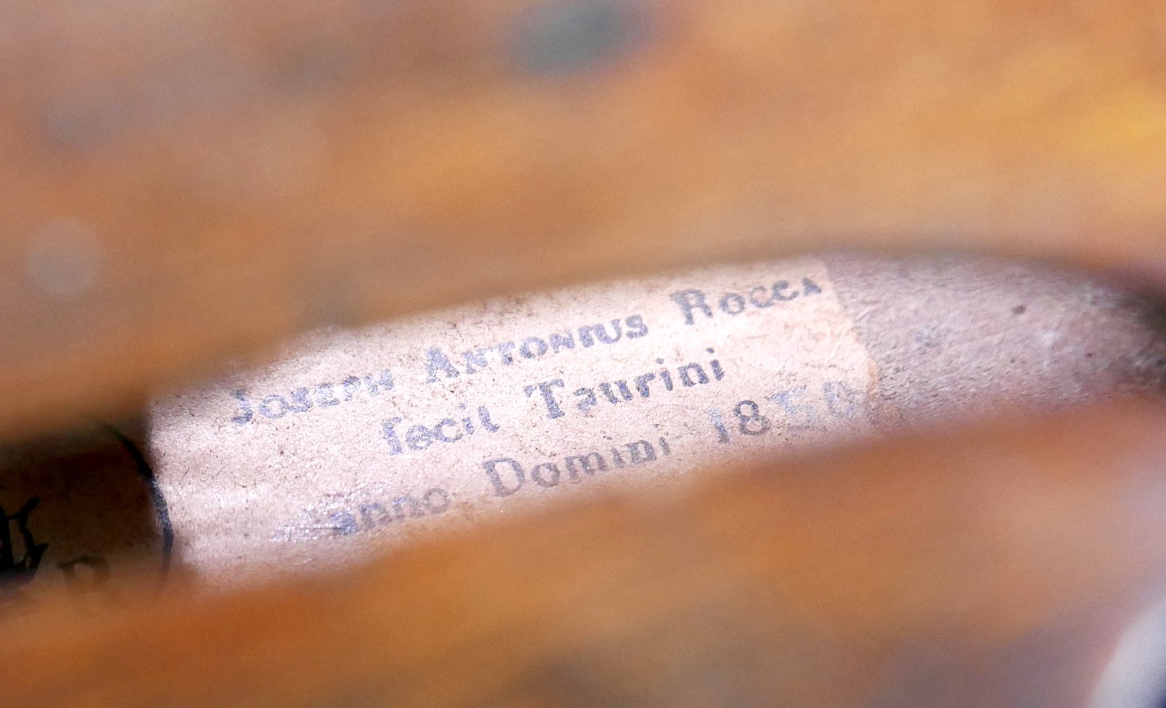 A 19th century violin, bearing label 'Joseph Antonius Rocca fecit Taurini anno Domini 1850', with a 14 inch two piece back.