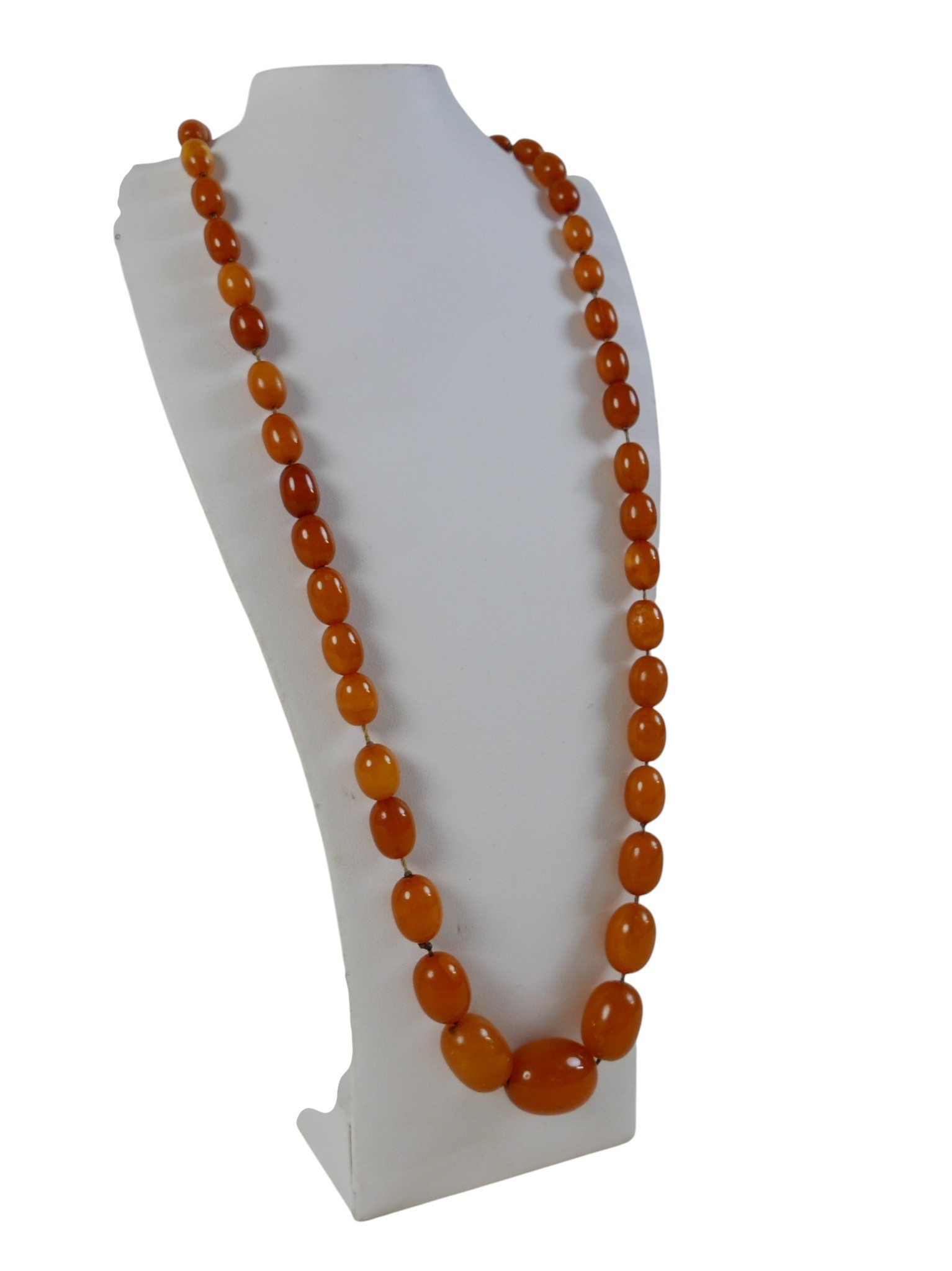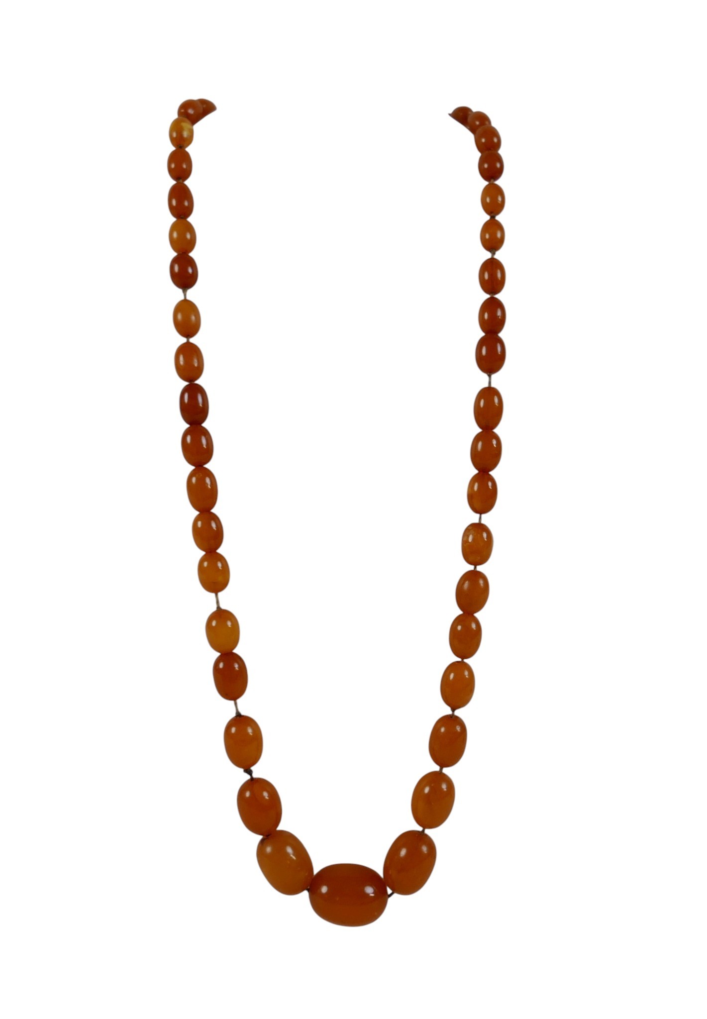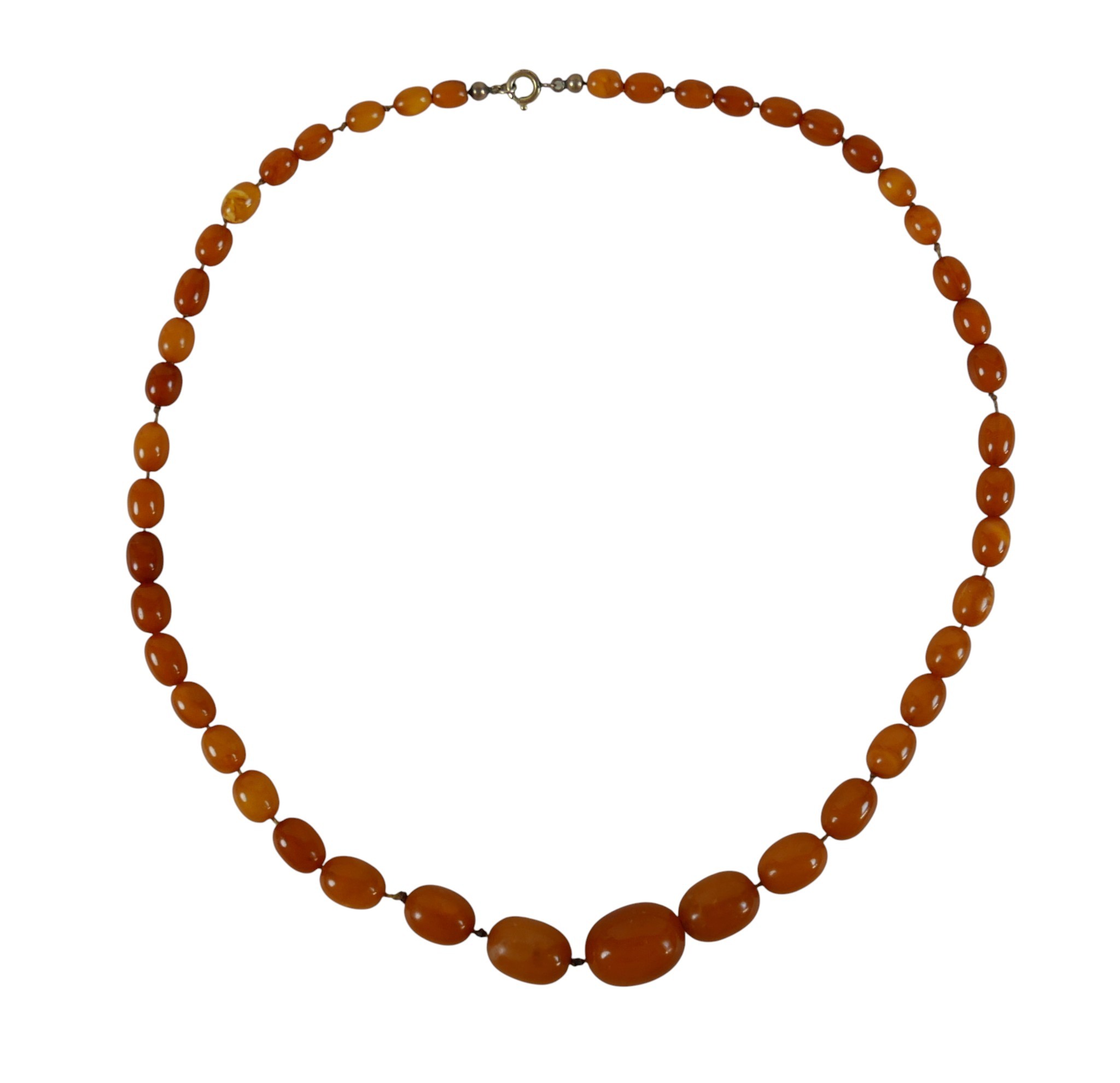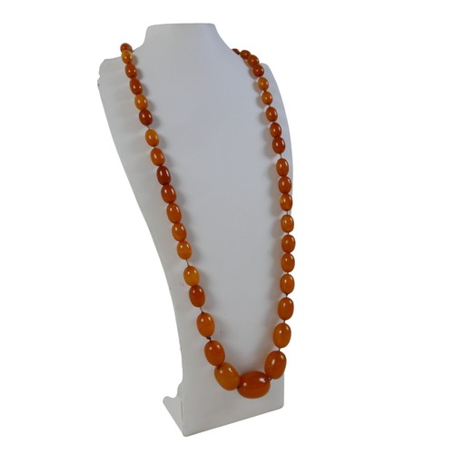 A butterscotch amber bead necklace, of forty five graduating beads, largest bead 22.0 by 16.8mm, smallest 8.5 by 6.4mm, with gold plated bolt ring clasp, 60cm long, 28.2g.