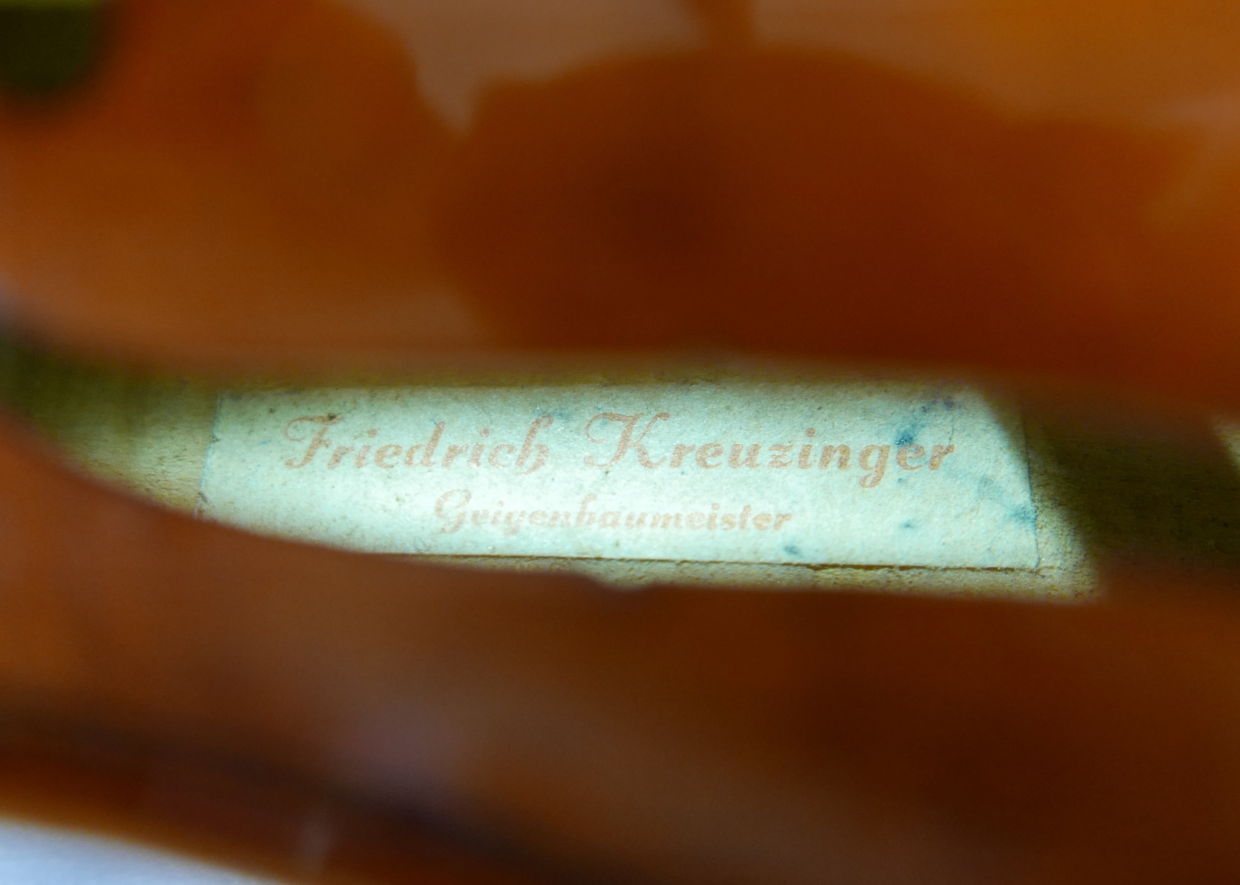 A 20th century German violin, set up by Guiviers, labelled for 'Freidrich Kreuzinger', two piece back, 35.3.cm / 13 7/8" long, 58.5cm long overall, in a black hard carry case.