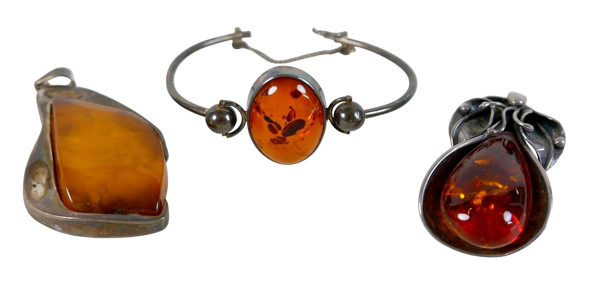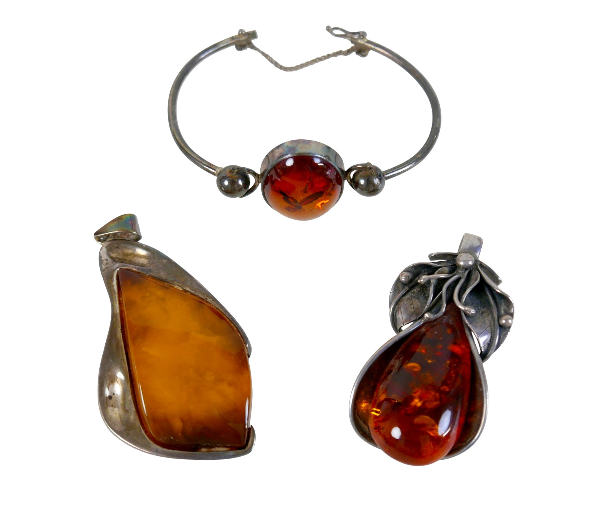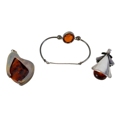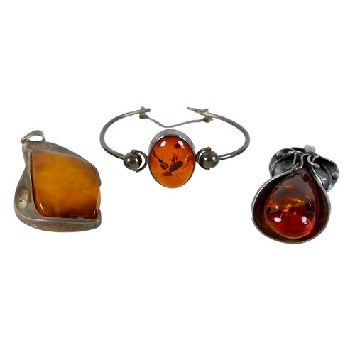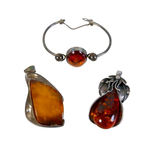 Two large silver and amber pendants and an amber bangle largest pendant 4 by 1 by 8cm high.(3)