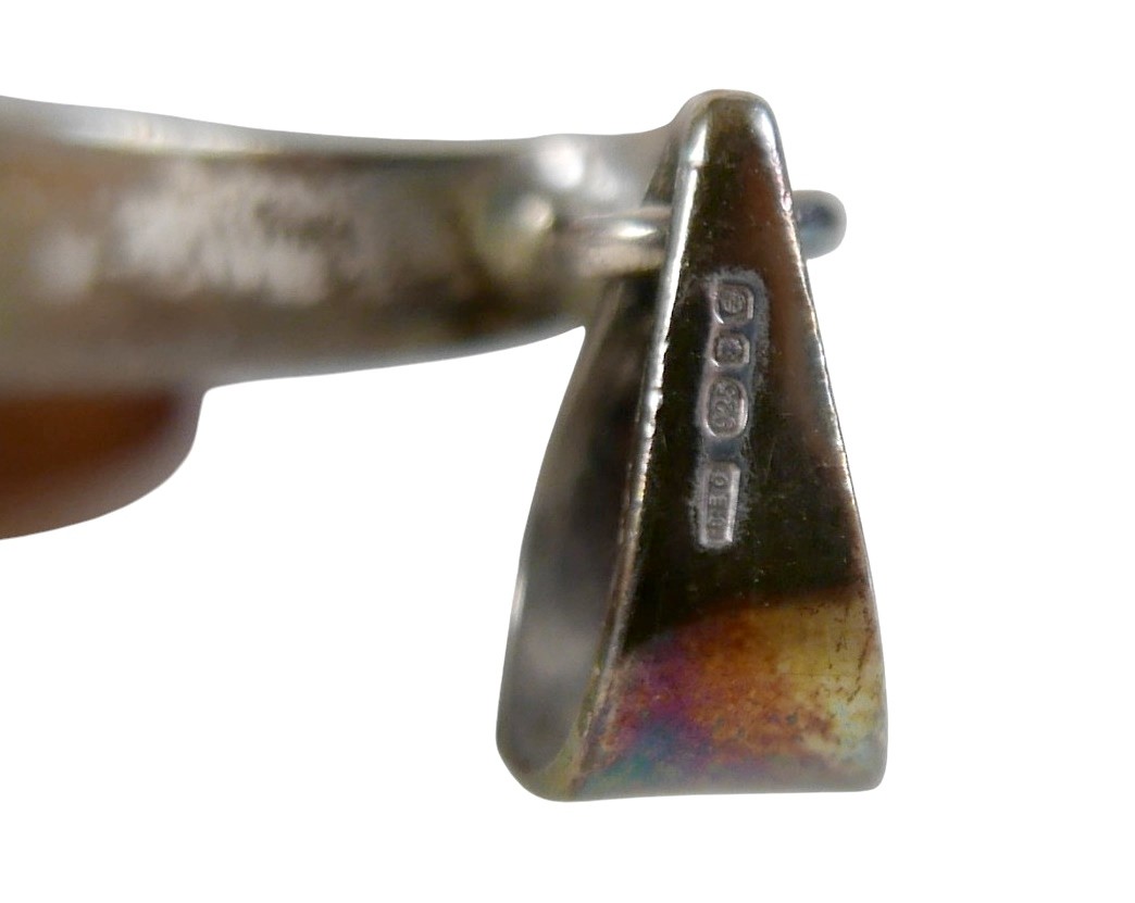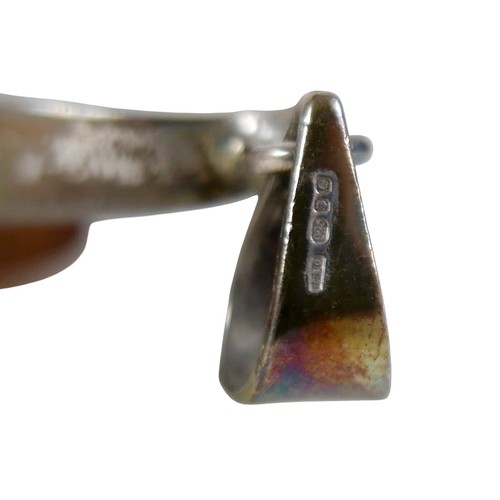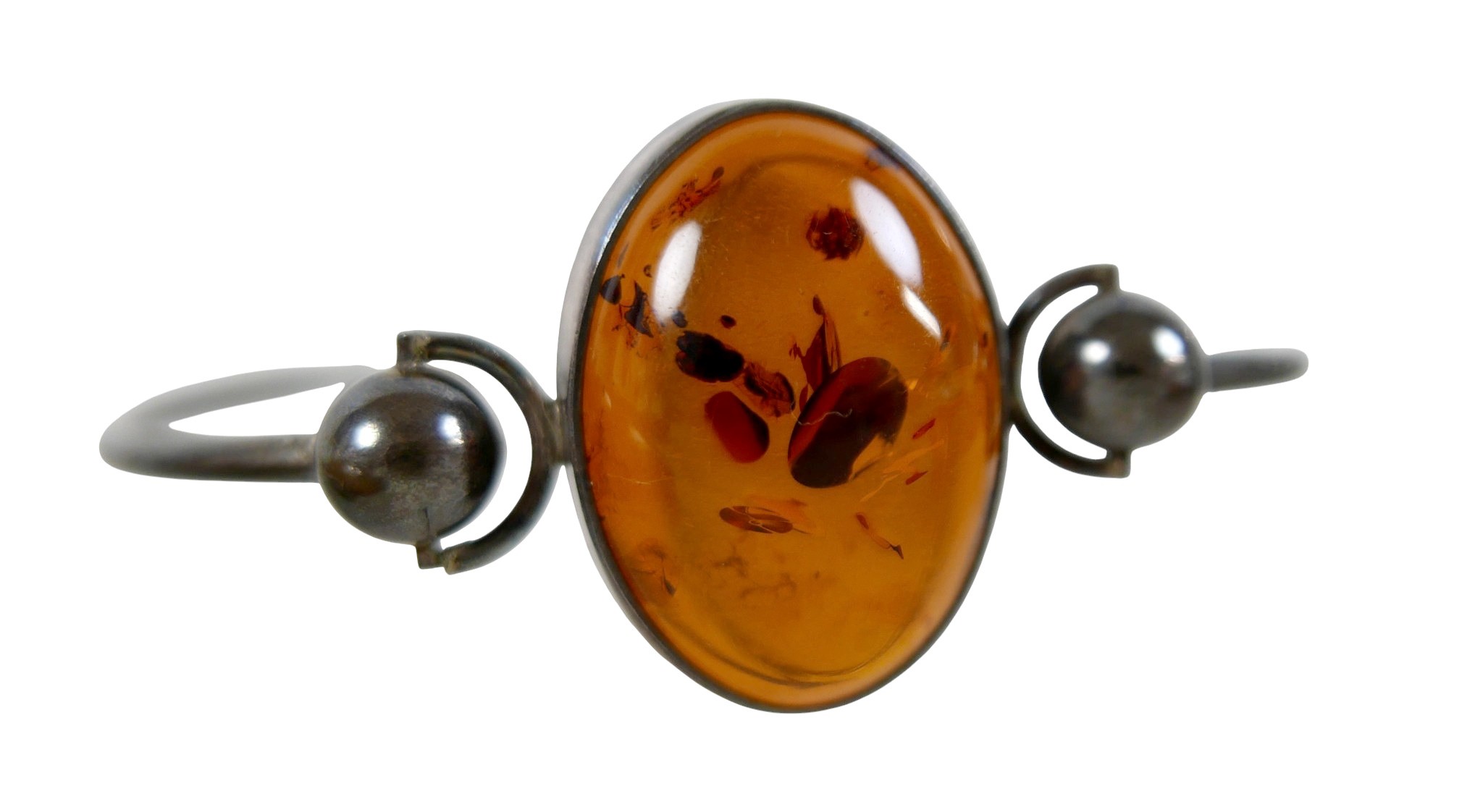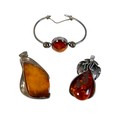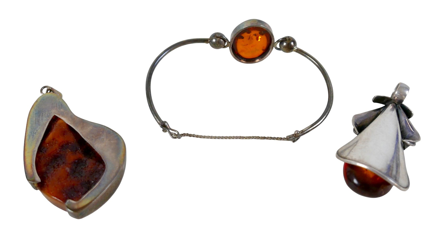 Two large silver and amber pendants and an amber bangle largest pendant 4 by 1 by 8cm high.(3)