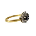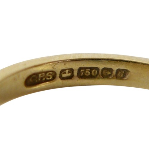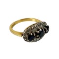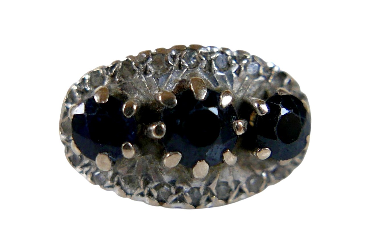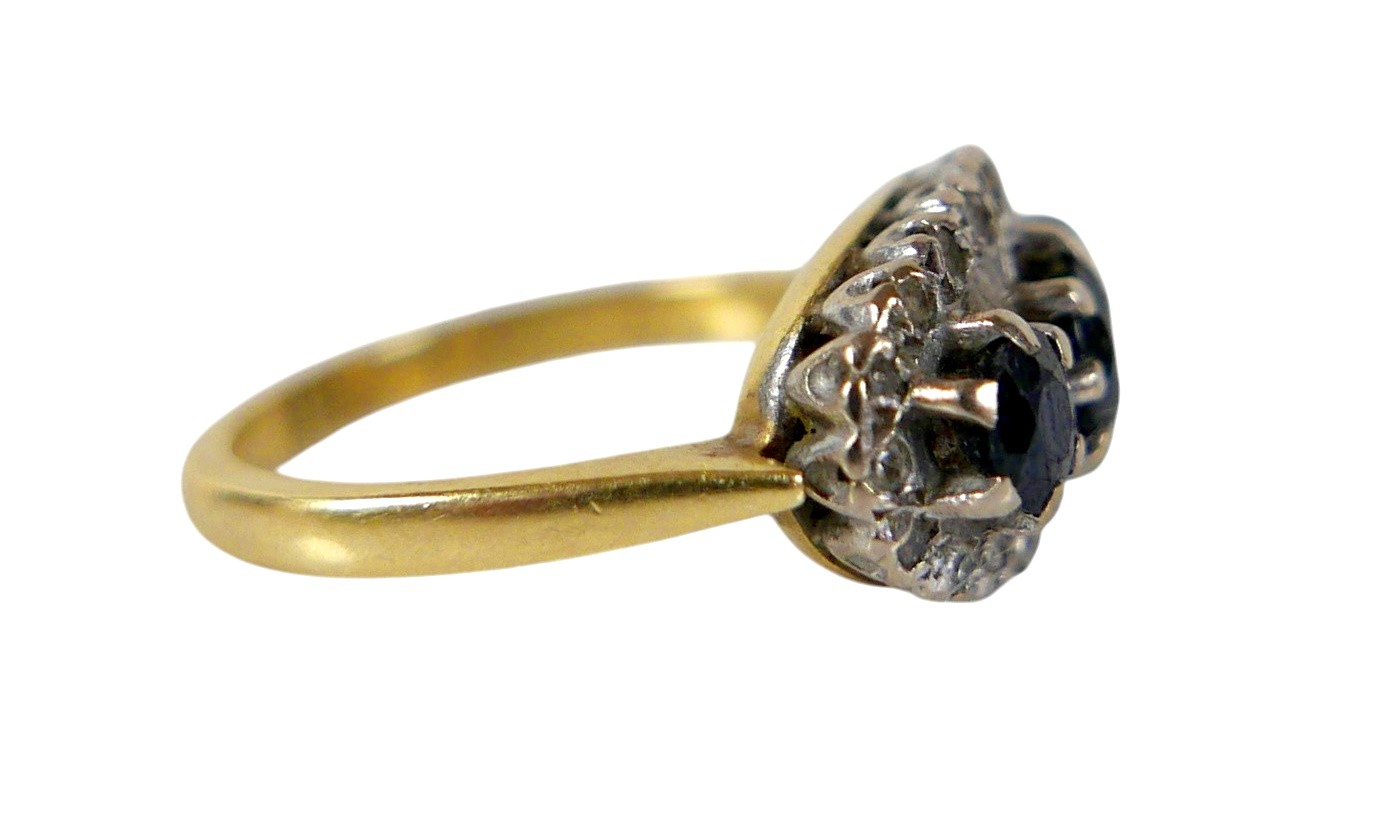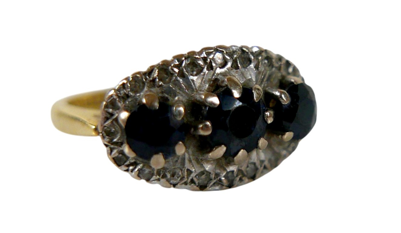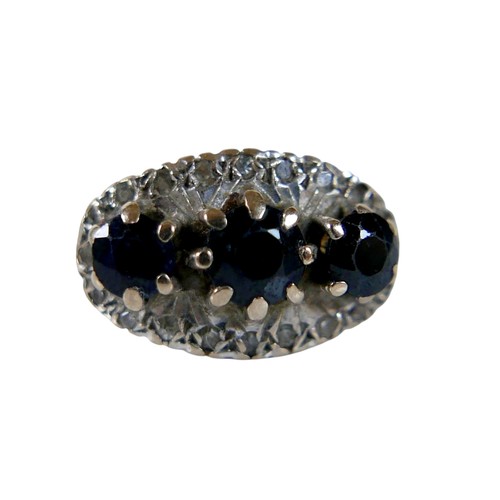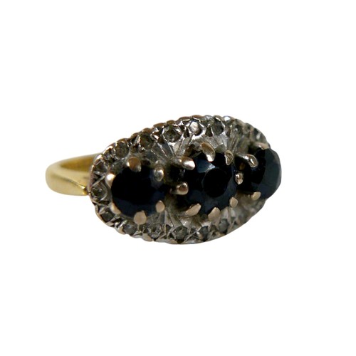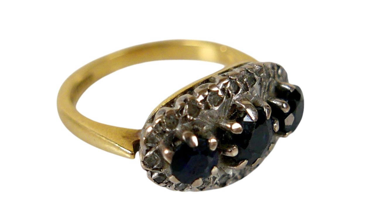An 18ct gold three stone blue sapphire ring, central stone approximately 5mm diameter, flanked by two 4mm diameter stone, size L, 5.7g.