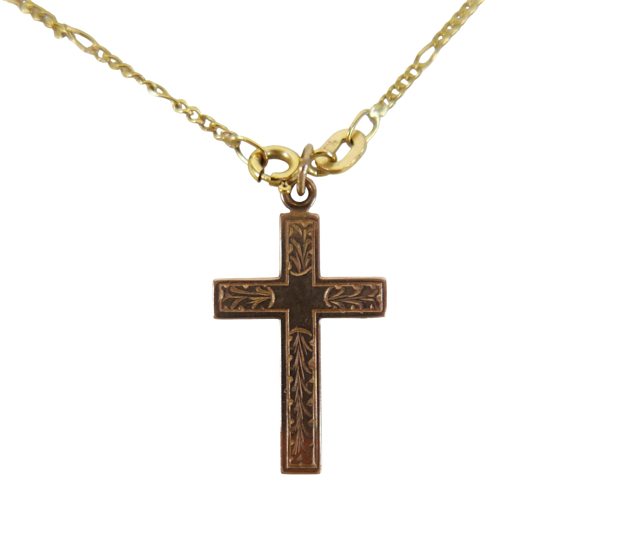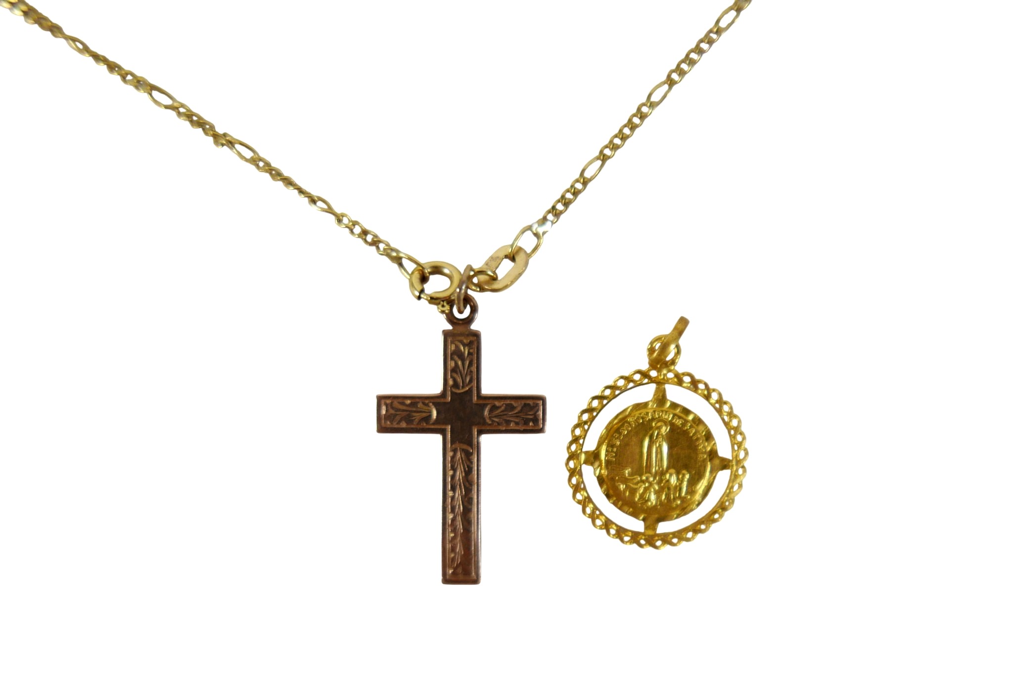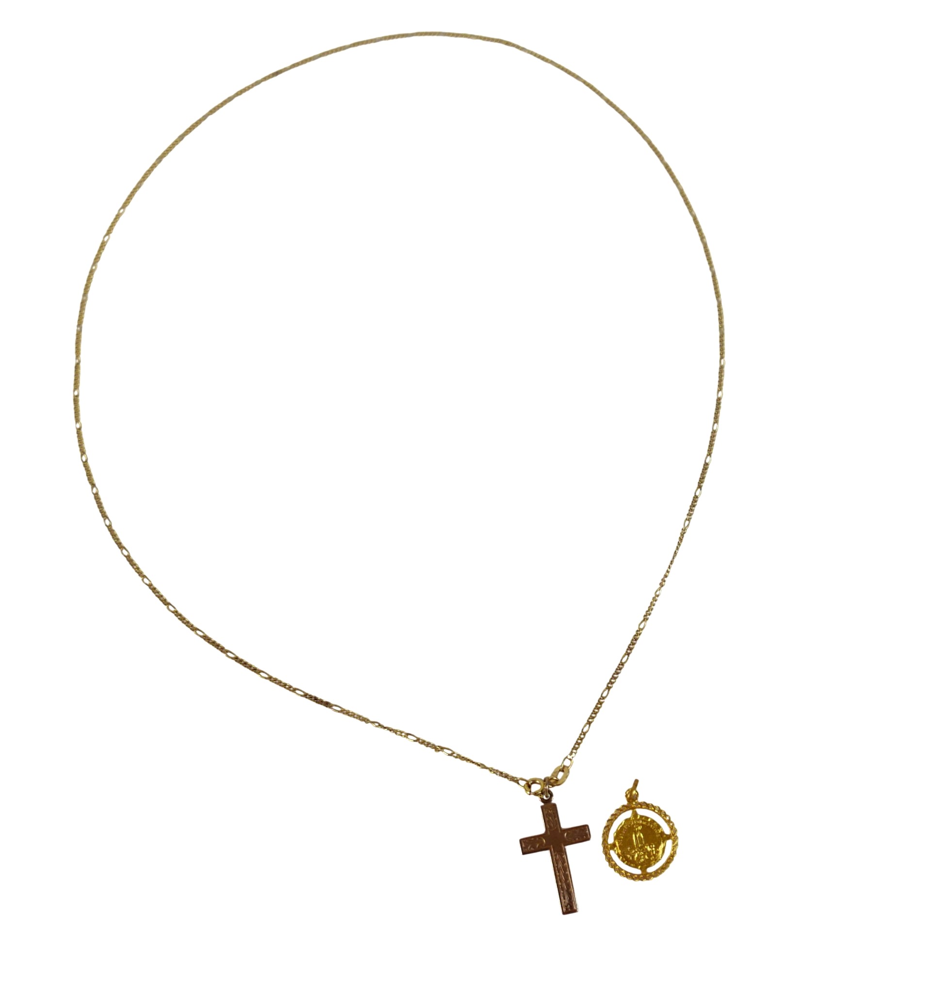 A 9ct yellow gold crucifix on chain and an 18ct St Christopher pendant, 9ct weight 3.8g, 18ct weight 0.9g.(3)