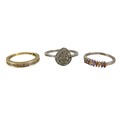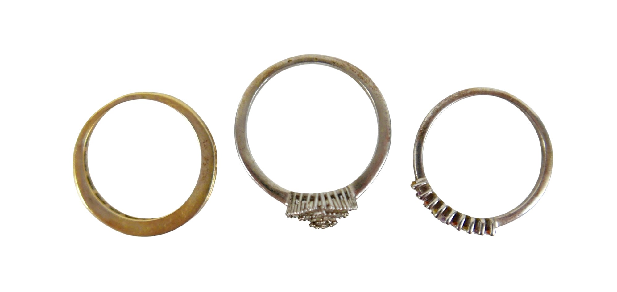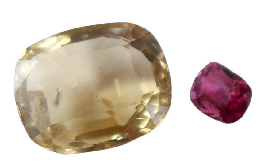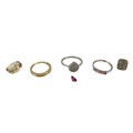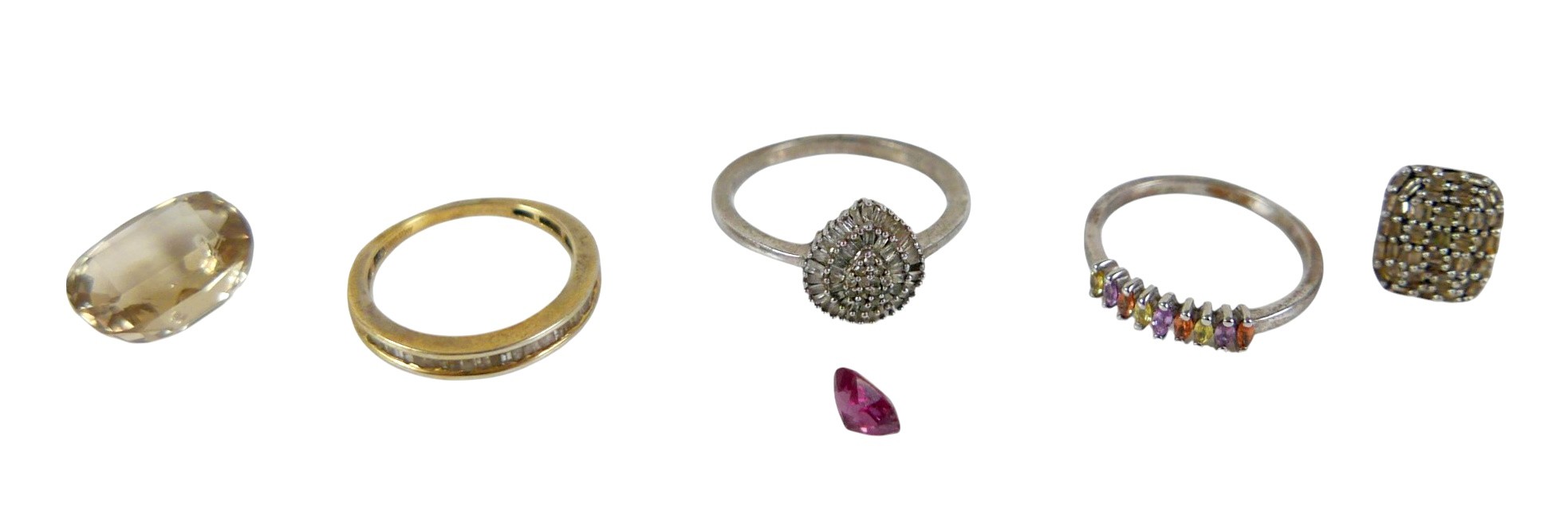 A collection of diamond and moissanite silver jewellery, including two rings and an earring, together with a nine stone multi-coloured sapphire silver ring, size N/O, 1.6g, as well as two loose stones, a cushion cut smoky quartz, 1.1mm by 1.4mm, and a red stone. (1 bag)